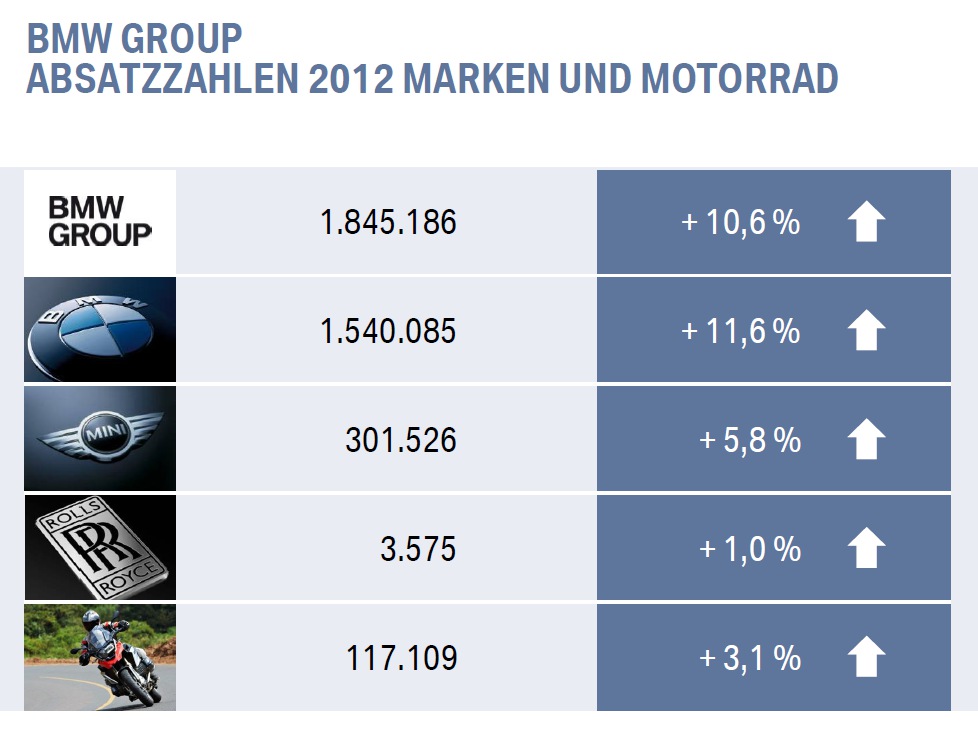 Im Rahmen des Rückblicks auf das erfolgreiche Jahr 2012 hat sich die BMW Group auch zu den Zielen für 2013 geäußert und sich dabei vorsichtig optimistisch gezeigt. Nach den Rekordjahren 2011 und 2012 soll 2013 in Sachen Absatz das dritte Rekordjahr in Folge werden – auch dank neuer Produkte wie dem BMW 3er GT, dem MINI Paceman oder dem Rolls-Royce Wraith.