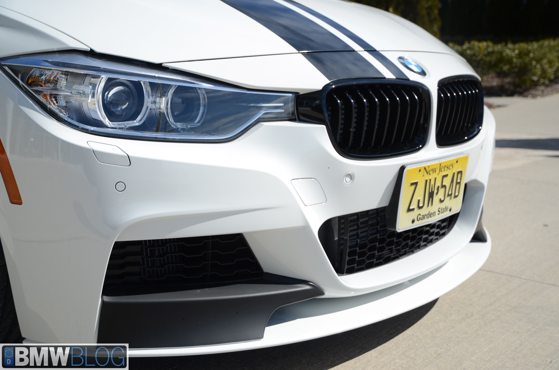 Die schwarzen Spoiler-Aufsätze an der Front passen für alle F30 mit M Sportpaket, dazu kommen passende Seitenschweller, schwarze Nieren, BMW Performance-Zierstreifen und natürlich große Leichtmetallräder mit dunklem Finish.