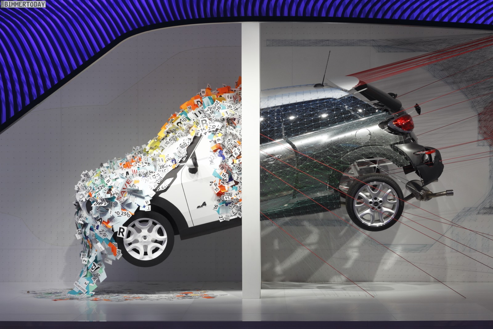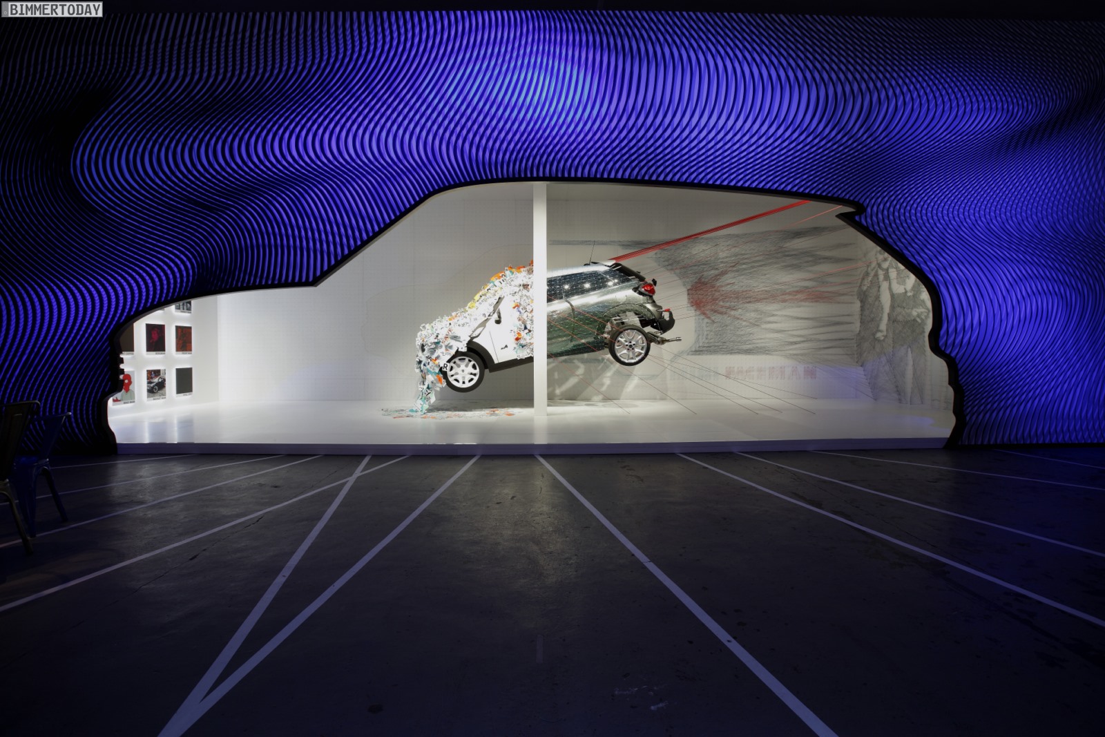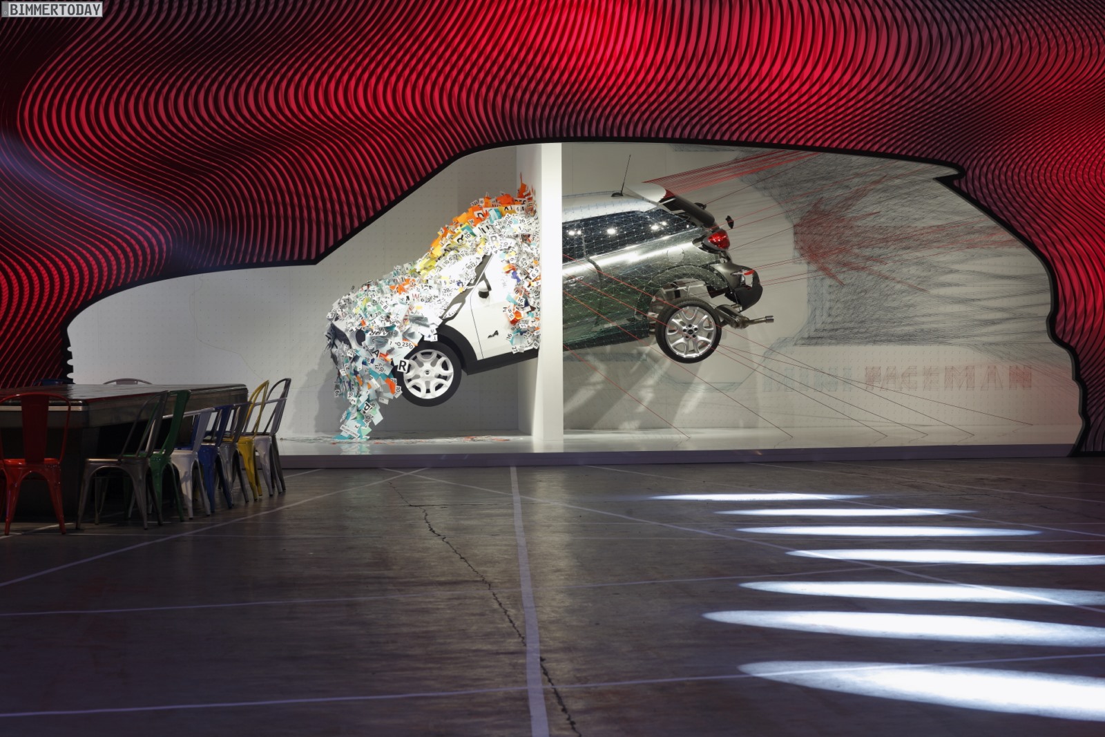 Die dynamische Skulptur ist in zwei Hälften geteilt und zeigt einen MINI Paceman dabei, wie er gerade räumliche Grenzen durchbricht und dabei eine Transformation von Materialien und Formen erlebt. Das dabei entstehende Geräusch kann man sich nach Ansicht des MINI Design-Teams rund um Anders Warming in etwa wie folgt vorstellen: KAPOOOW!