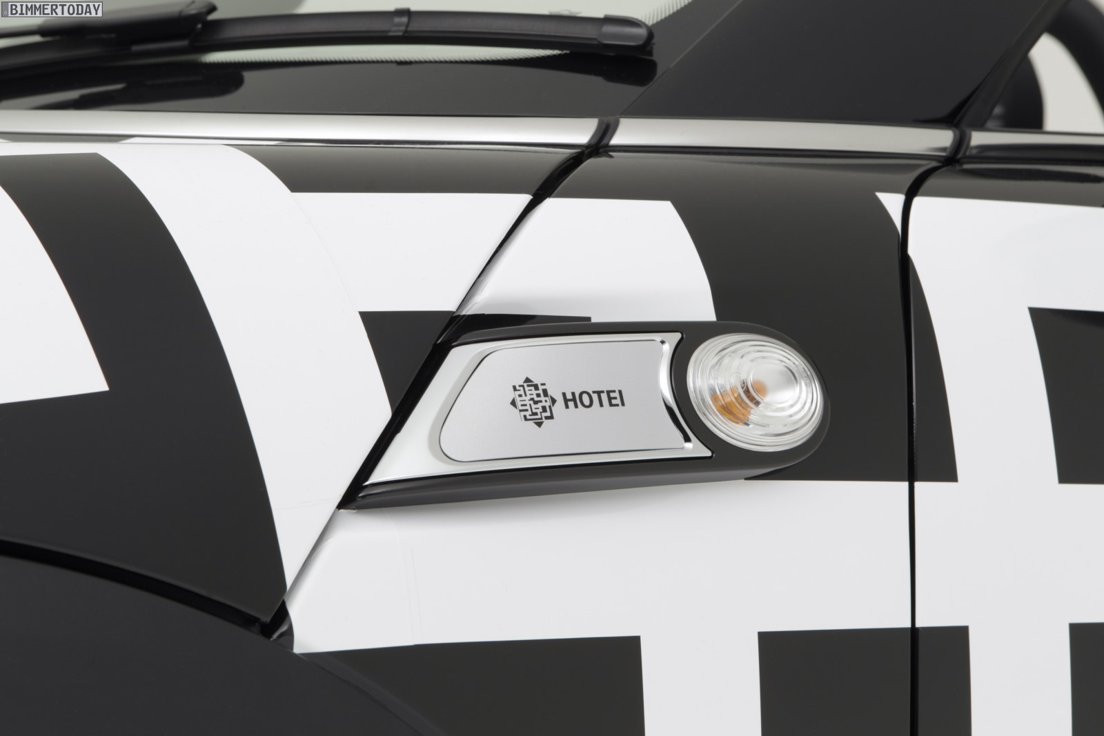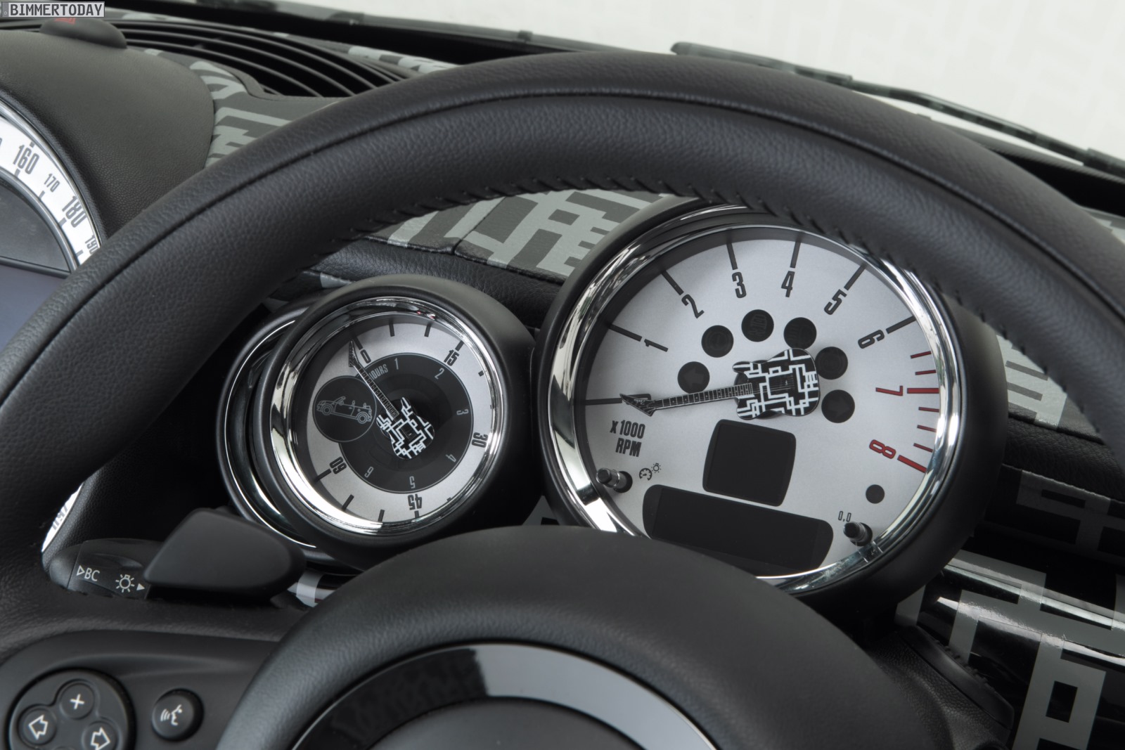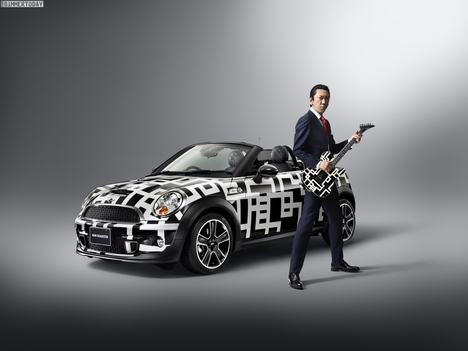 Tomoyasu Hotei genießt in Japan große Beliebtheit und ist unter anderem für seine Liebe zur Gitarre bekannt, was auch im Innenraum und speziell an den Zeigern der Rundinstrumente der von ihm bearbeiteten MINIs unübersehbar ist. Viele Details wie Noten auf den Einstiegsleisten passen ebenfalls in dieses Bild.