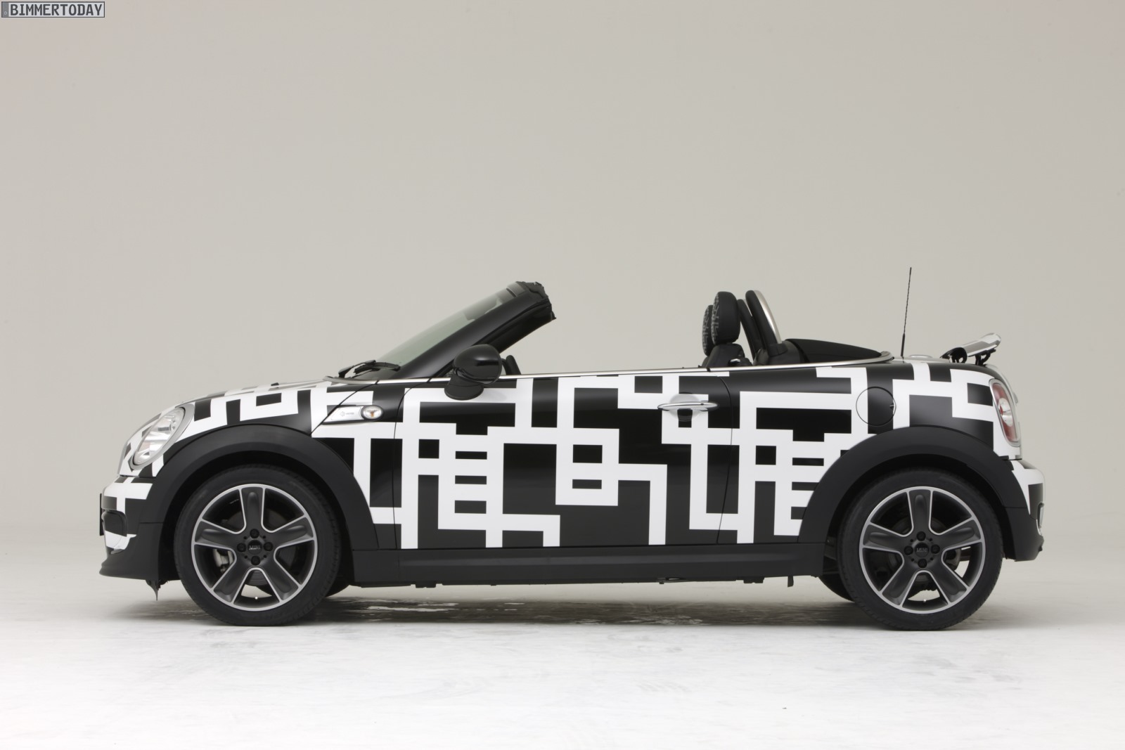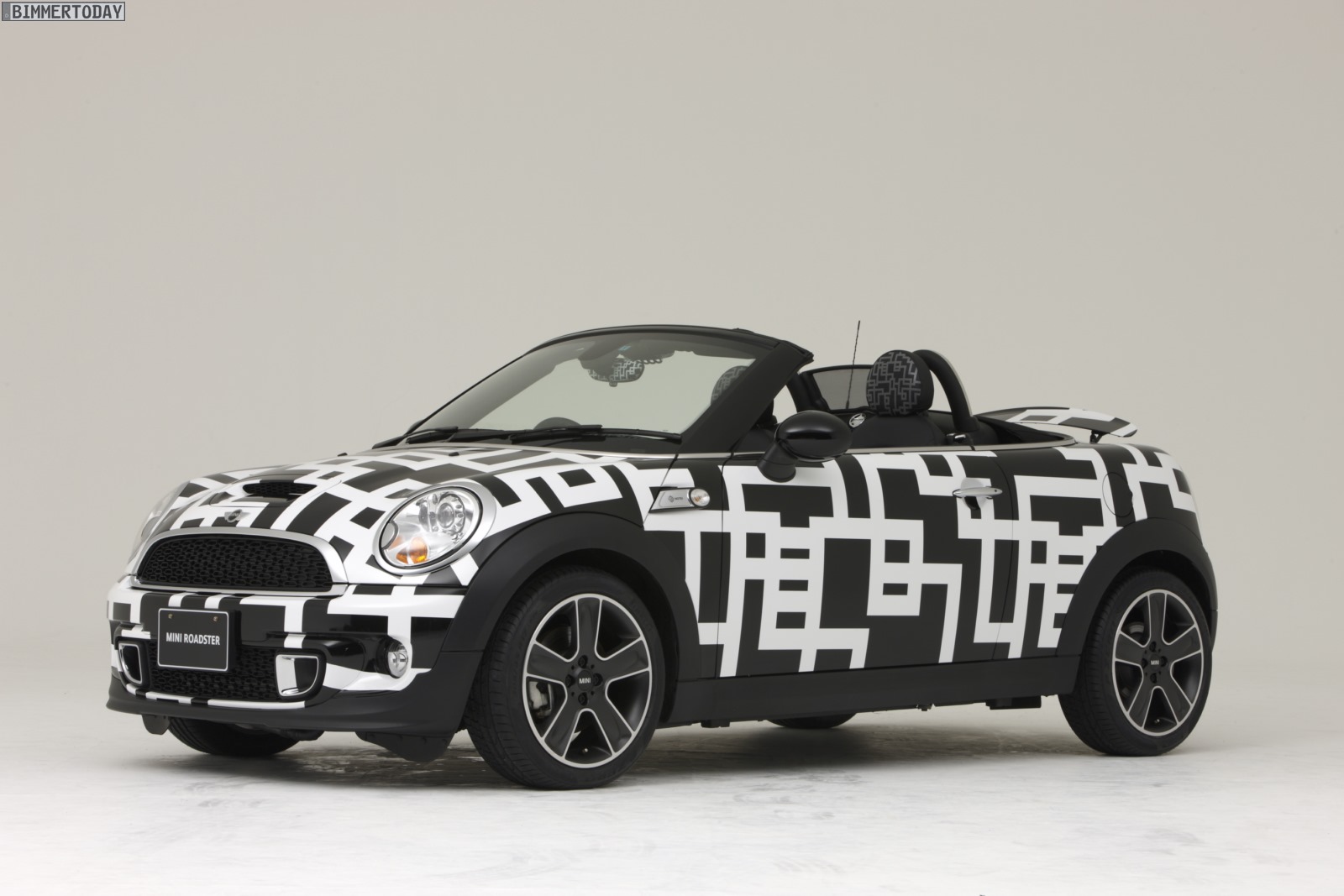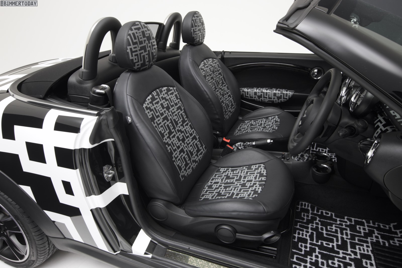 Noch auffälliger als das rot-schwarz designte MINI Coupé ist das MINI Art Car von Tomoyasu Hotei auf Basis des zweisitzigen Roadster, der als Cooper S zur rollenden Leinwand wurde. Die schwarz-weiße Musterung ziert dabei nicht nur das Exterieur, sie setzt sich auch im Innenraum in unverminderter Schärfe fort und findet sich selbst an der Rückseite des Innenspiegels wieder.
