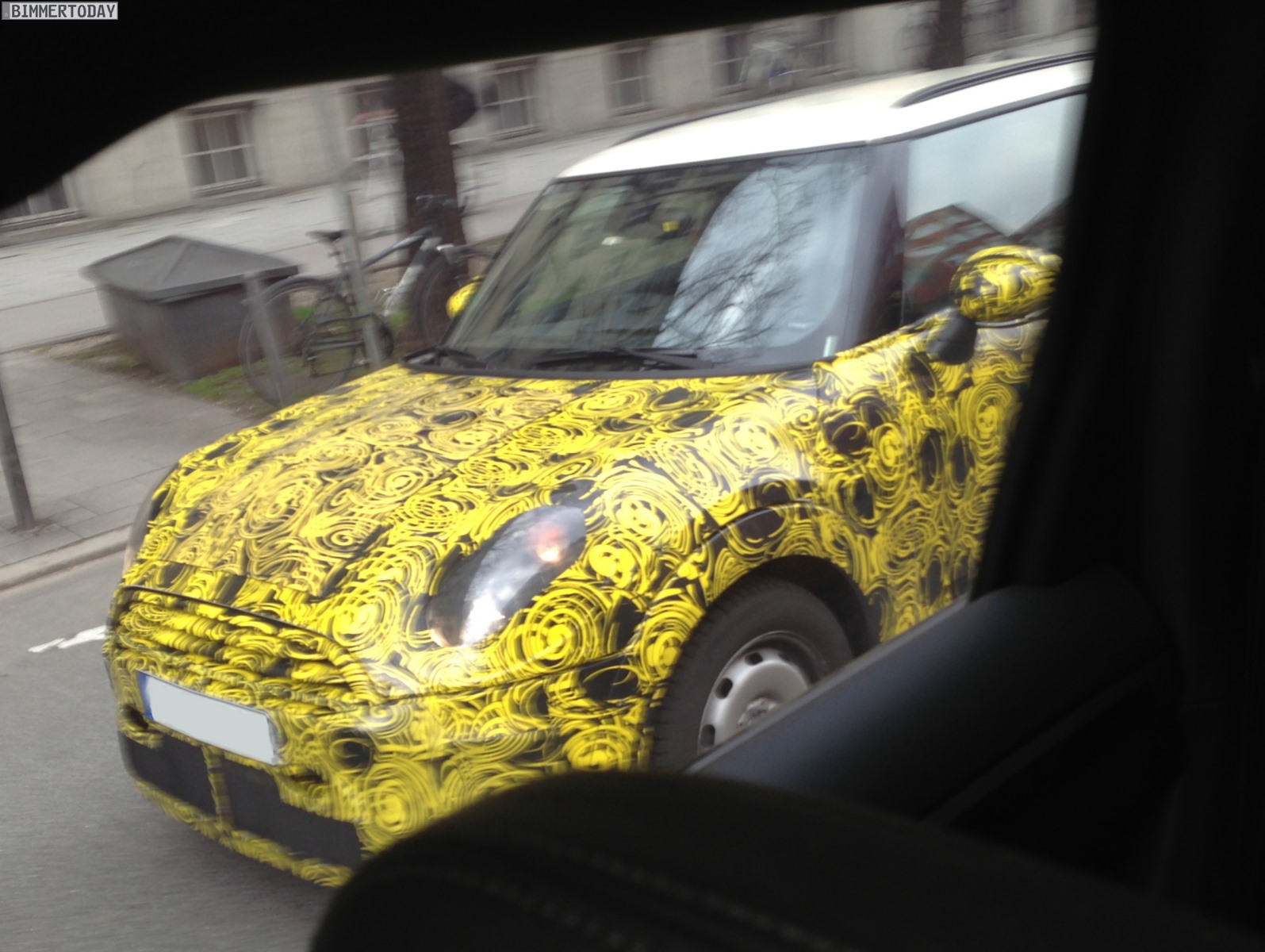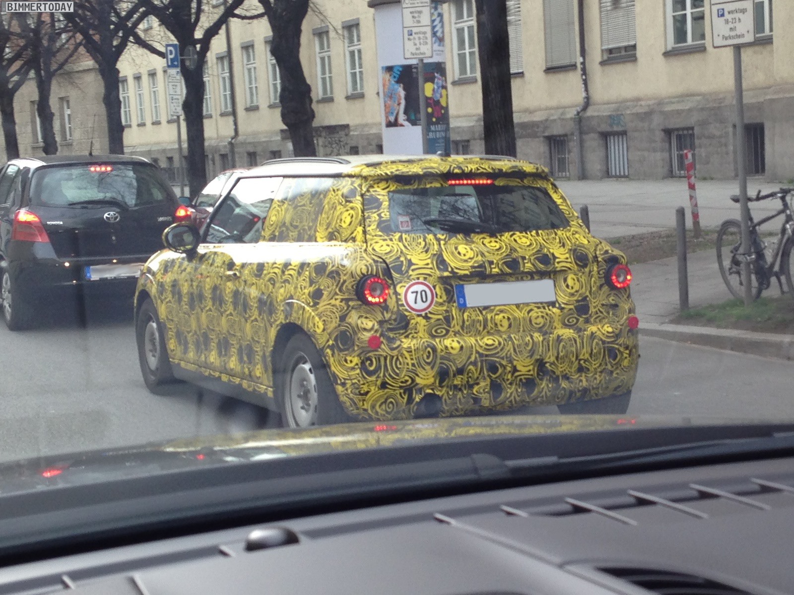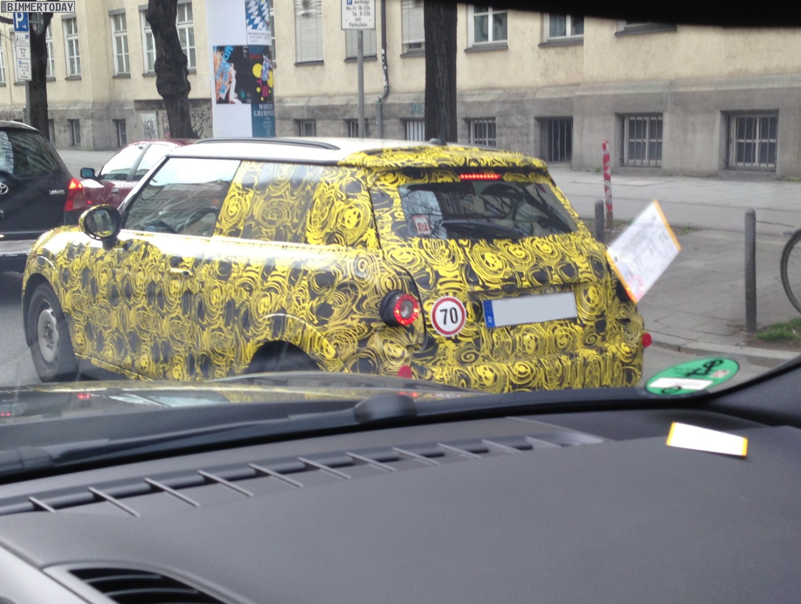Zu verdanken haben wir die neuen Bilder aus dem Münchner Stadtverkehr unserem Leser Tim, der beim Anblick des wie üblich mit auffälliger gelber Folie beklebten Erlkönigs sofort einige Handy-Bilder geschossen hat. Wie das einzelne Endrohr auf der linken Seite zeigt, handelt es sich um ein Modell mit schwächerer Motorisierung – höchstwahrscheinlich also um einen MINI F56 mit Dreizylinder. Übrigens ist auch die Position des Endrohrs auf der linken Seite sowie die Positionierung des Tankdeckels auf der rechten Seite ein Schritt zur Normalität und ein Abschied von der Linksverkehr-typischen umgekehrten Anordnung bei den Vorgängern.