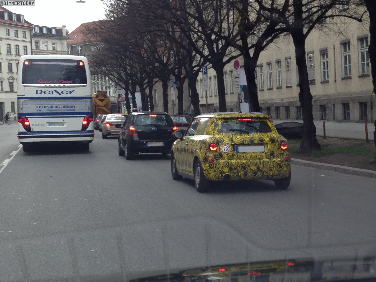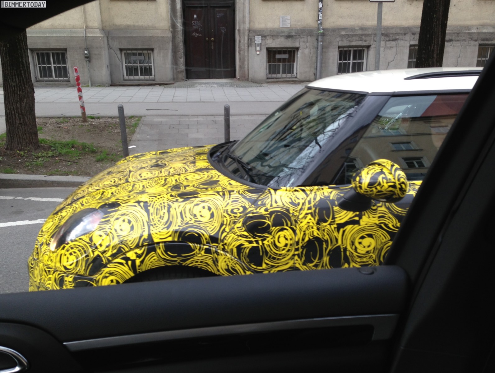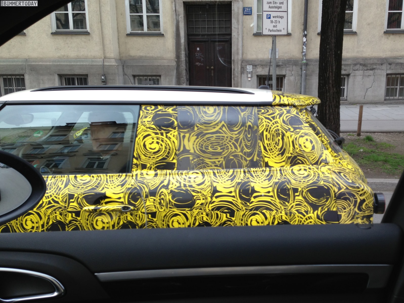 Zu verdanken haben wir die neuen Bilder aus dem Münchner Stadtverkehr unserem Leser Tim, der beim Anblick des wie üblich mit auffälliger gelber Folie beklebten Erlkönigs sofort einige Handy-Bilder geschossen hat. Wie das einzelne Endrohr auf der linken Seite zeigt, handelt es sich um ein Modell mit schwächerer Motorisierung – höchstwahrscheinlich also um einen MINI F56 mit Dreizylinder. Übrigens ist auch die Position des Endrohrs auf der linken Seite sowie die Positionierung des Tankdeckels auf der rechten Seite ein Schritt zur Normalität und ein Abschied von der Linksverkehr-typischen umgekehrten Anordnung bei den Vorgängern.