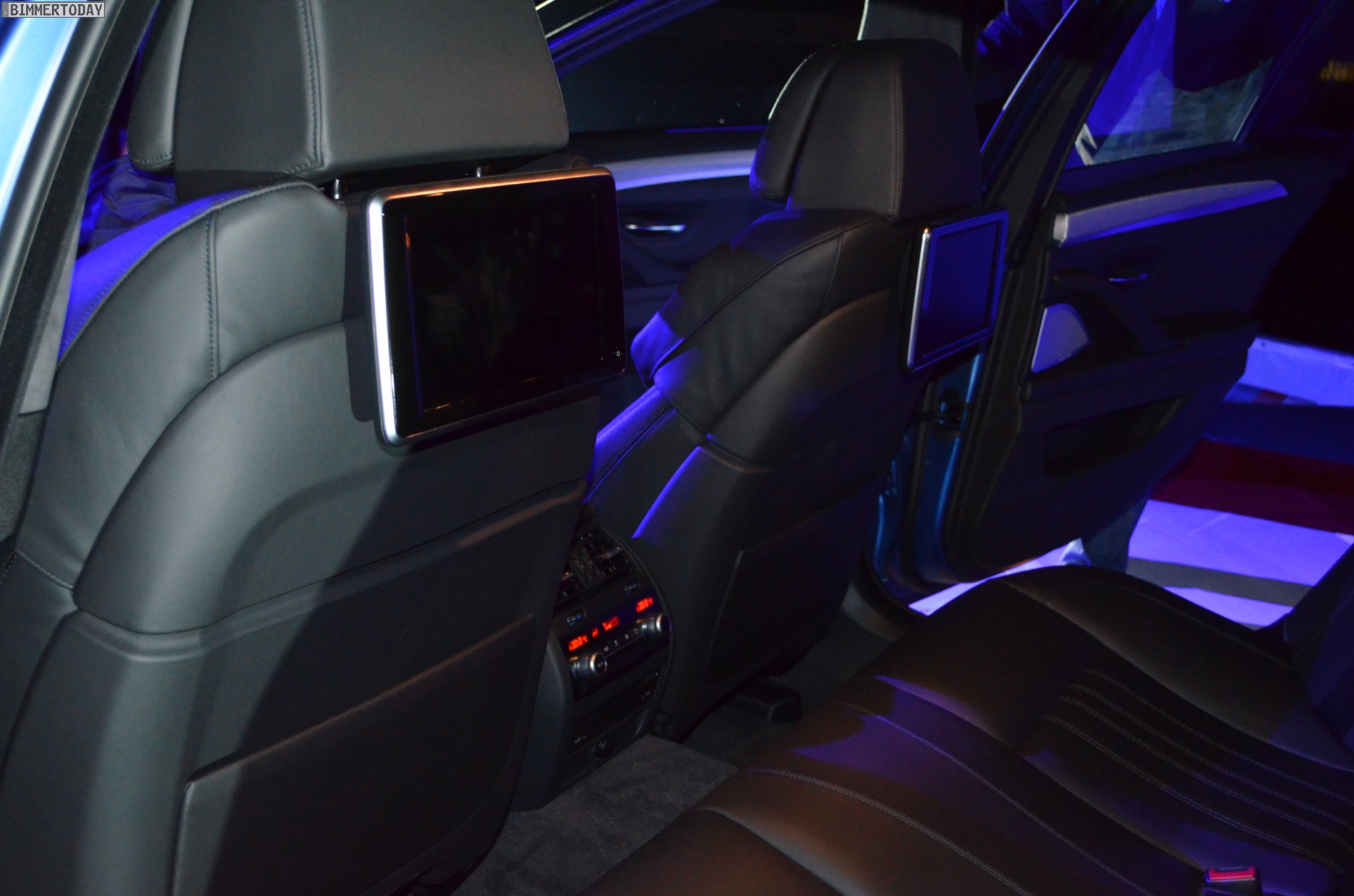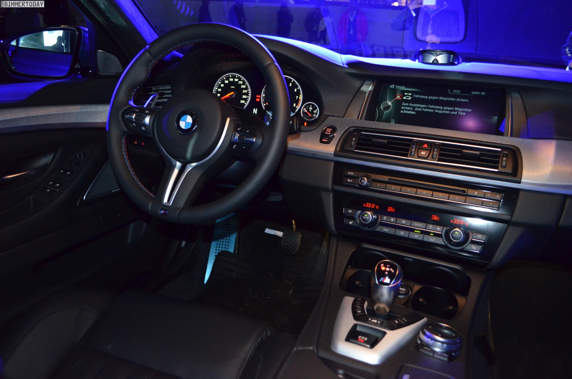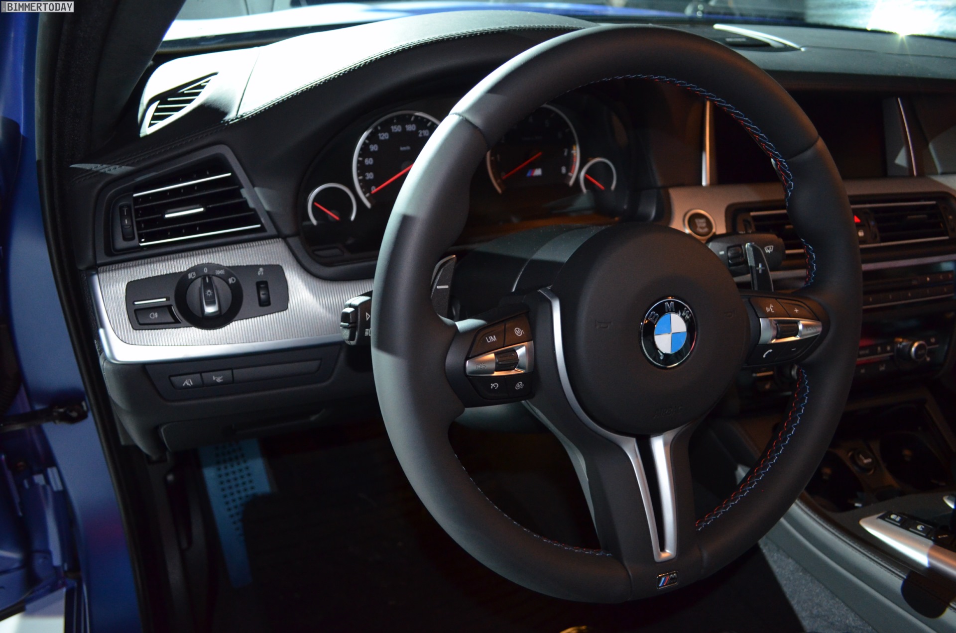 Im Innenraum vermittelt ein deutlich filigraneres Sport-Lederlenkrad mehr Dynamik und eine stärkere Abgrenzung vom Serien-5er, bemerkenswert sind außerdem der für alle neuen BMW 5er erhältliche iDrive Touch Controller und die flacheren Monitore des Fond Entertainment Systems.