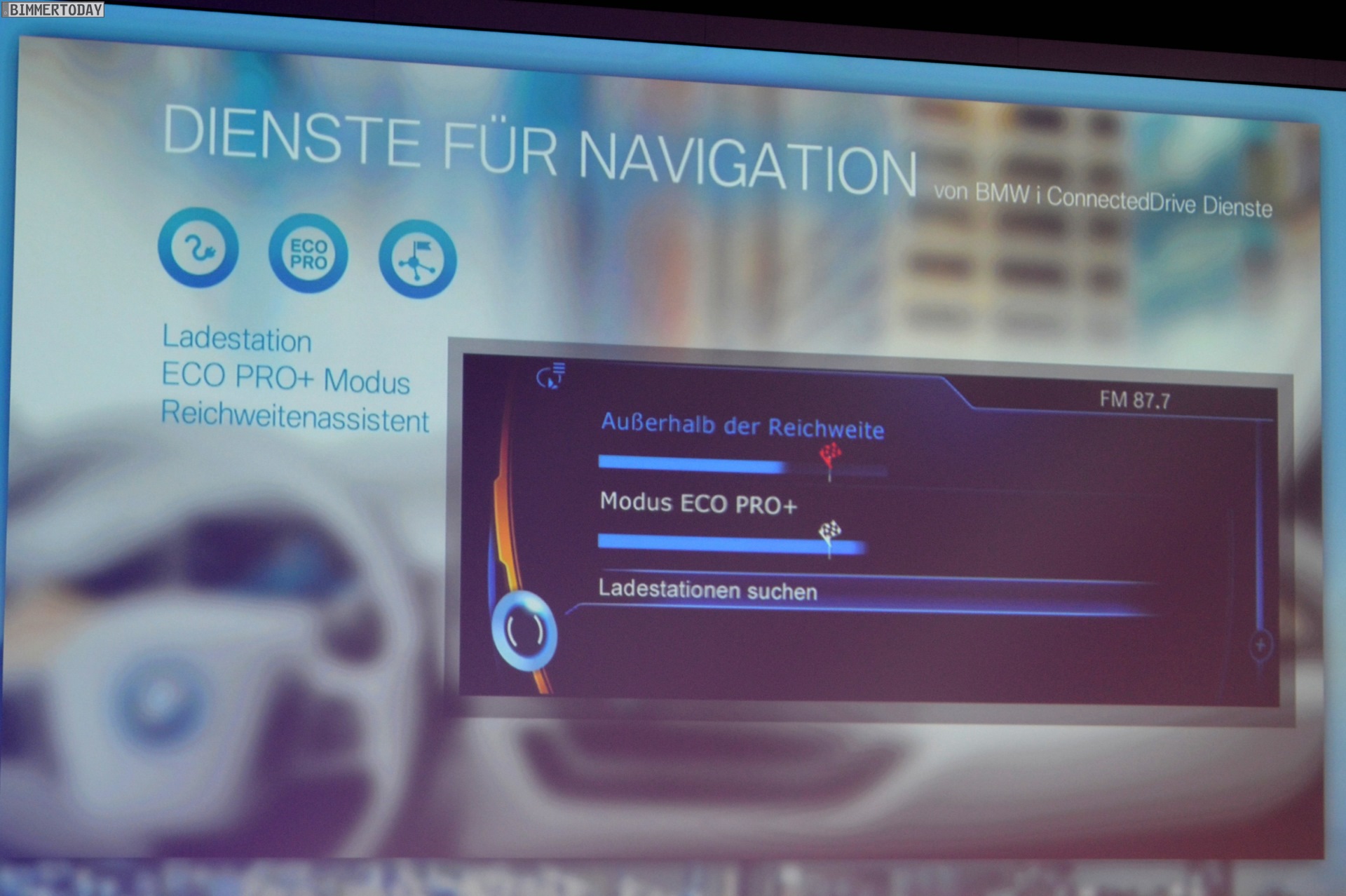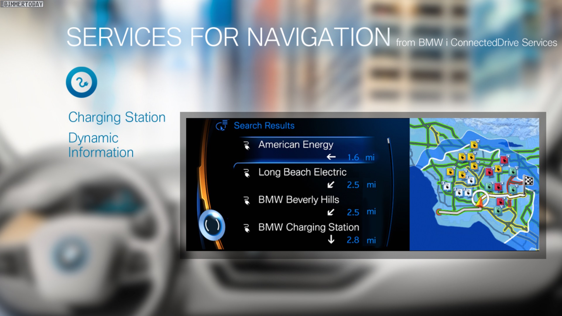Selbstverständlich ist auch das Navigationssystem des BMW i3 und aller folgenden BMW i-Modelle an die besonderen Bedürfnisse der Fahrer eines Elektroautos angepasst. So gibt es beispielsweise eine spezielle Reichweitenkarte, die den Fahrer jederzeit über alle mit dem aktuellen Ladestand der Batterie erreichbaren Ziele informiert. Sämtliche vorliegenden Informationen, von der Verkehrssituation über die Straßenart und eventuelle Höhenunterschiede bis hin zur Temperatur fließen in die Berechnung ein und werden für die Erstellung einer detaillierten Reichweitenspinne genutzt. Der innere Rand steht für Ziele, die sich im normalen Fahrmodus erreichen lassen, der äußere Rand bezieht sich auf den Spar-Modus Eco Pro+. Selbstverständlich werden auch Ladestationen im direkten Umfeld, in der Nähe des Zielorts und entlang der Route angezeigt – mit einer Anzeige dafür, ob an der Station derzeit ein Platz frei ist.