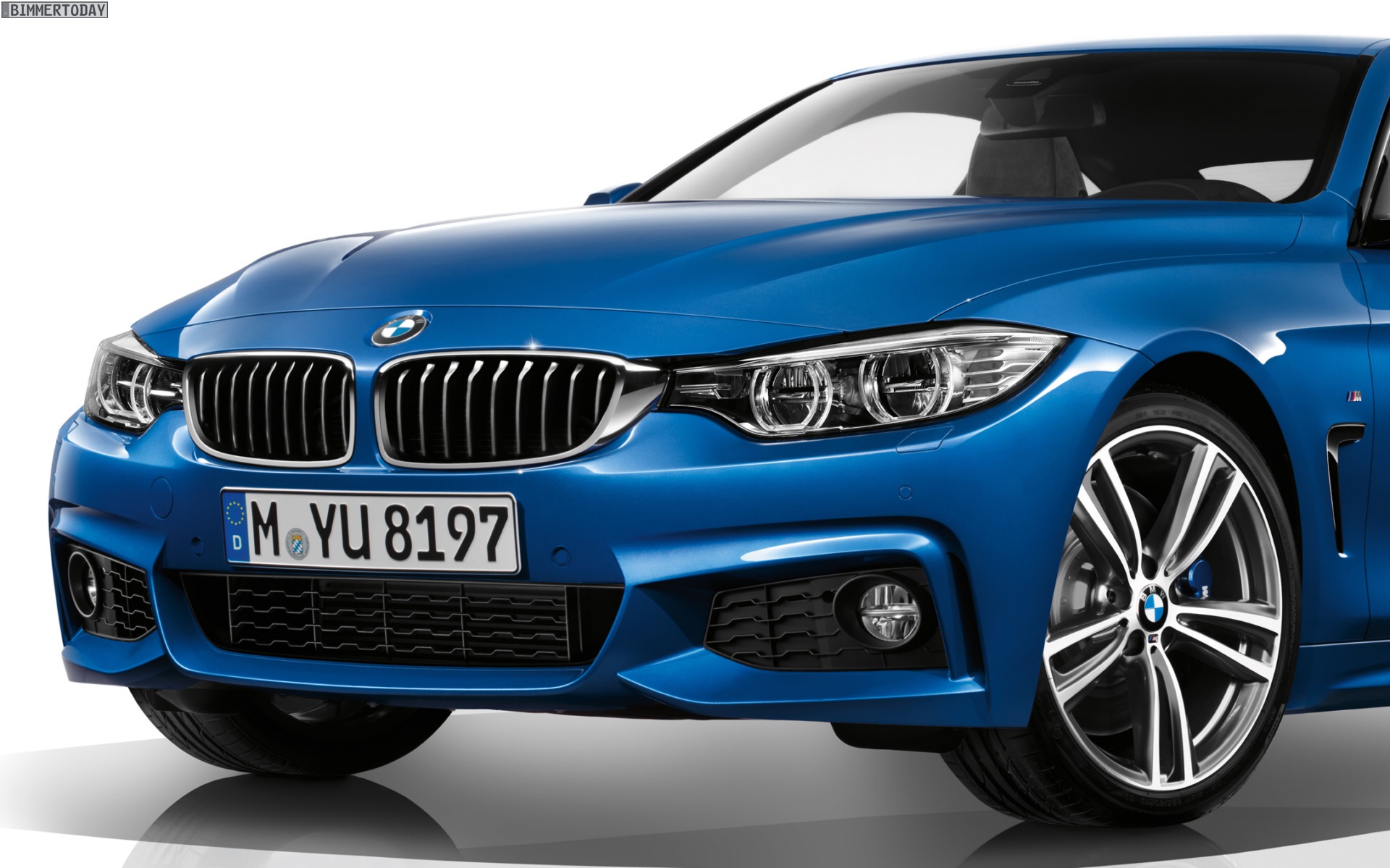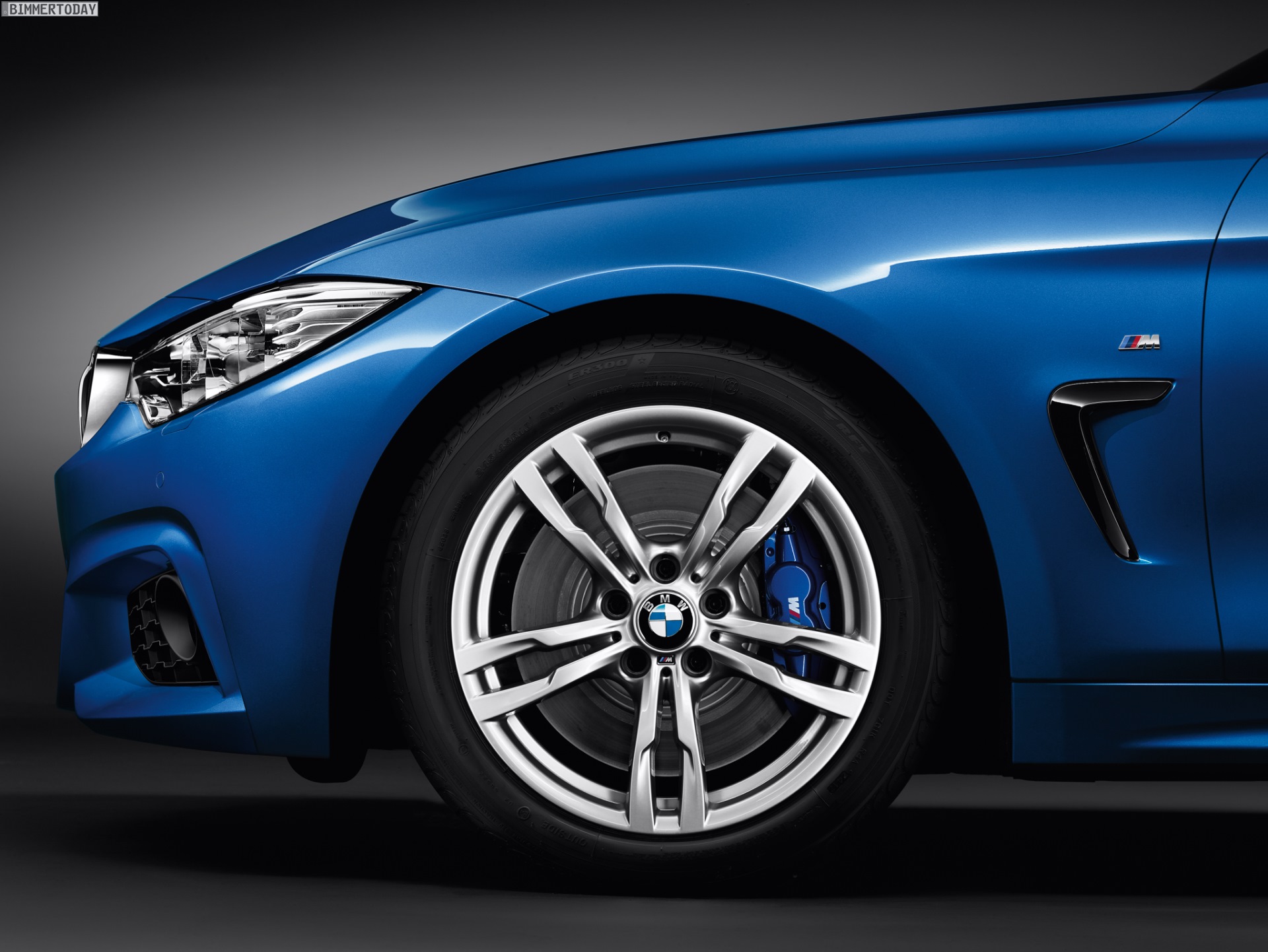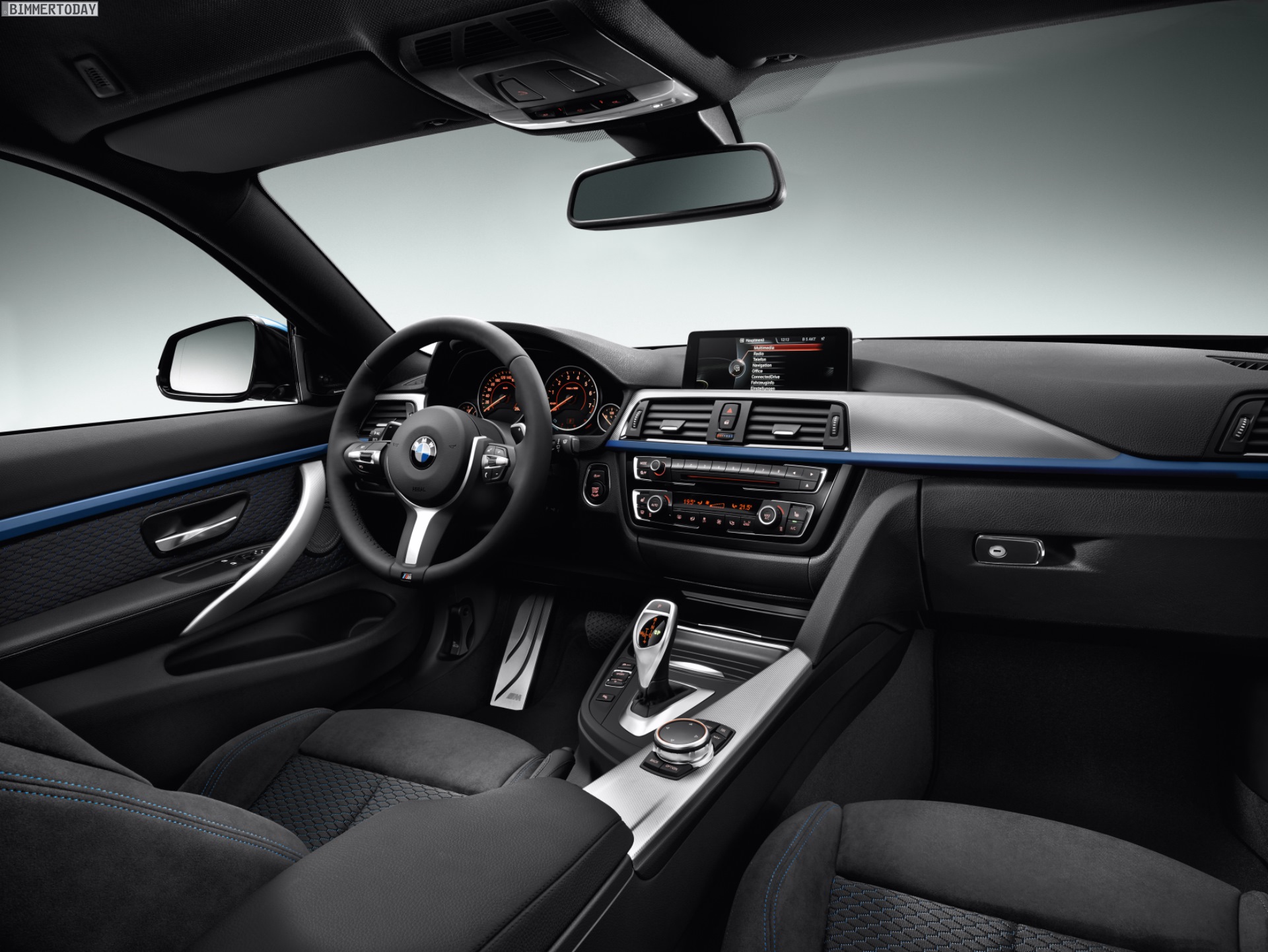 Das BMW 4er Coupé mit M Sportpaket wirkt dank der Frontschürze mit drei großen Lufteinlässen sowie separaten Luftkanälen für die Air Curtains deutlich aggressiver als das Serienmodell. Die Heckschürze mit dunkel abgesetztem Diffusor, diverse dank Shadow Line schwarze Elemente und passende Seitenschweller runden gemeinsam mit den 18 oder 19 Zoll großen Leichtmetallrädern das Sportpaket ab.