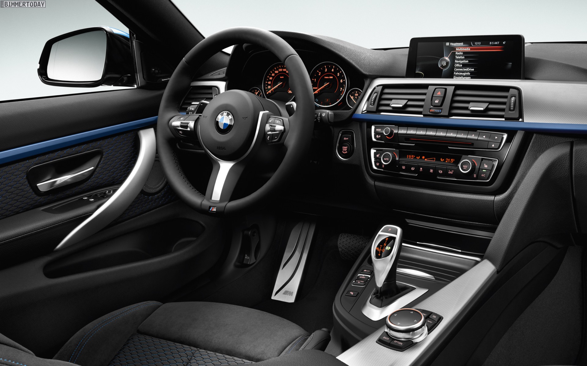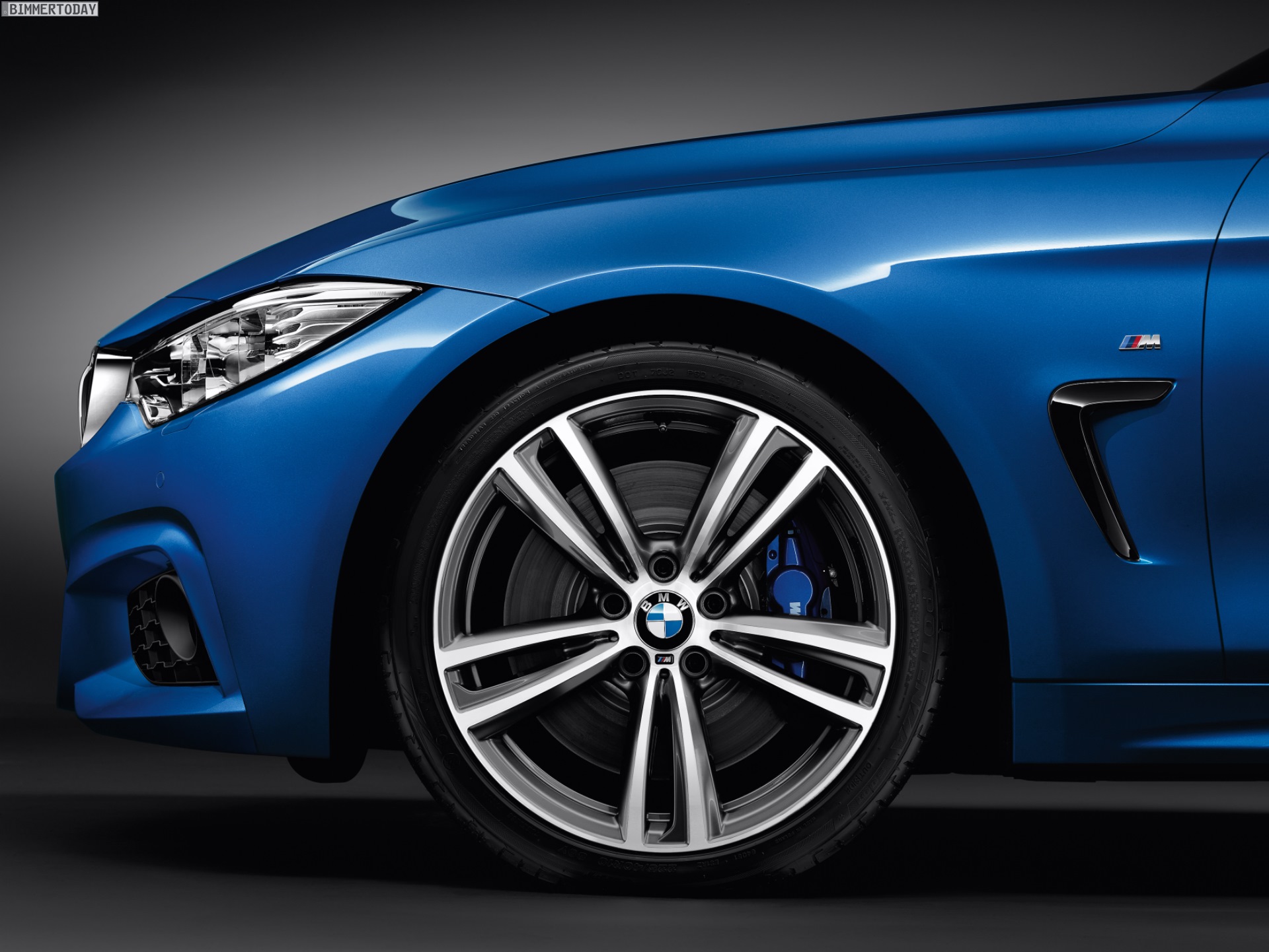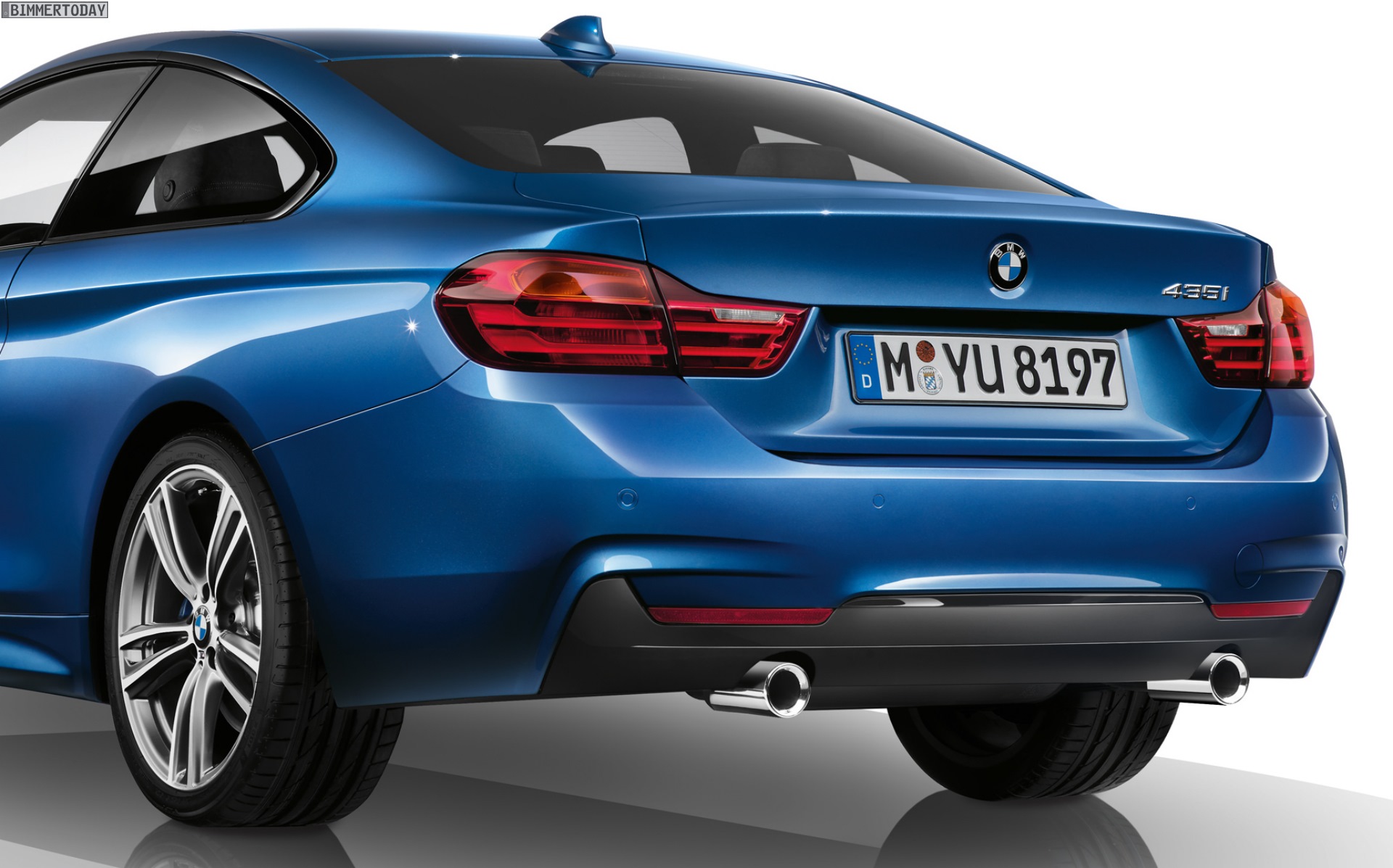 Das BMW 4er Coupé mit M Sportpaket wirkt dank der Frontschürze mit drei großen Lufteinlässen sowie separaten Luftkanälen für die Air Curtains deutlich aggressiver als das Serienmodell. Die Heckschürze mit dunkel abgesetztem Diffusor, diverse dank Shadow Line schwarze Elemente und passende Seitenschweller runden gemeinsam mit den 18 oder 19 Zoll großen Leichtmetallrädern das Sportpaket ab.