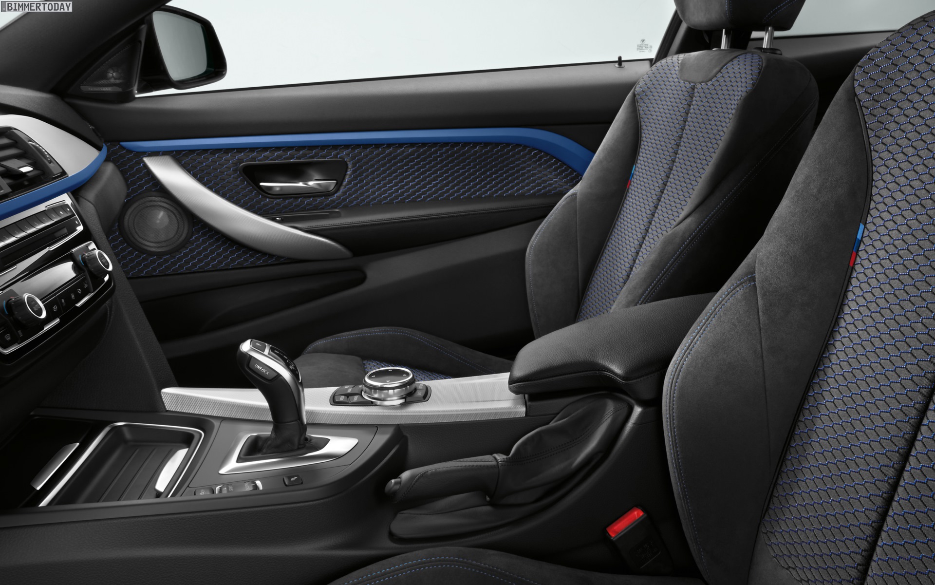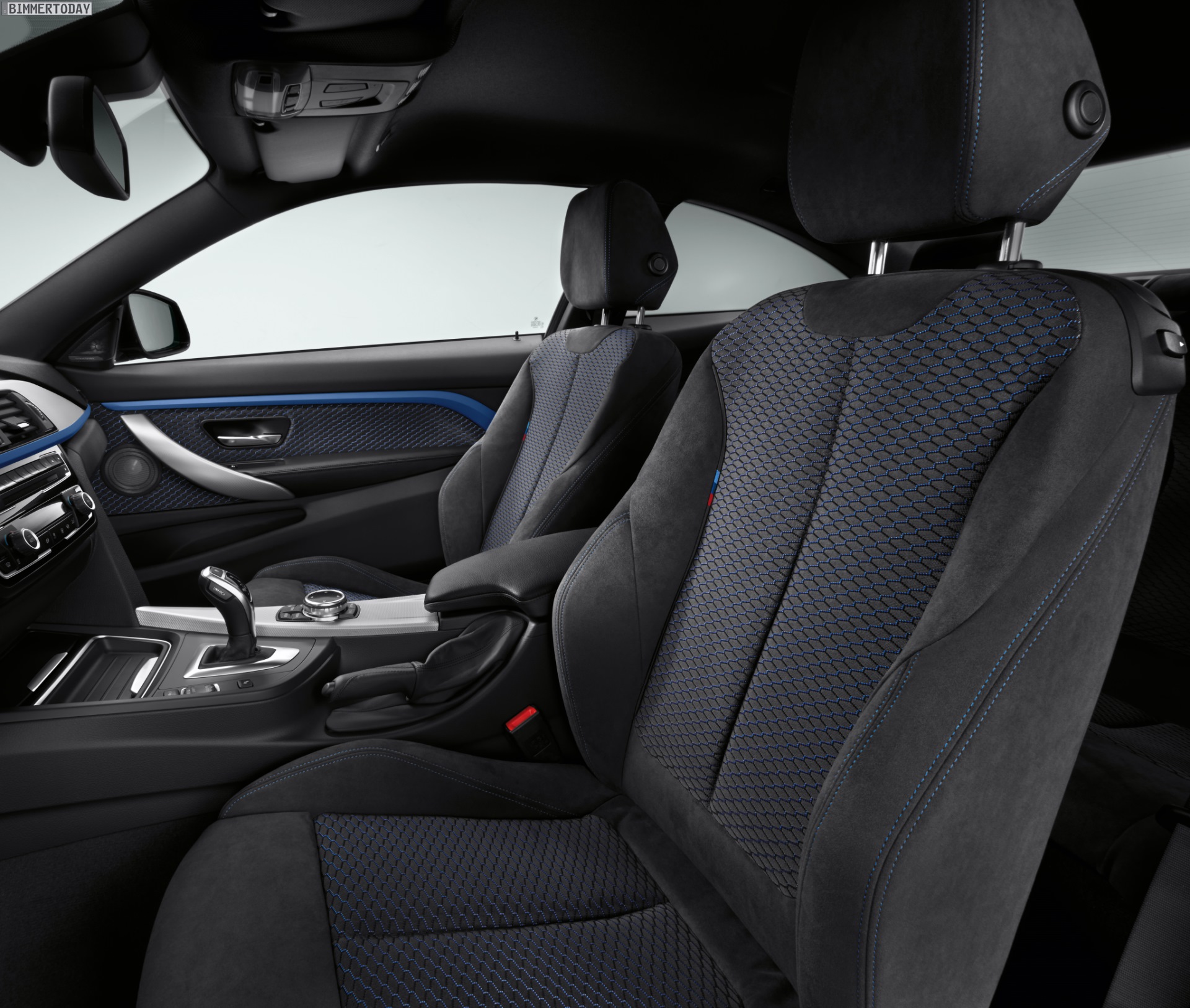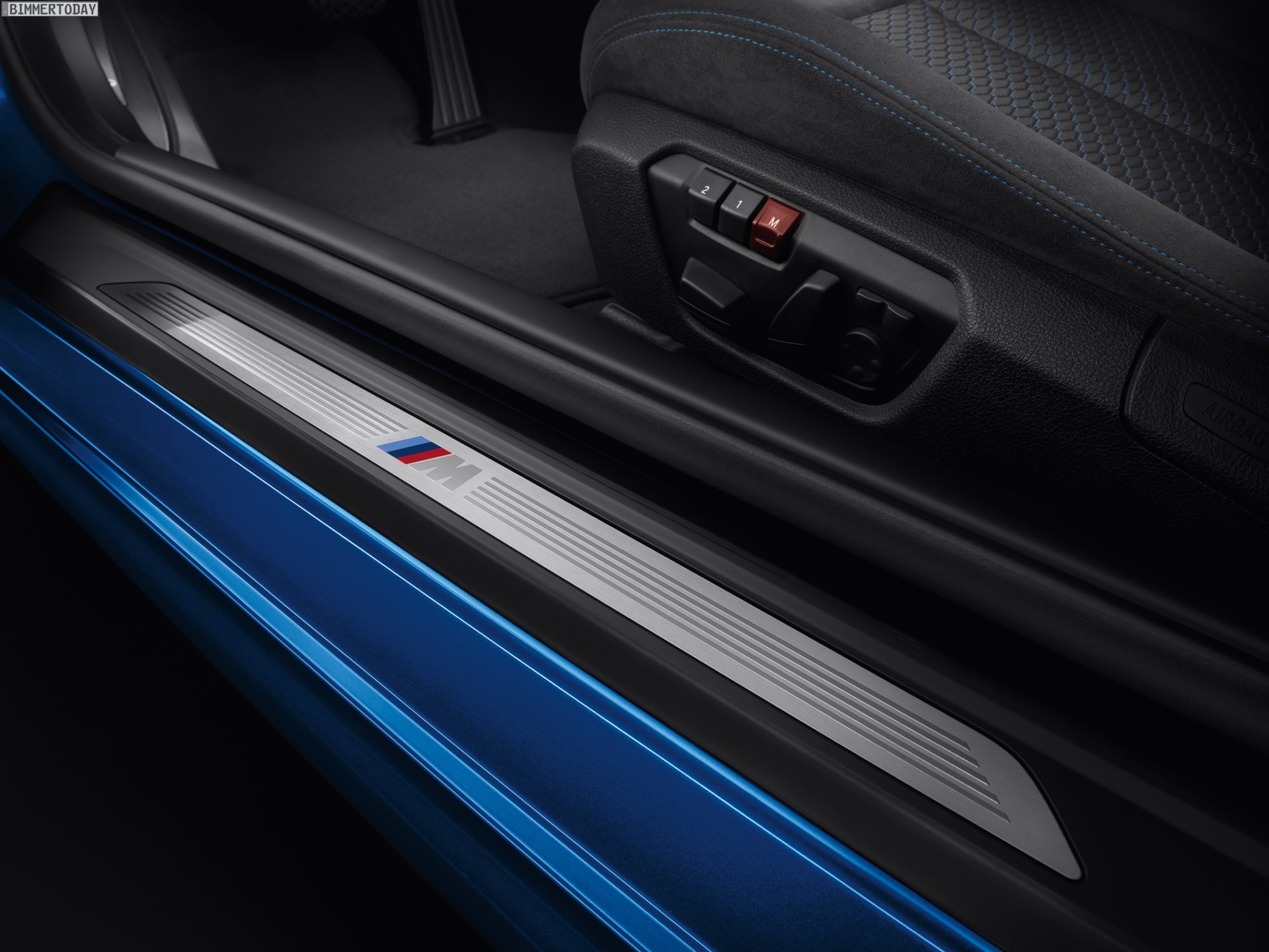 Innen sorgen Sportsitze mit Alcantara-Bezug und blauem Hexagonmuster, das M Lederlenkrad in filigraner Dreispeichen-Optik, helle Interieurleisten in Aluminium-Optik, der Dachhimmel in Anthrazit sowie passende Einstiegsleisten und Pedalerie für sportliches Flair. Auch auf dem Schalthebel darf das Logo der M GmbH natürlich nicht fehlen.