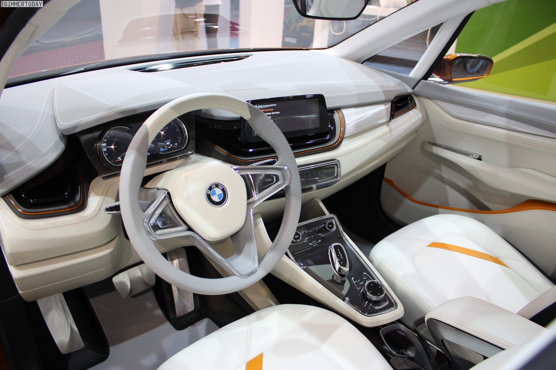 Besonders auffällig ist der 4,35 Meter lange und mit knapp 1,58 Meter relativ flache Kompakt-Van durch seine Lackierung in Gold Race Orange, die auch im Innenraum, an den Endrohren und an den 20 Zoll großen Felgen der Studie Akzente setzt. Abgesehen von Rädern und Farbe bleiben die Studie zum ersten Active Tourer Concept allerdings äußerst dezent.