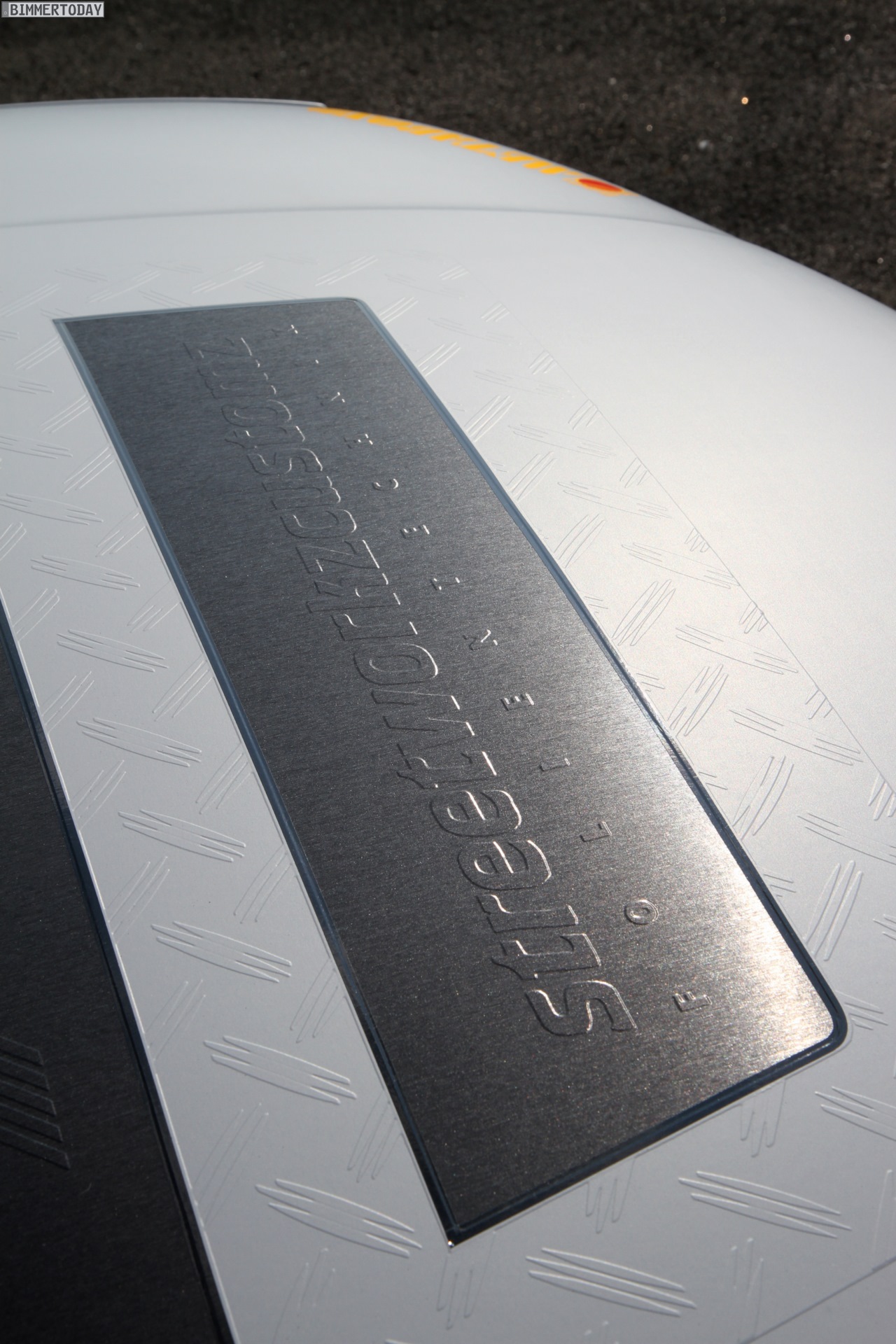 In Zusammenarbeit mit streetworkz customz wurde der ursprünglich in Valencia Orange lackierte BMW 1er M außerdem mattgrau foliert. Akzente setzen die in die Folierung integrierten Logos der beteiligten Firmen und Elemente in dreidimensionaler Riffelblech-Optik.