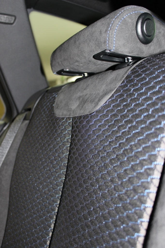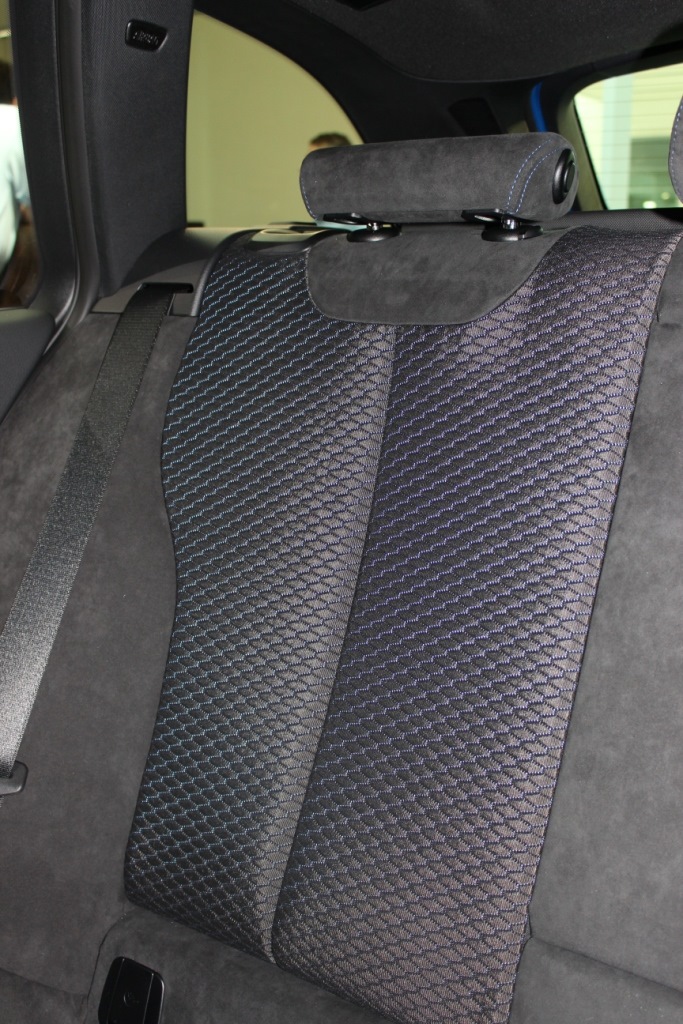 Die Akzentleisten am unteren Rand der Interieurleisten Aluminium Hexagon sind beim gezeigten Fahrzeug trotzdem nicht in serienmäßigem Estorilblau matt ausgeführt, sondern in der ohne Aufpreis erhältlichen Variante Schwarz hochglänzend. Die Umrandung des Fahrzeugschlüssels und die Kontrastnähte auf den Sportsitzen mit Bezügen aus Stoff und Alcantara sind dank M Sportpaket in Estorilblau ausgeführt.