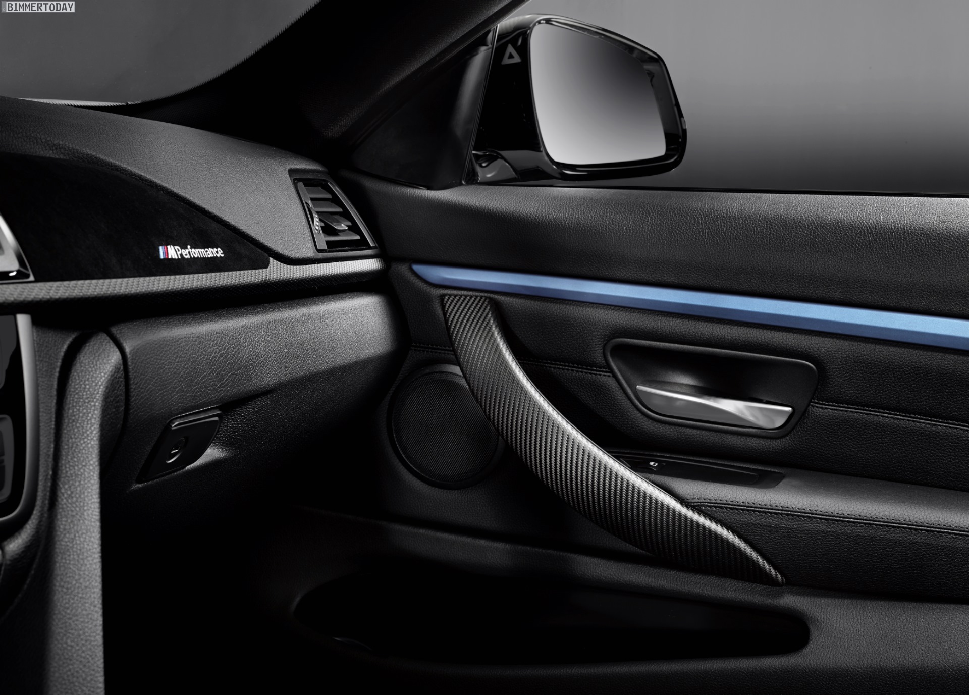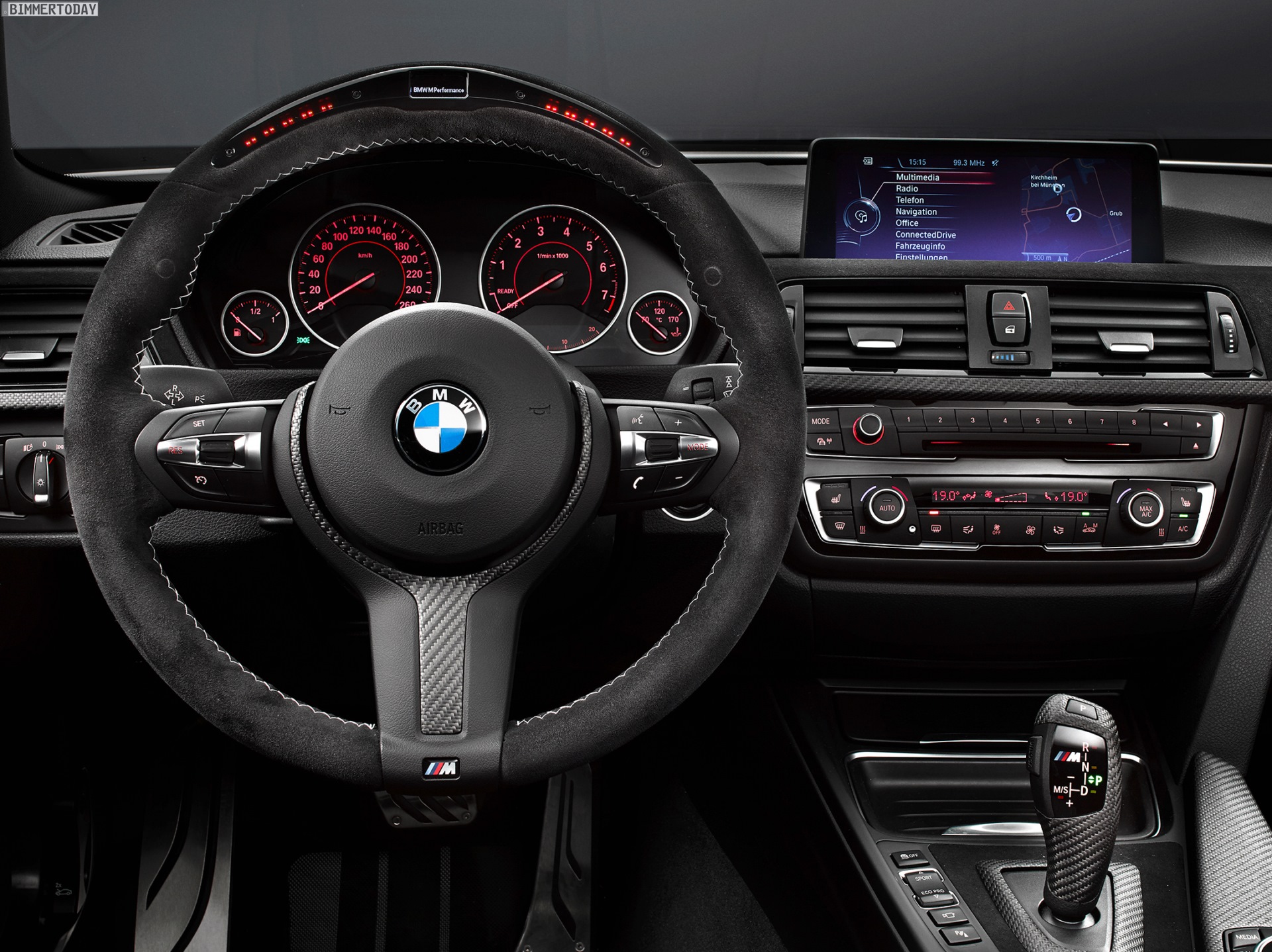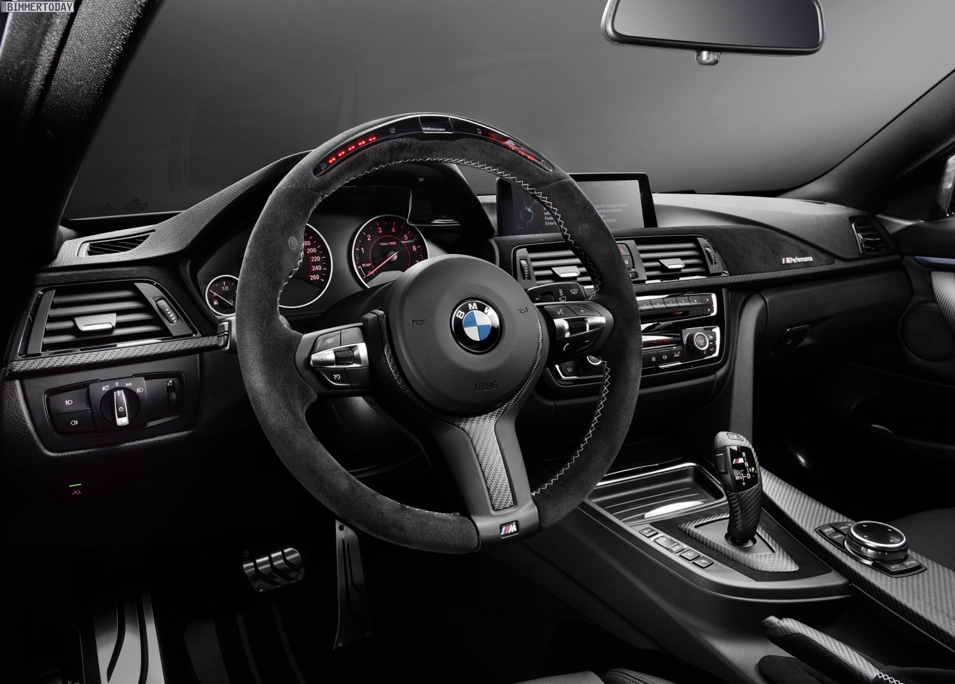 Auch den Innenraum kann man mit dem Zubehör von BMW M Performance deutlich dynamischer gestalten und klar von der Serie abgrenzen. Zentrales Element ist dabei das M Performance Sportlenkrad, wahlweise mit roter Mittenmarkierung oder Race Display. Hinzu kommen je nach Kundenwunsch Schalthebel und Handbremsgriff aus Carbon, Interieurleisten mit Carbon- und Alcantara-Oberflächen sowie eine Edelstahl-Pedalerie samt Fußstütze.