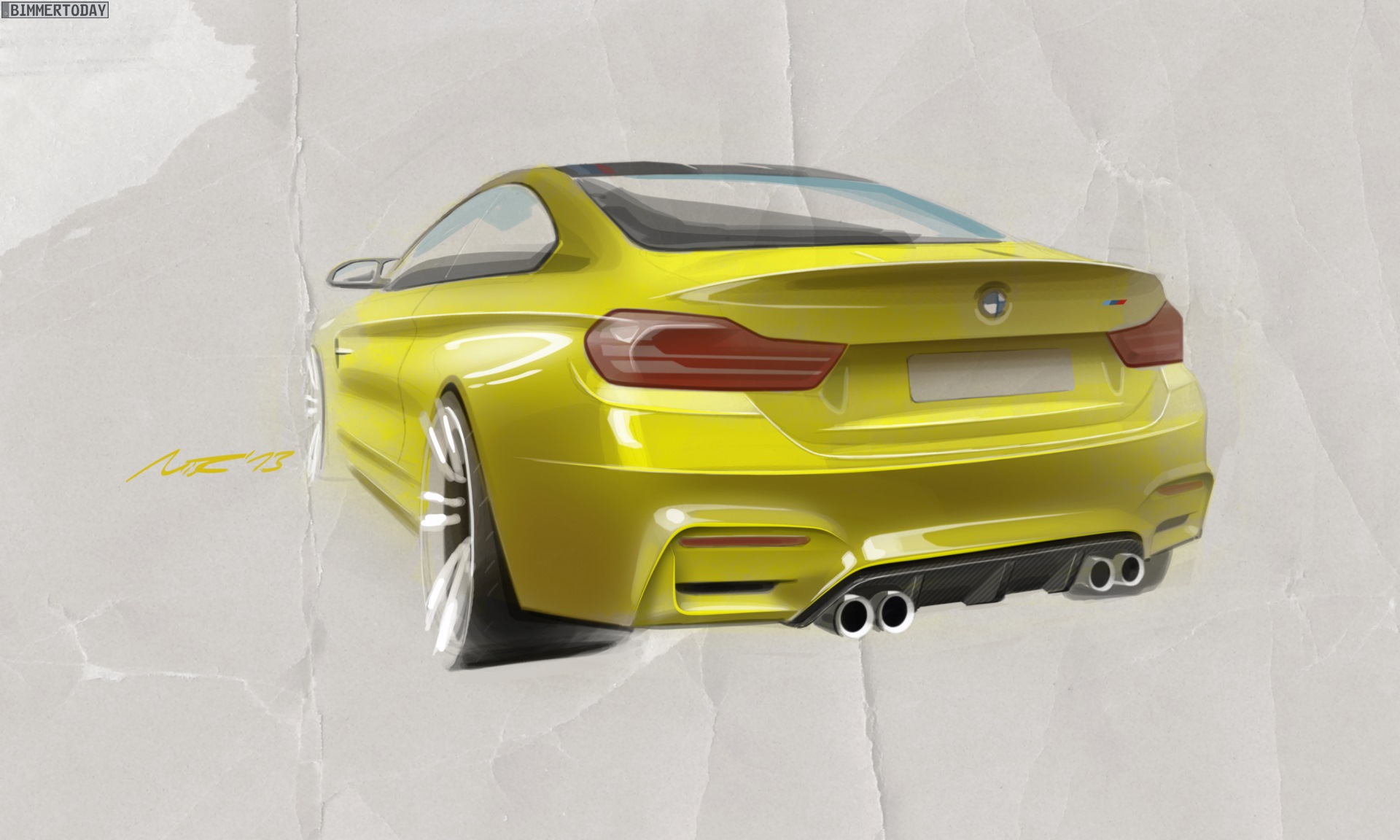 Vom gewöhnlichen BMW 4er F32 unterscheidet sich der M4 auf den ersten Blick durch eine aggressive Frontschürze mit drei zentralen und zwei seitlichen Lufteinlässen, wobei letztere für die Air Curtain genannte Umströmung der Vorderräder gedacht sind. Am unteren Rand der Schürze sorgt ein Carbon-Frontsplitter für zusätzlichen Abtrieb, diese Komponente könnte später über das Zubehör-Programm von BMW M Performance den Weg zum Kunden finden.