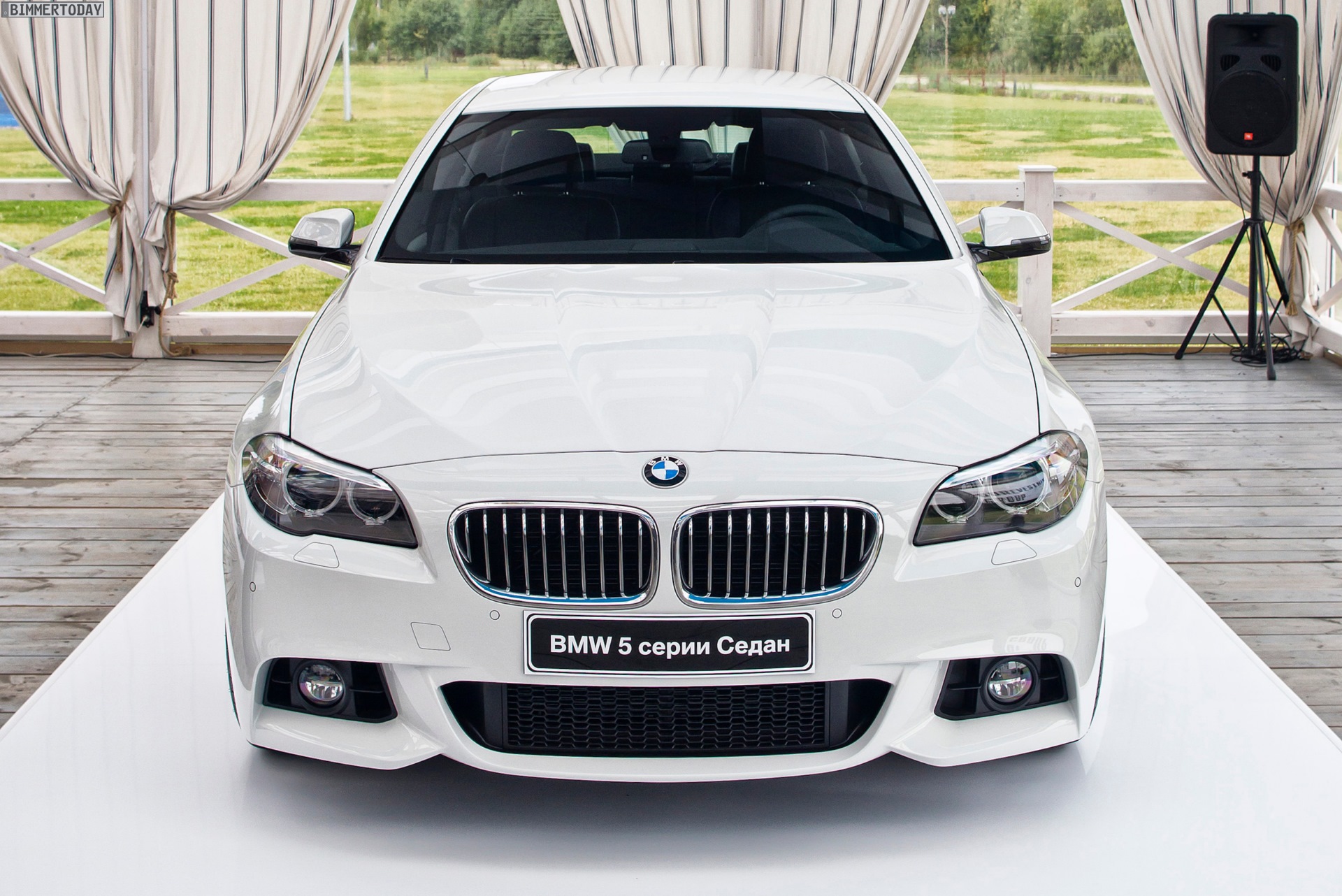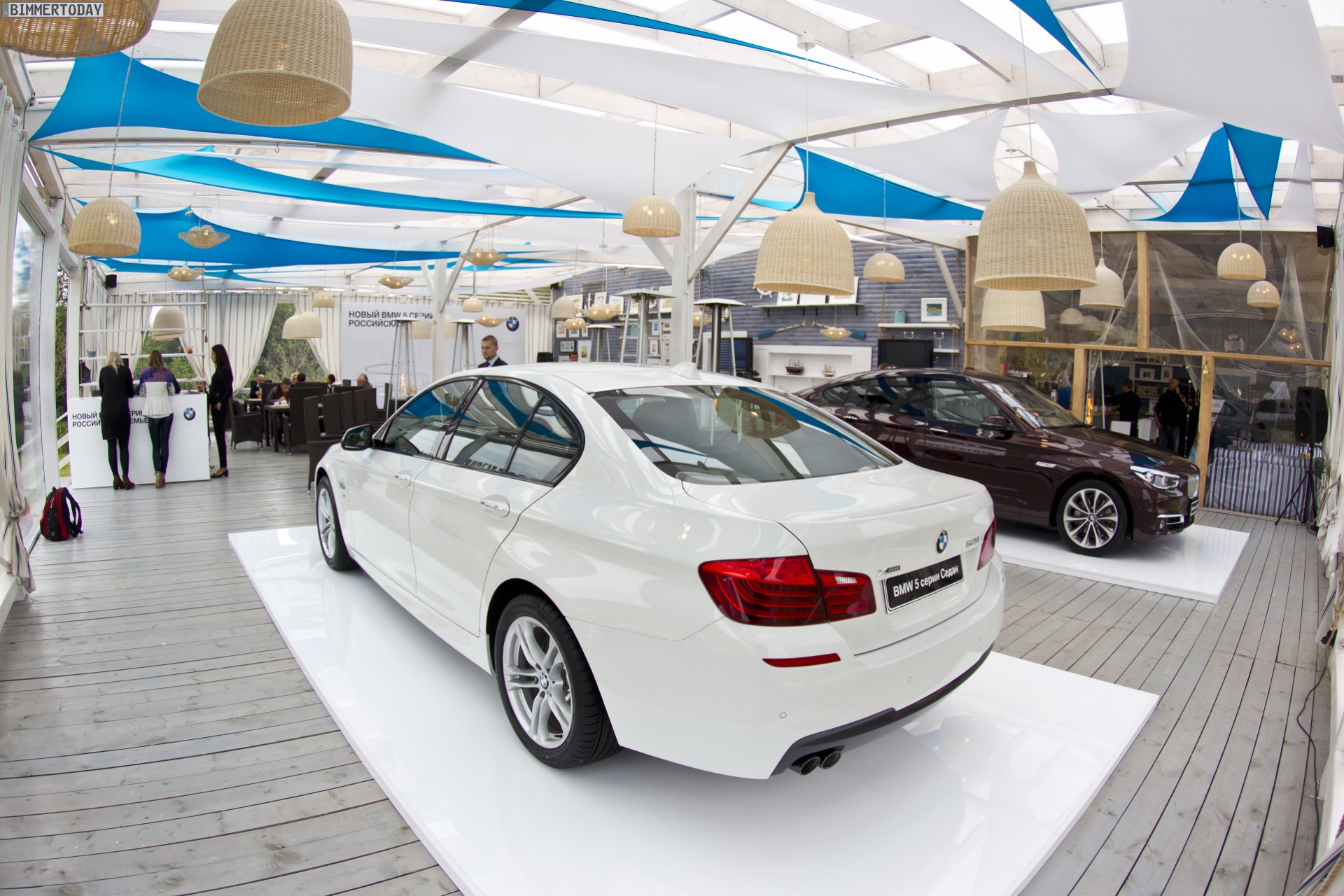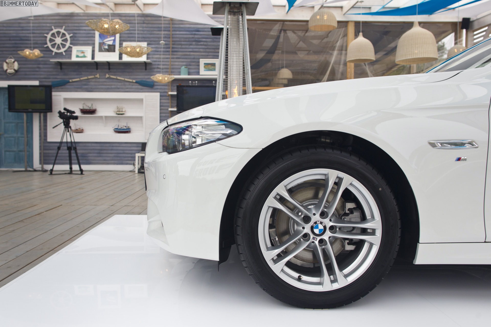 Neben dem schwarzen M550d wurde der russischen Presse auch ein weißer BMW 528i xDrive mit M Sportpaket präsentiert, der ebenfalls einen dynamischen Auftritt hinlegt: