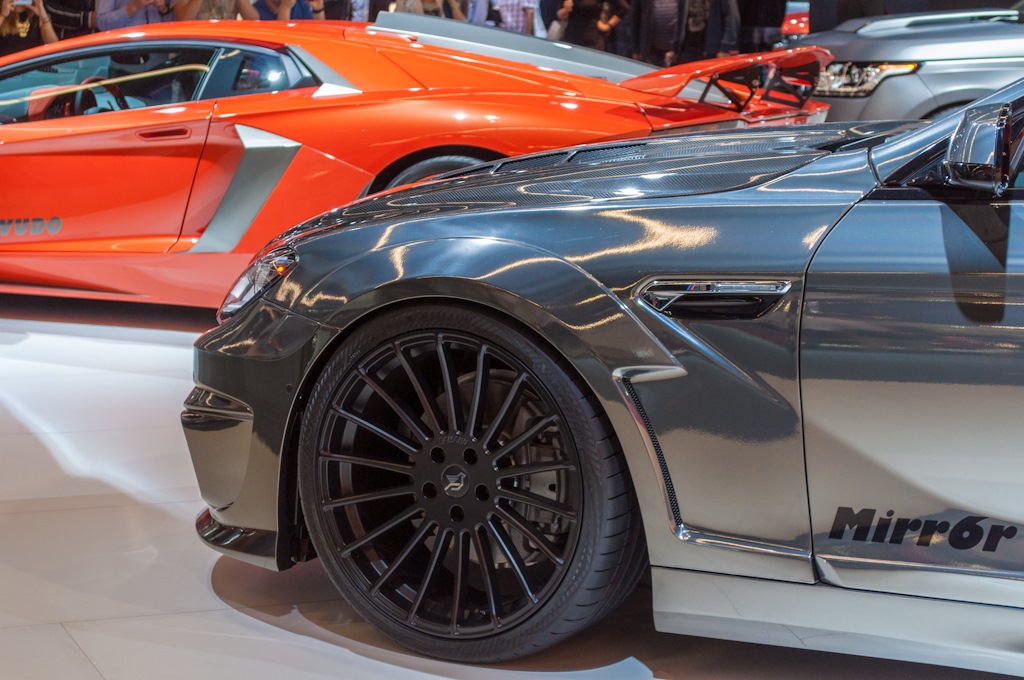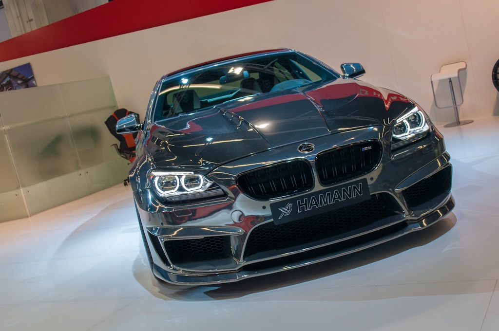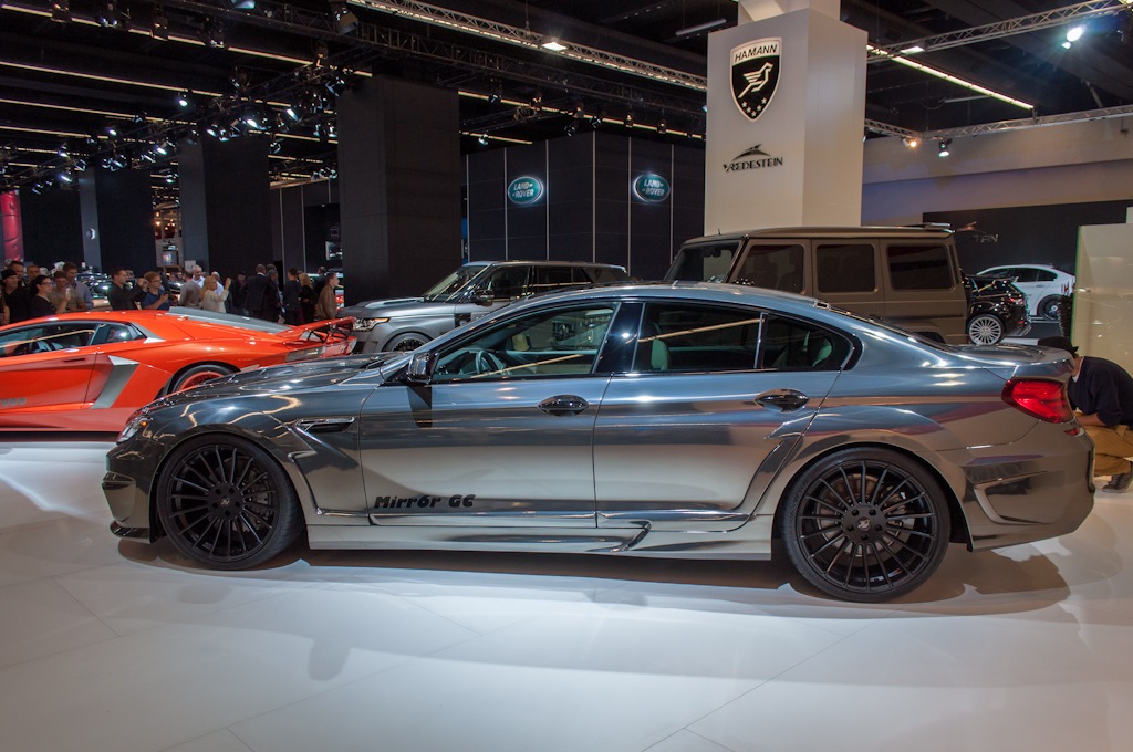 In Genf stand er noch mit zwei Türen, ein paar Monate später und einige Kilometer nördlich ist der Hamann MIRR6R BMW M6 zum erwachsenen Viertürer geworden: Der Tuner aus Laupheim präsentiert seine Chrom-blitzende Interpretation auf der IAA 2013 als M6 Gran Coupé und zeigt, dass die eleganten Formen des viertürigen BMW 6ers auch mit der extrem auffälligen Folierung in Spiegel-Optik harmonieren – wenn man nicht gerade auf der Suche nach einem dezenten und unauffälligen Auto ist.