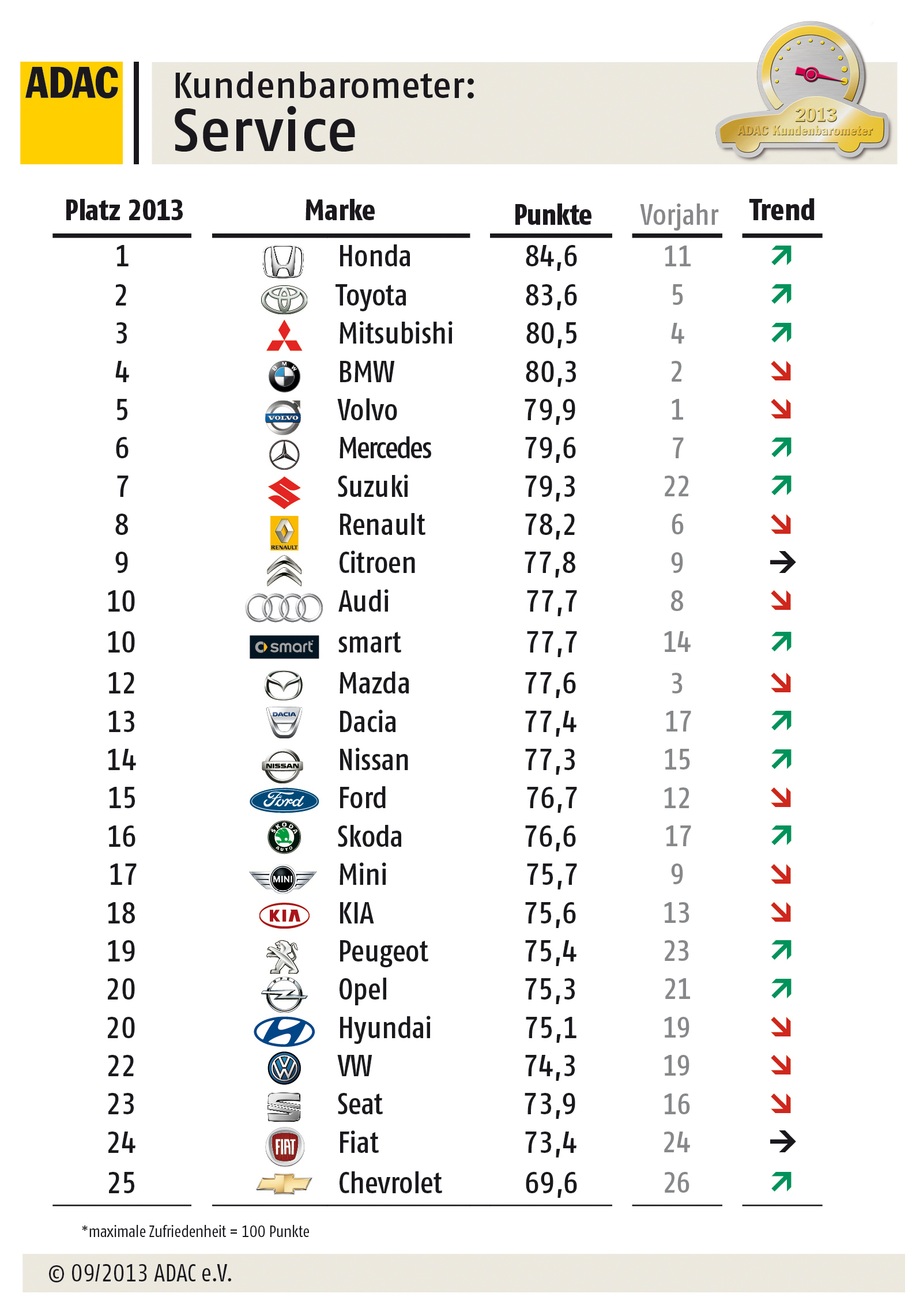 Ein besonderer Schwerpunkt lag 2013 auf dem Thema Service, wobei vor allem asiatische Autobauer punkten konnten: Im Vorjahr noch auf Platz 2, liegt BMW nun nur noch auf dem vierten Rang hinter Honda, Toyota und Mitsubishi. Vorjahres-Sieger Volvo rutschte auf den fünften Rang ab.