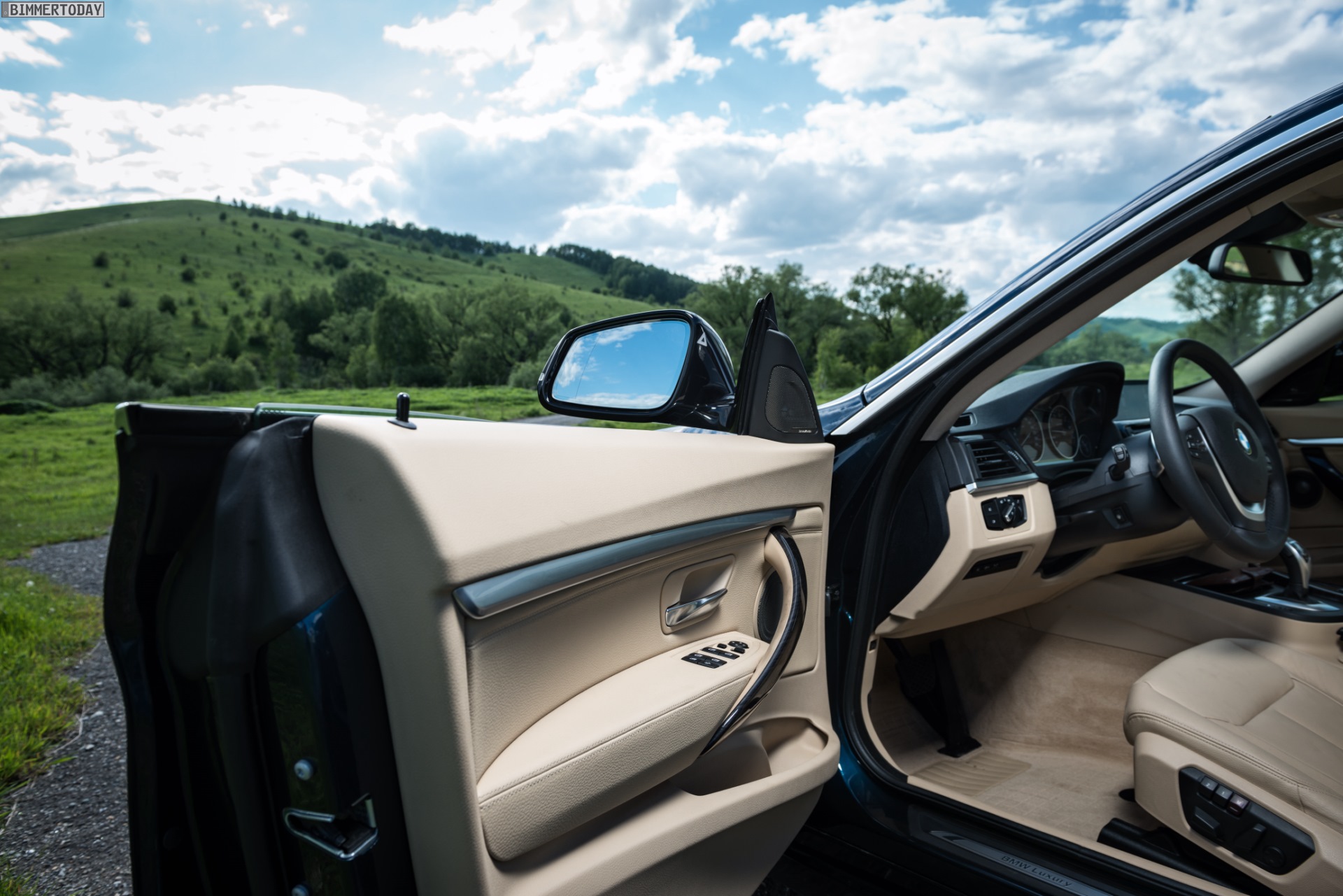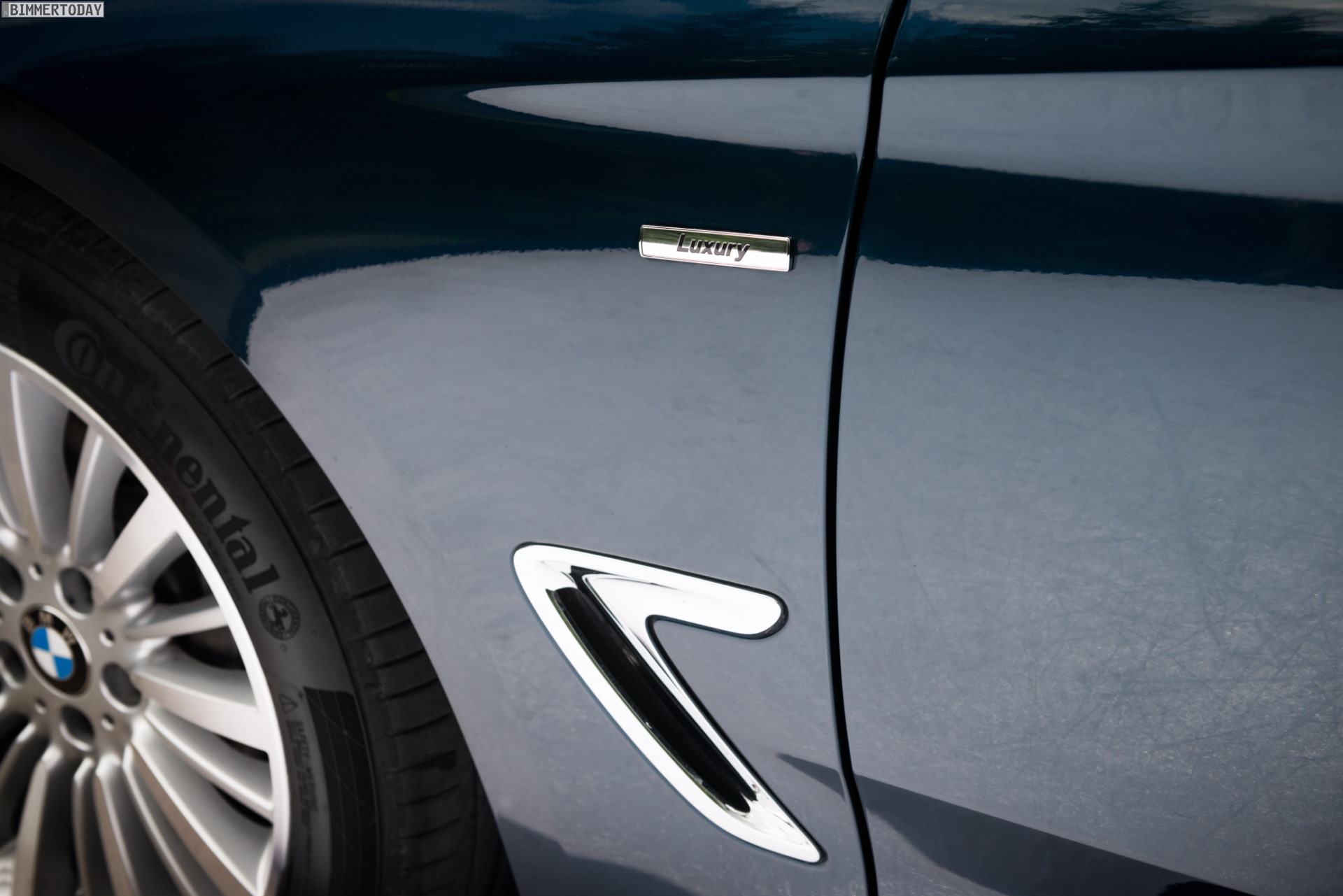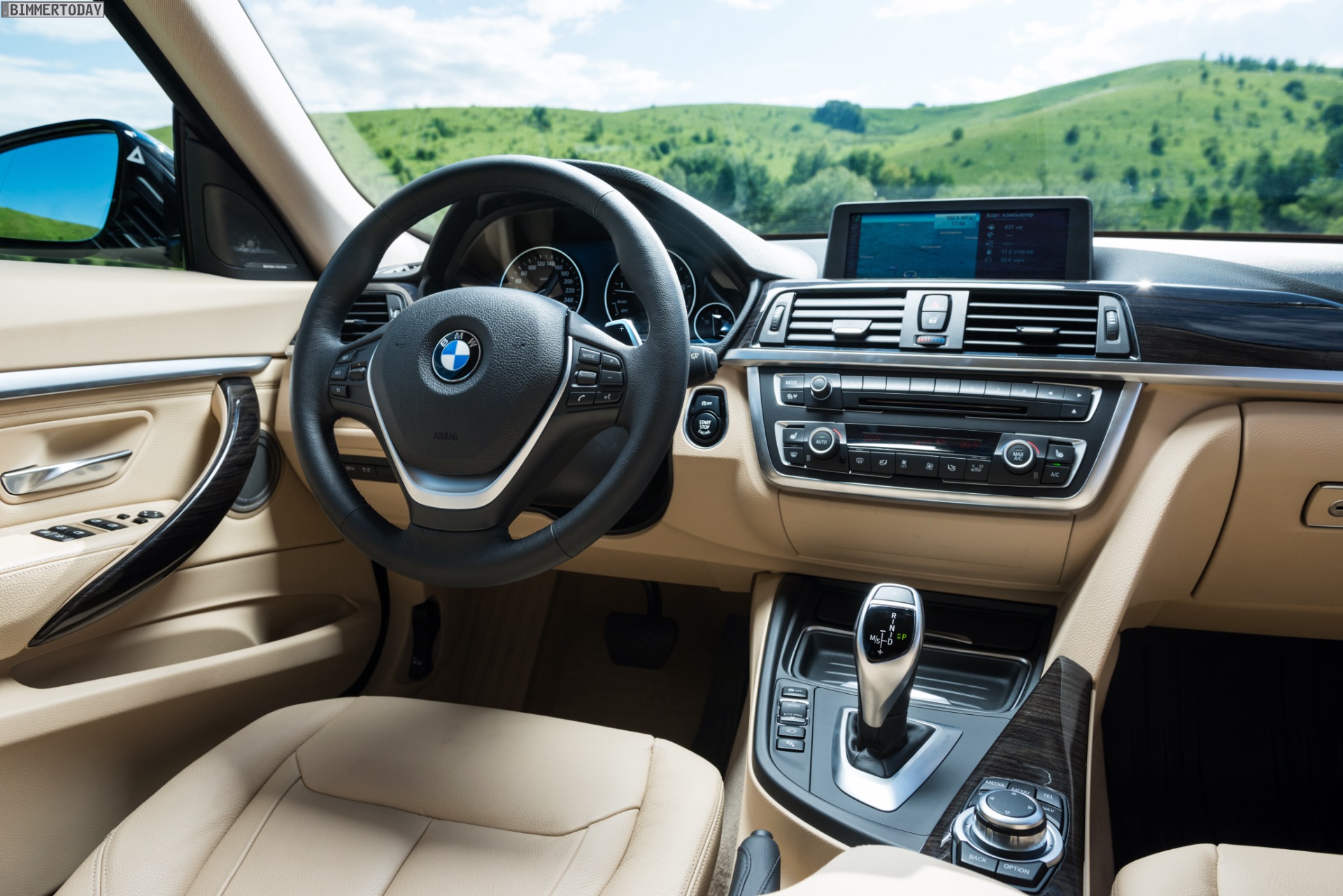 Bei den Felgen handelt es sich um die in Verbindung mit Luxury Line serienmäßigen Leichtmetallräder Vielspeiche 416 in 18 Zoll, im Innenraum trägt der gezeigte F34 einen hellen Anzug mit Holz- und Aluminium-Elementen.