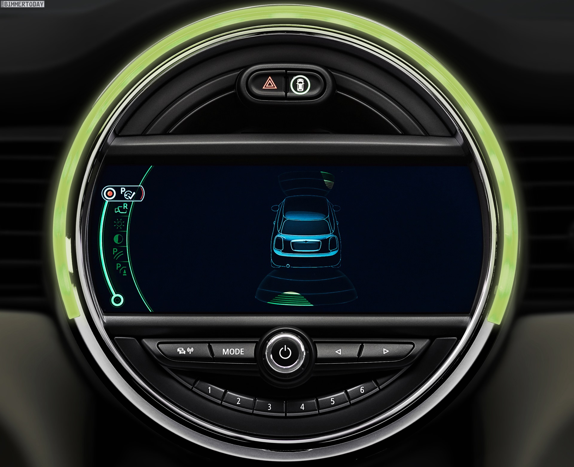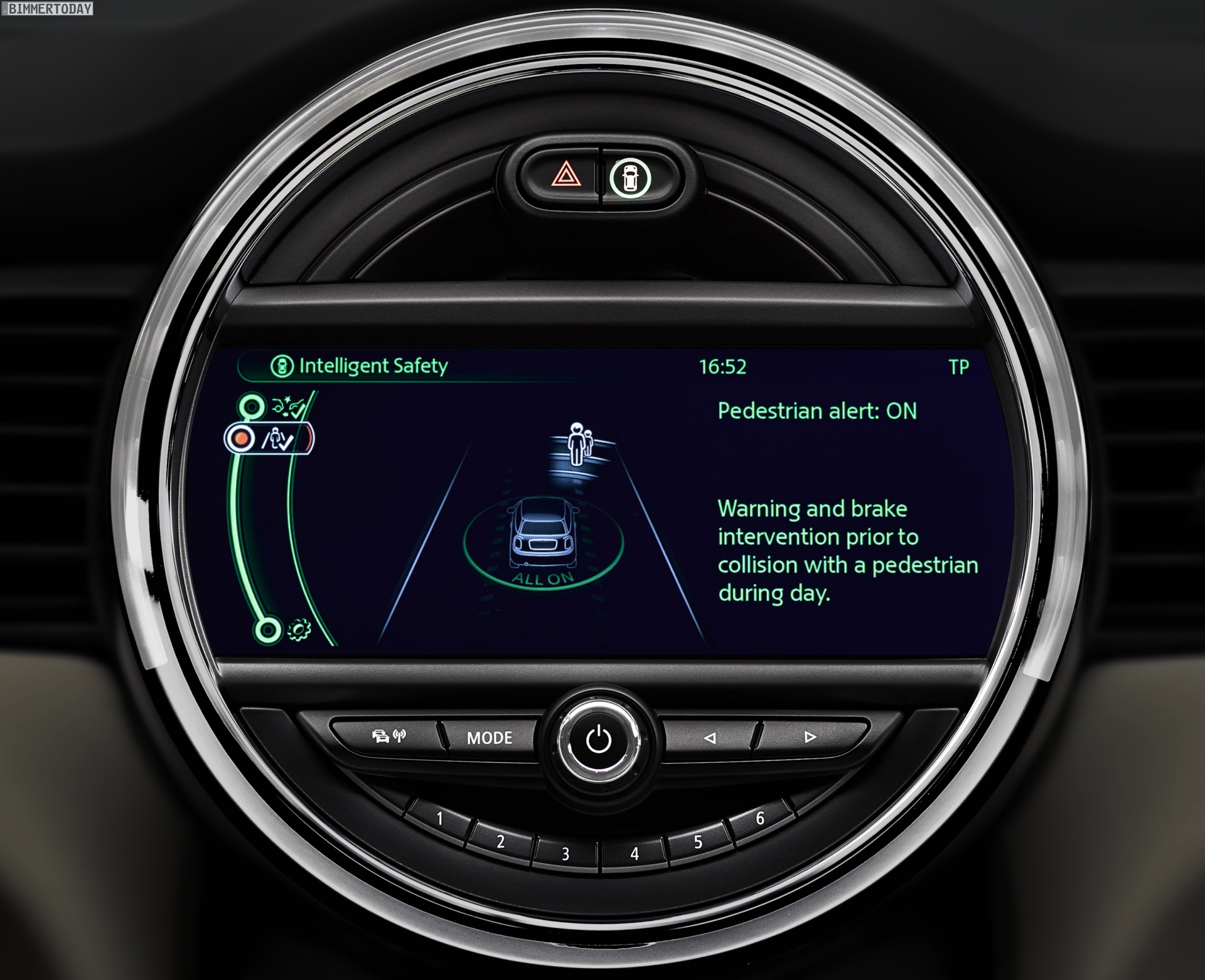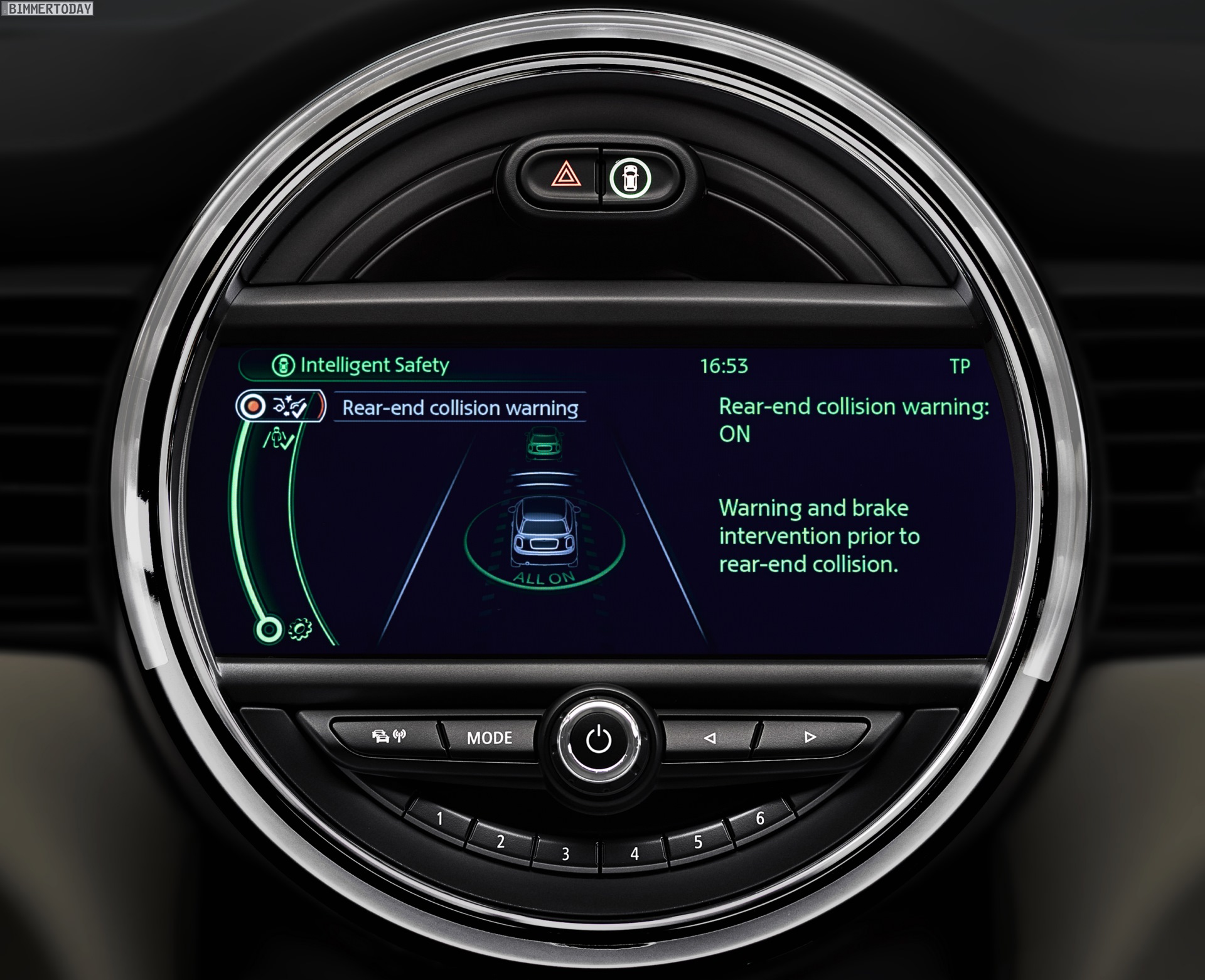 Neben dem ersten MINI-HUD bringt der neue Kleinwagen noch einige weitere Assistenzsysteme mit, die Sicherheit und Komfort verbessern sollen. Im Bereich des Innenspiegels ist eine Multifunktionskamera verbaut, die im Stadtverkehr bei bis zu 60 km/h vorausfahrende Fahrzeuge und auch Fußgänger auf Kollisionskurs erkennt, um zu warnen und gegebenenfalls einen Bremsvorgang einzuleiten. Bei einer Geschwindigkeit über 60 km/h arbeitet die Auffahrwarnung ebenfalls und informiert den Fahrer optisch und akustisch über die drohende Gefahr, es erfolgt aber kein Bremseingriff.
