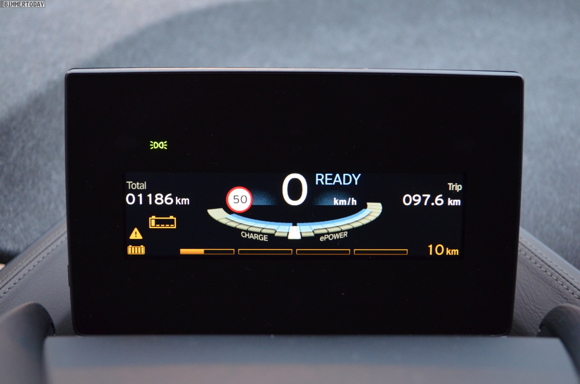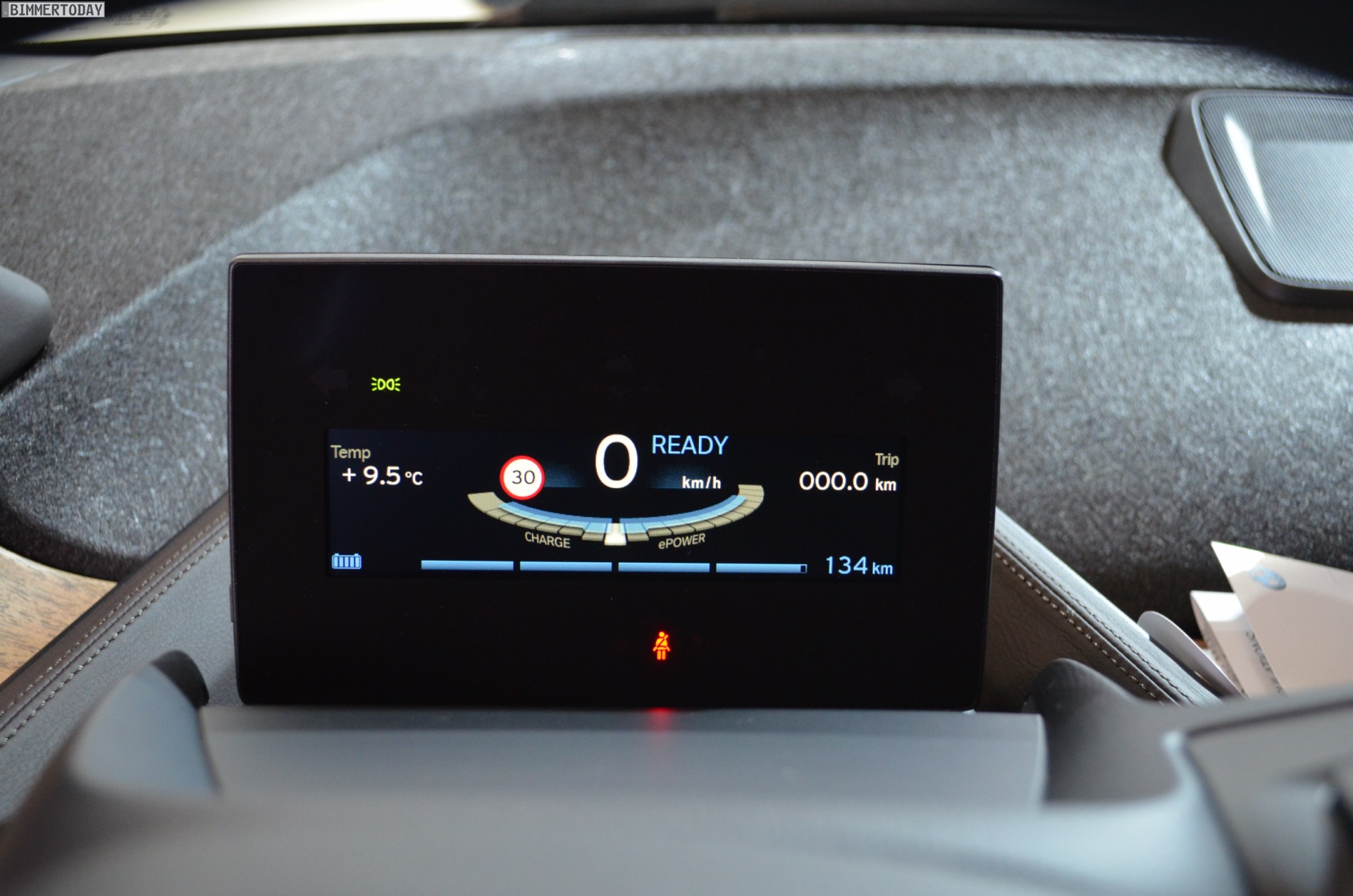 Nach dem Einsteigen sucht der BMW-Fahrer intuitiv nach dem Startknopf – und wird schließlich an einem zunächst gewöhnungsbedürftig anmutenden Bedienelement fündig, das rechts hinter dem Lenkrad aus der Lenksäule sprießt. Da der BMW i3 serienmäßig mit Automatik-Getriebe ausgerüstet ist, hat man allerdings nur selten Kontakt mit dem Hebel, der zum Starten und Stoppen des Motors sowie zum Wählen der Fahrtrichtung dient. Der Druck auf den Startknopf erweckt die beiden großen Displays im Innenraum zum Leben, ein READY-Schriftzug informiert über die Arbeitsbereitschaft des Stromers.