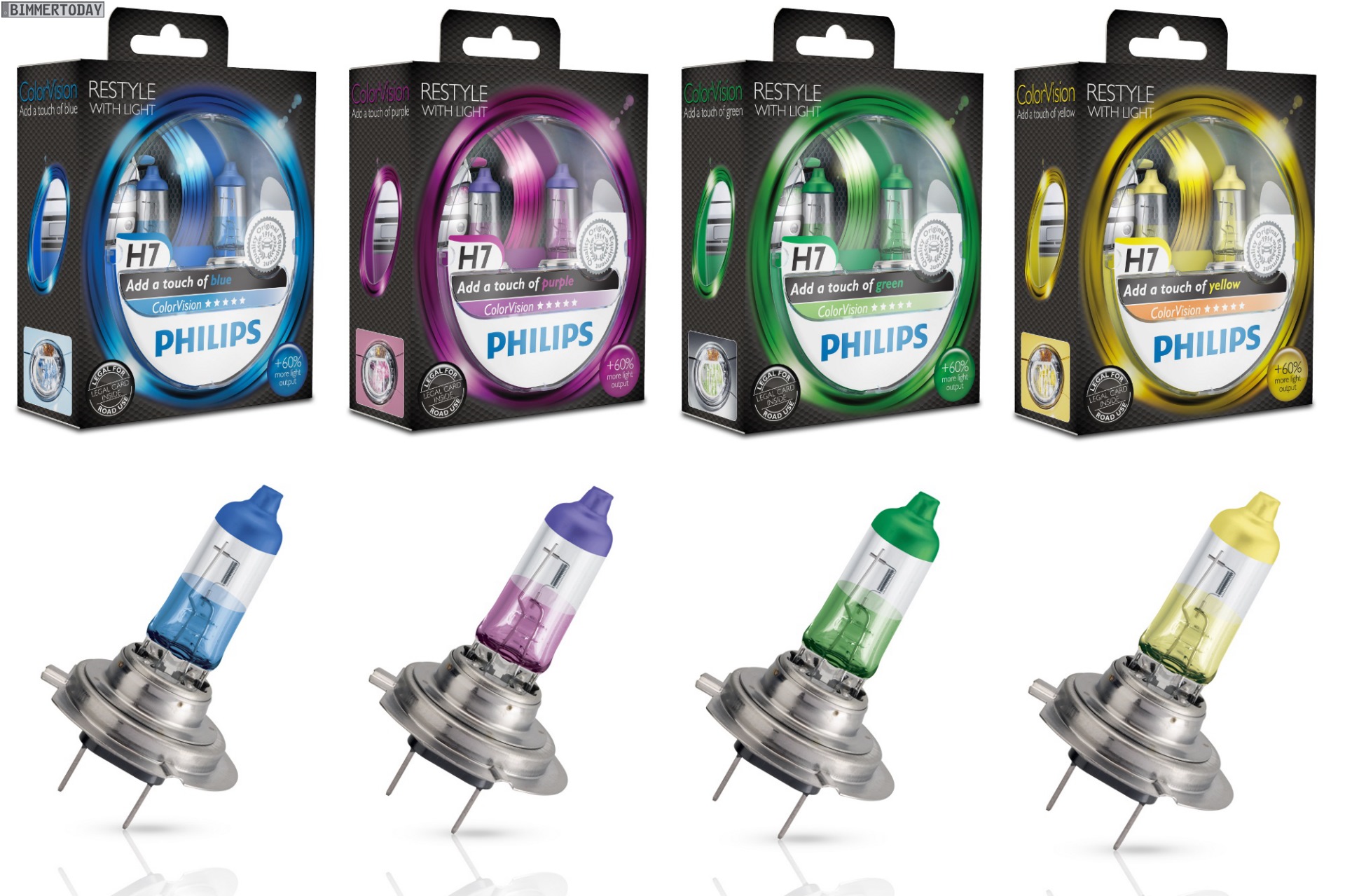 Die Lampen sind in den Varianten H7 und H4 erhältlich und uneingeschränkt für den Straßenverkehr zugelassen. Auf der Straße kommt ein helles, weißes Licht an und bietet bis zu 60 Prozent mehr Helligkeit als gewöhnliche Scheinwerfer – die Farbe ist nur in den Reflektoren der Scheinwerfer sichtbar.