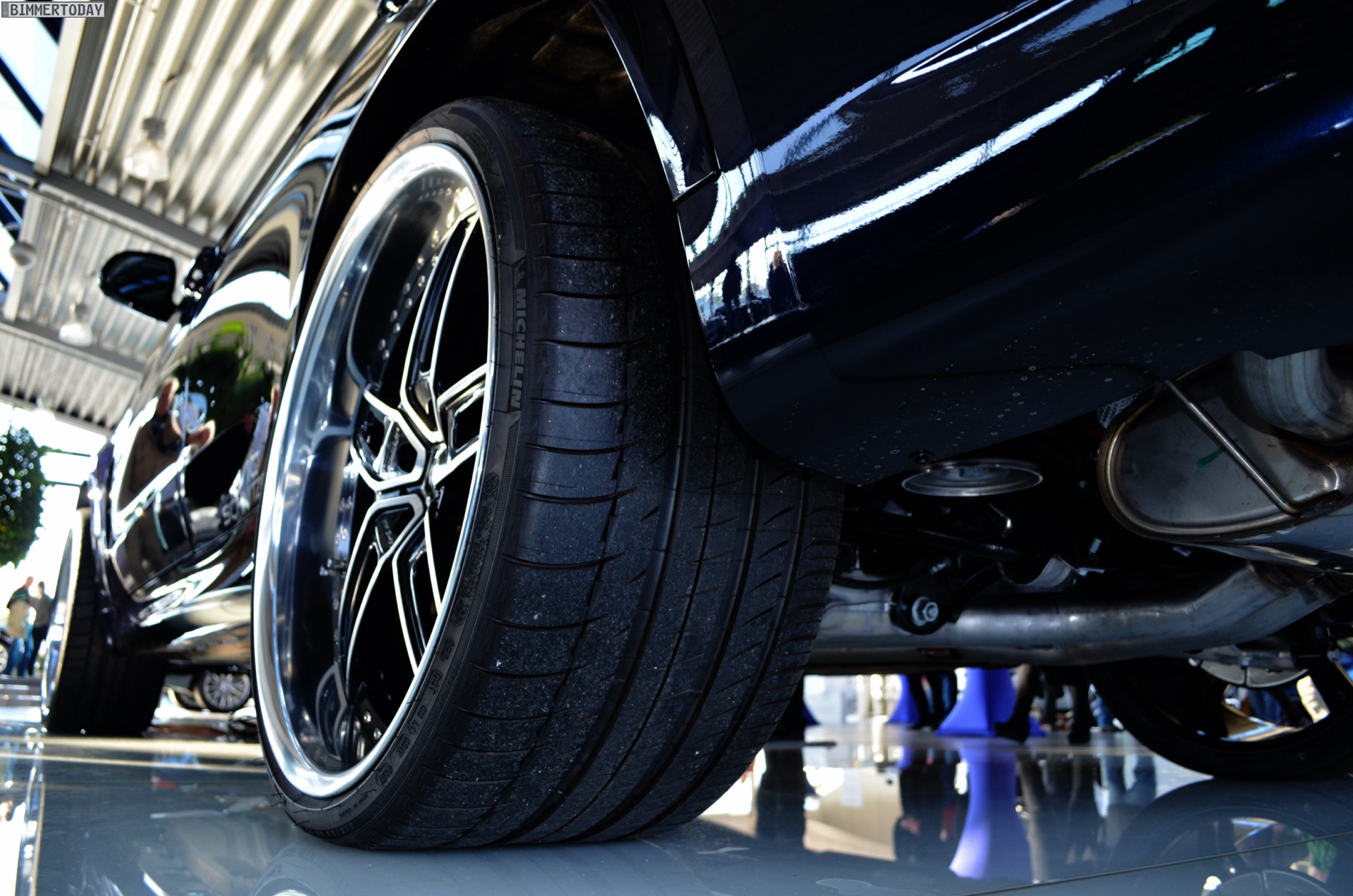 Beeindruckend sind auch die Reifen-Formate: Auf den 23 Zoll großen Schmiederädern vom Typ VIII (in Fahrtrichtung links) sind vorne und hinten 315 Millimeter breite Reifen montiert, auf der anderen Seite sind an der Hinterachse sogar Reifen im Format 335 / 25 ZR 22 montiert – mehr geht kaum.