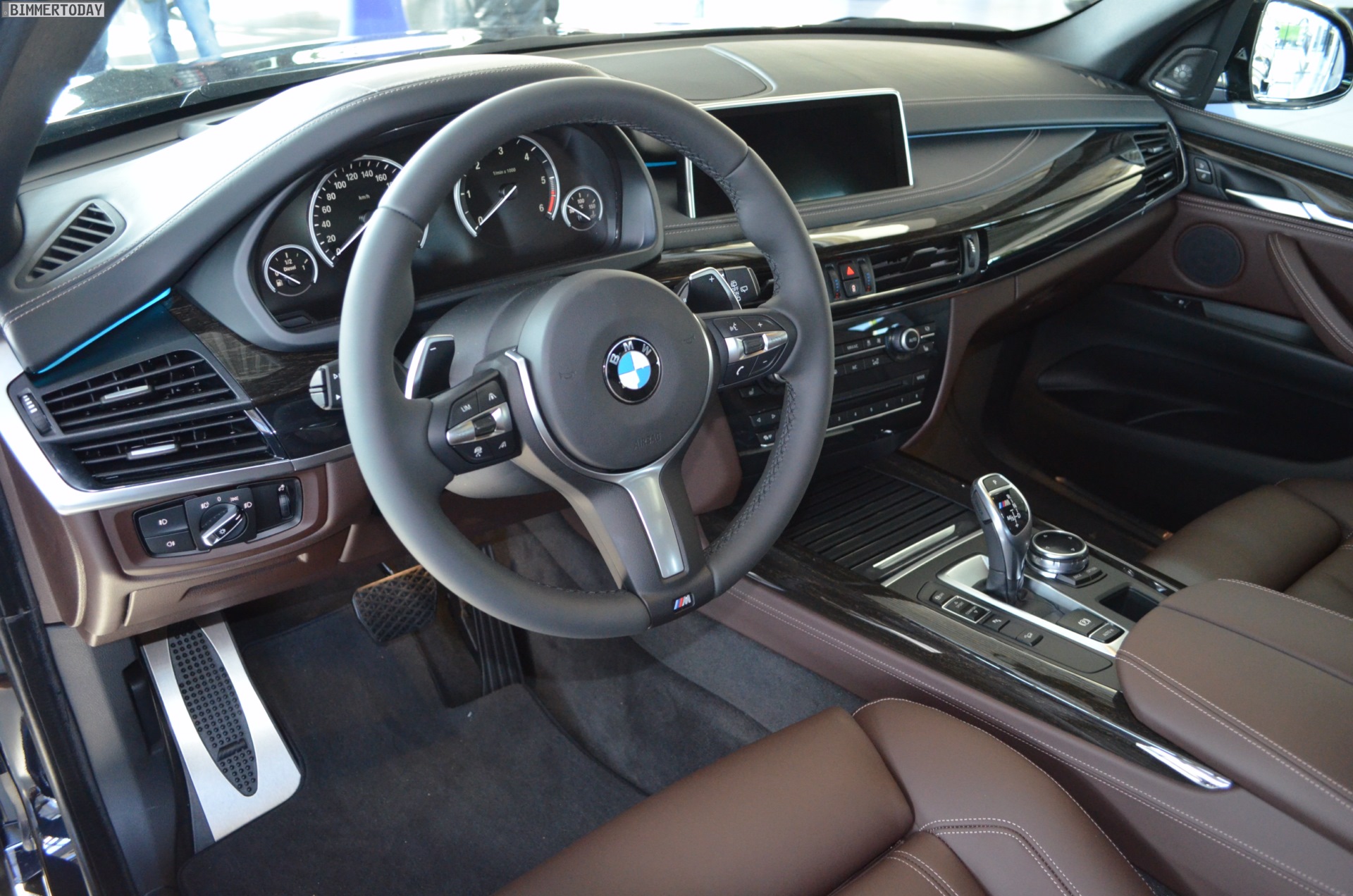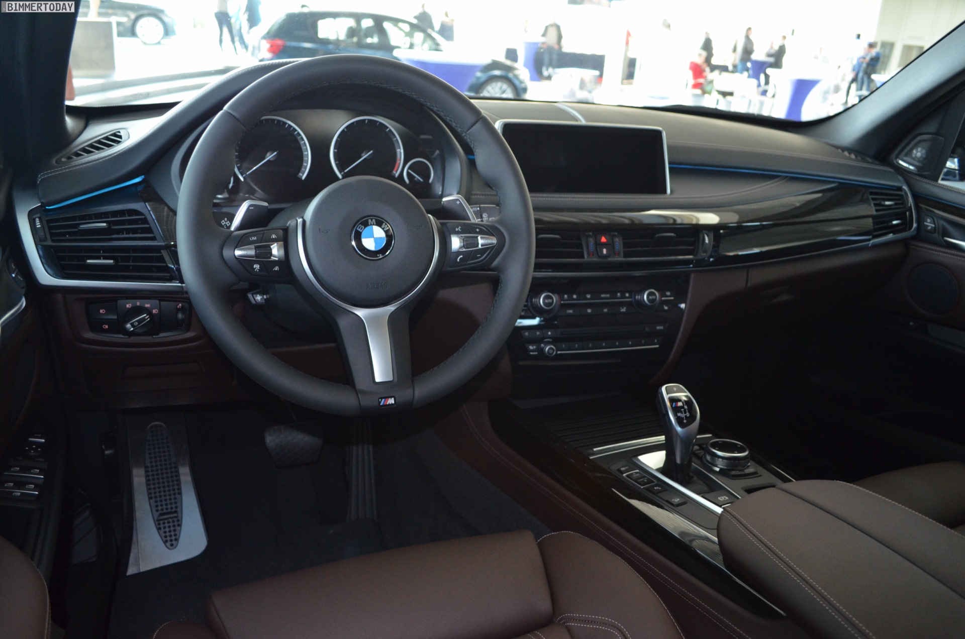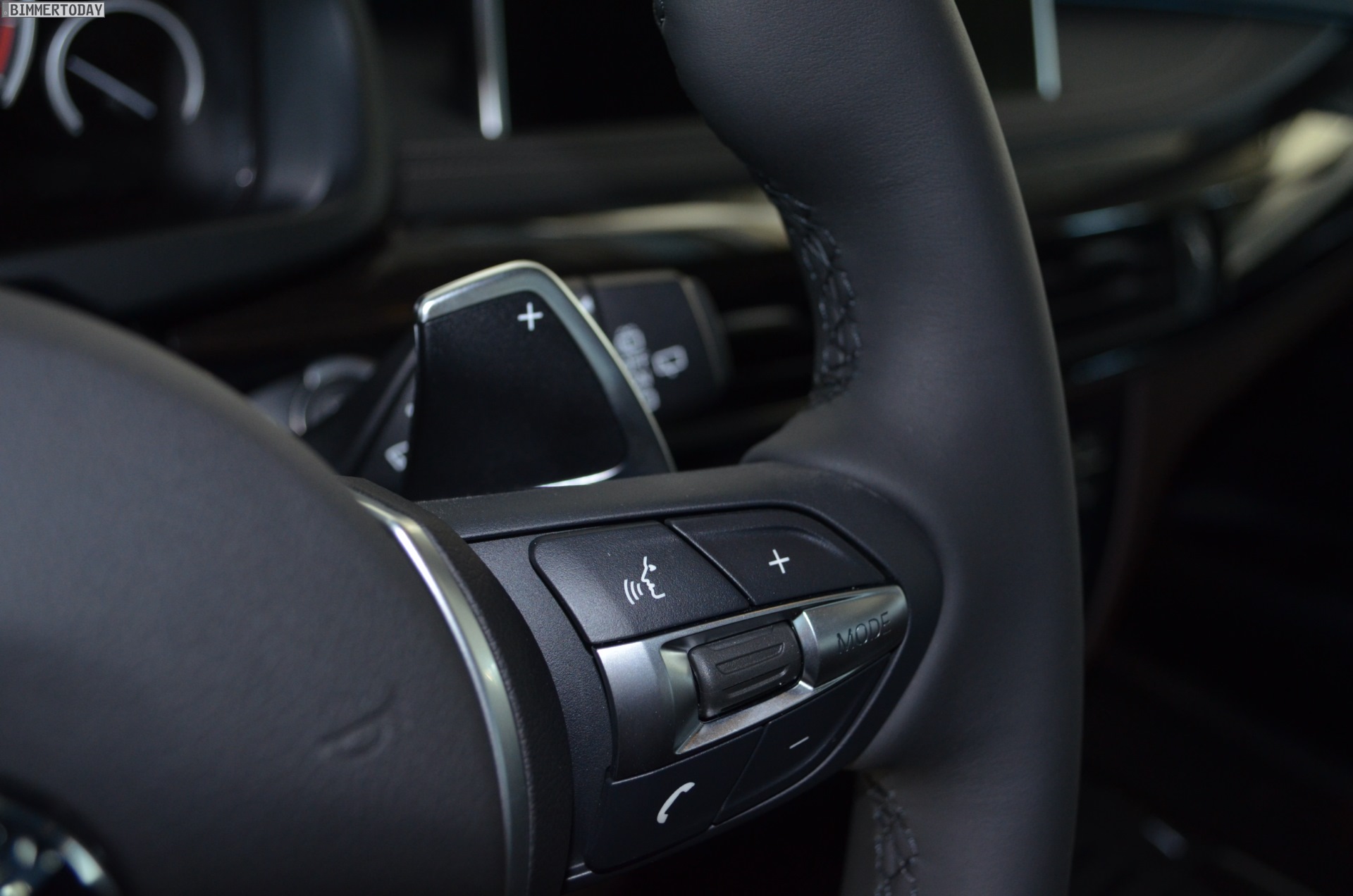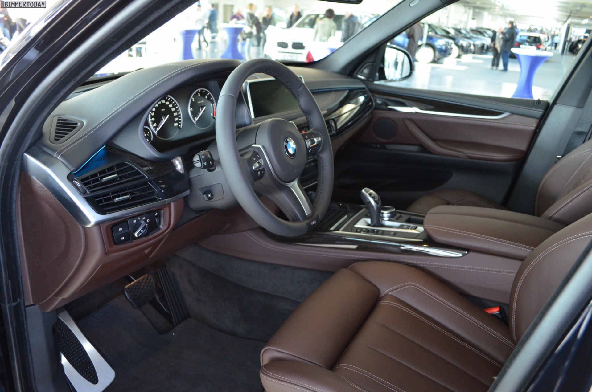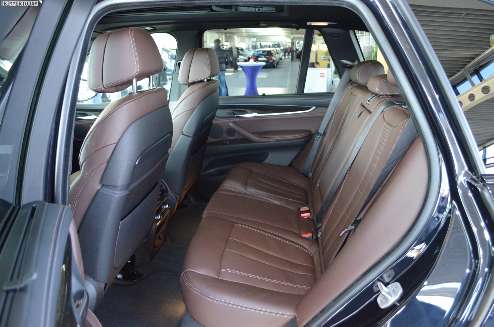 Wie alle BMW X5 M50d mit Triturbo-Diesel trägt auch das ausgestellte Exemplar das M Sportpaket, bei der Farbe handelt es sich um Carbonschwarz Metallic. Im Innenraum sehen wir neben dem filigran gezeichneten M Sportlenkrad auch die hochwertige Ausstattung Exklusivleder Nappa mit erweiterten Umfängen in der Farbe Mokka sowie die Edelholzausführung Amerikanische Eiche.