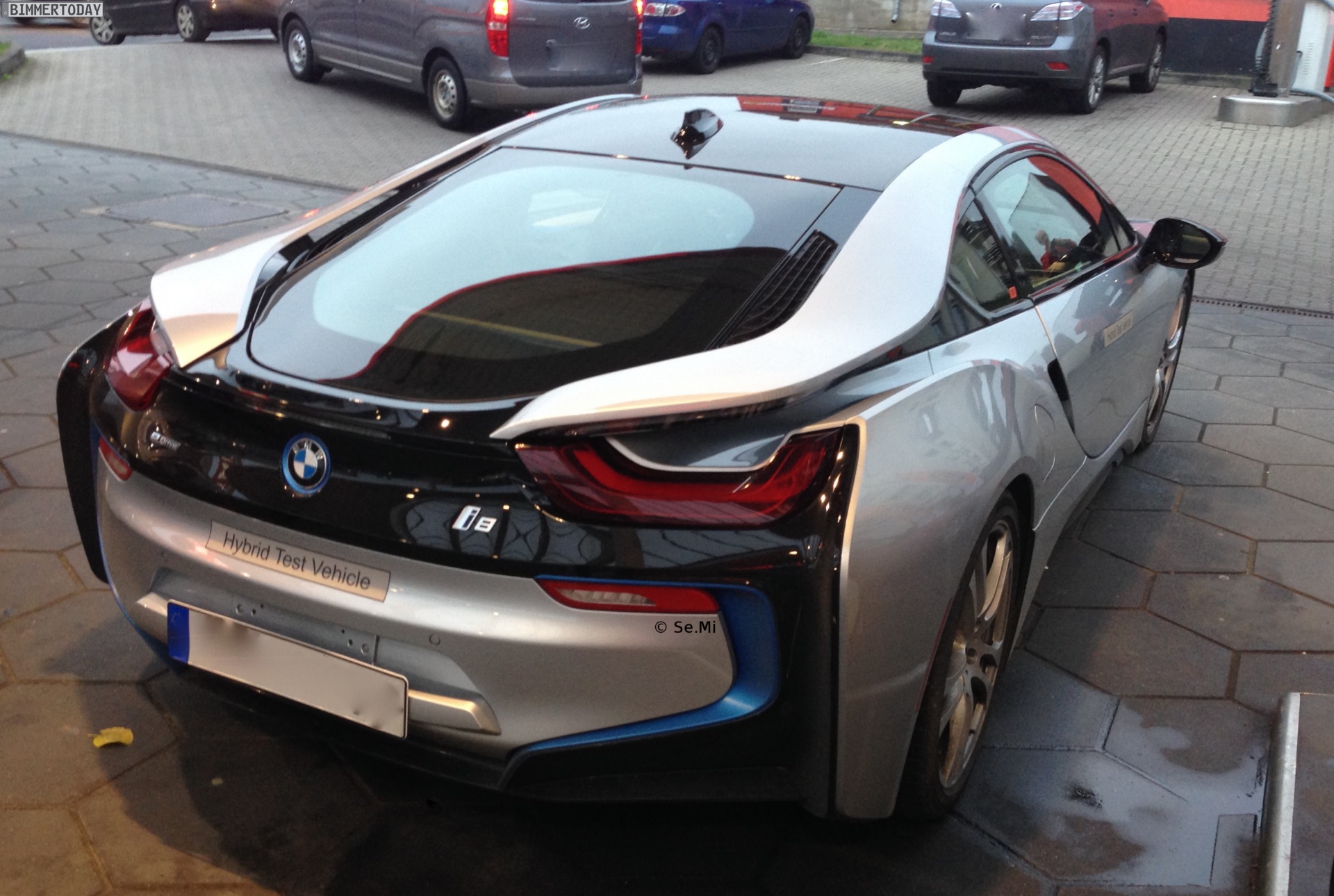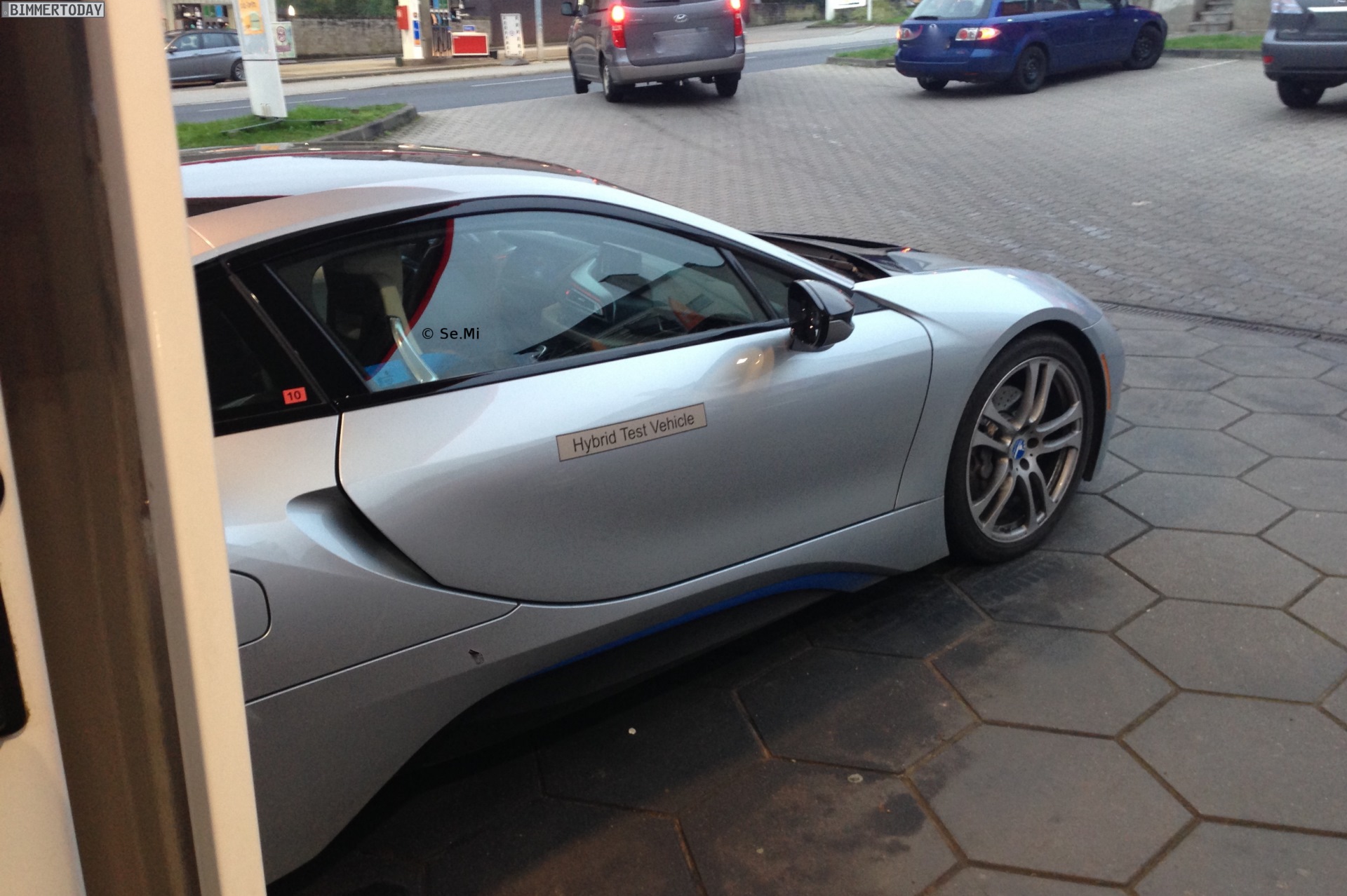 Weil der Testfahrer gerade erst neuen Kraftstoff für den Turbo-Dreizylinder im Heck getankt hatte und sich zum Bezahlen in der Tankstelle aufhielt, bot sich die Gelegenheit für einige etwas detaillierte Fotos. Zu sehen ist der BMW i8 in Ionic Silver mit Akzenten in BMW i Blau, die zusätzlichen Reflektoren in Orange machen ihn außerdem als US-Version erkennbar.