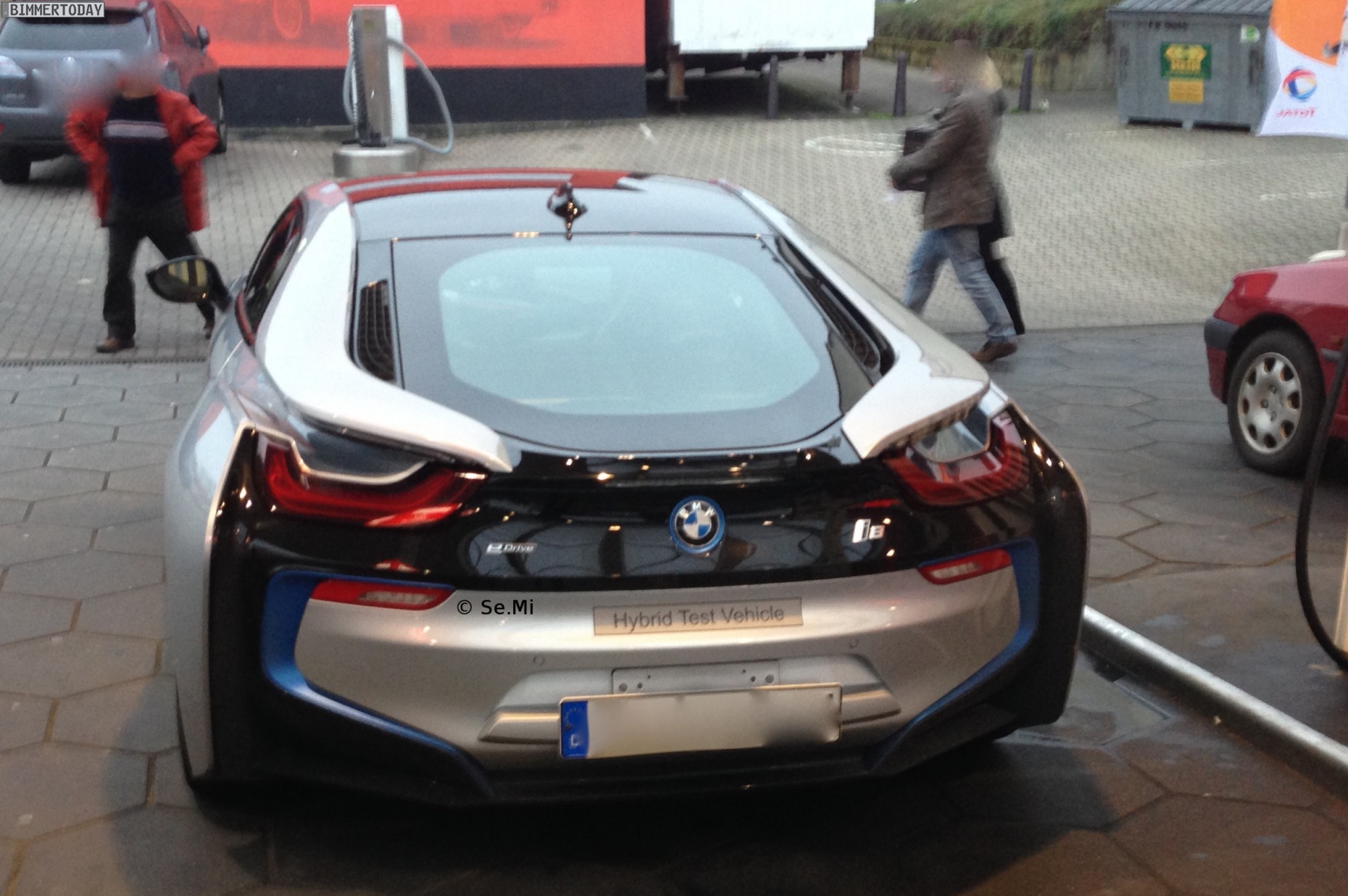 Auch einige Wochen nach seiner gefeierten Weltpremiere auf der IAA 2013 ist ein BMW i8 ohne Tarnung ein sehr interessanter Anblick, der nicht nur die Aufmerksamkeit unseres Lesers Se.Mi magisch anzieht. Der Hybrid-Sportwagen erinnert selbst bei alltäglichen Erledigungen an der Tankstelle eher an einen Science Fiction-Film als an ein Auto, das im ersten Halbjahr 2014 in den Handel kommt.