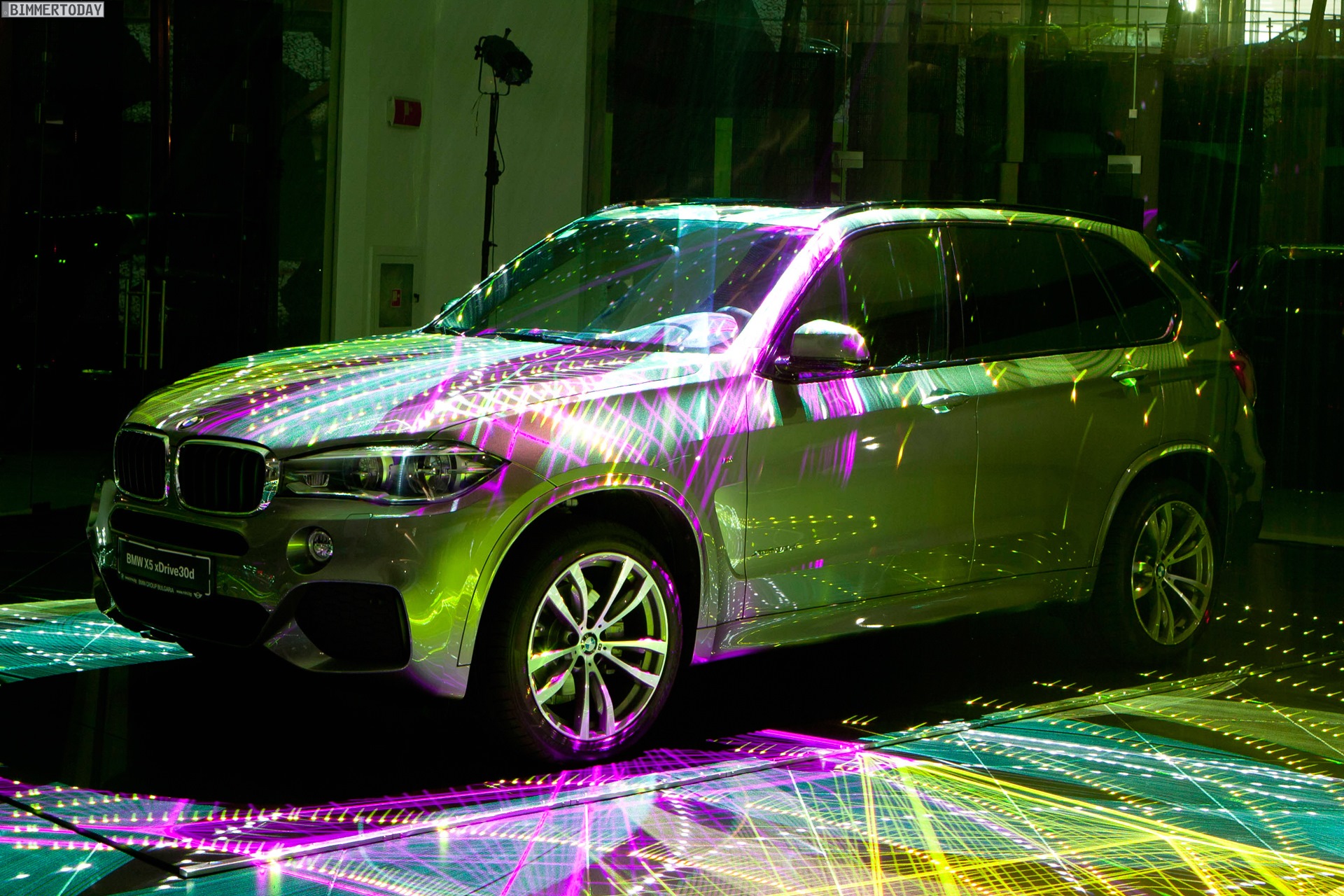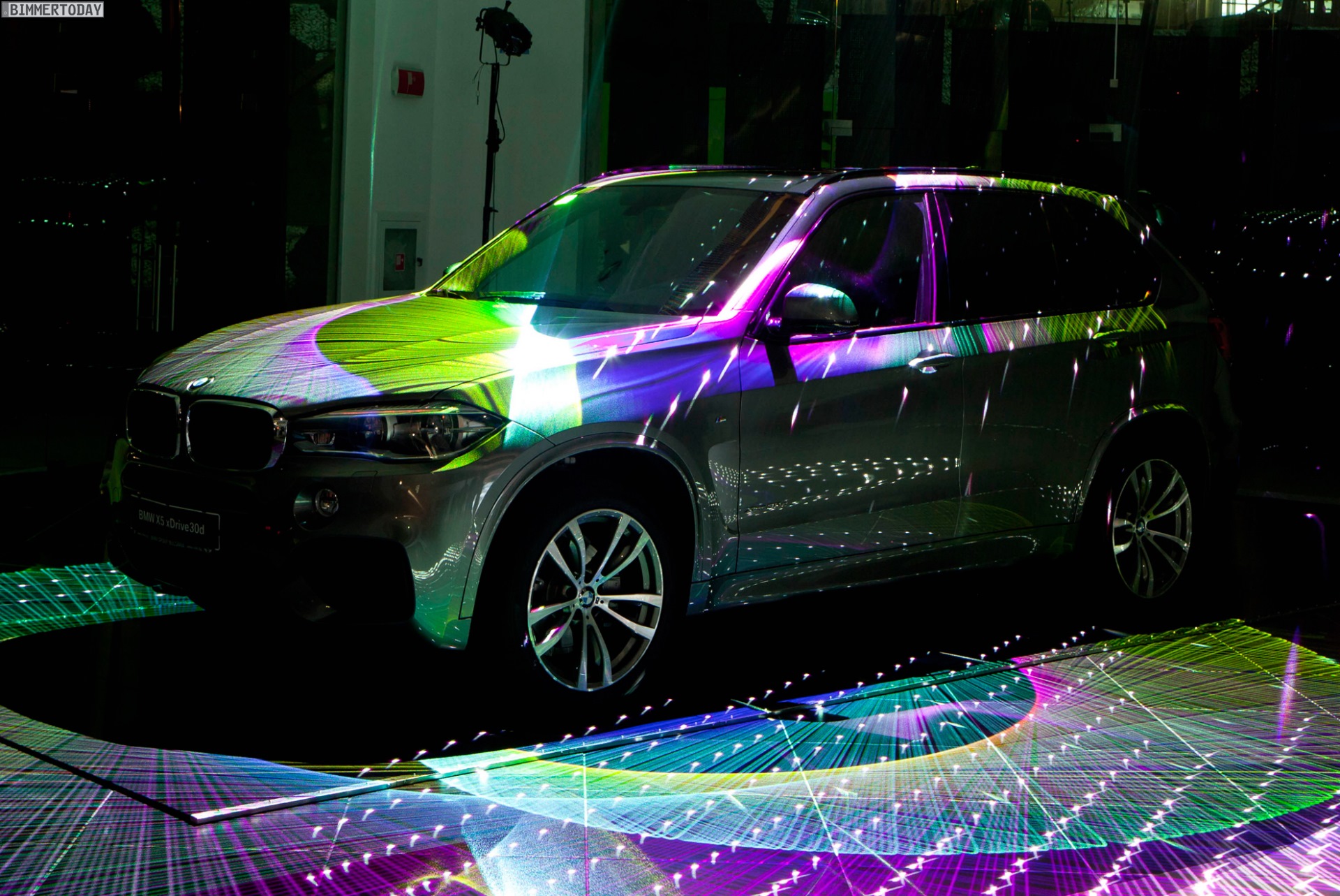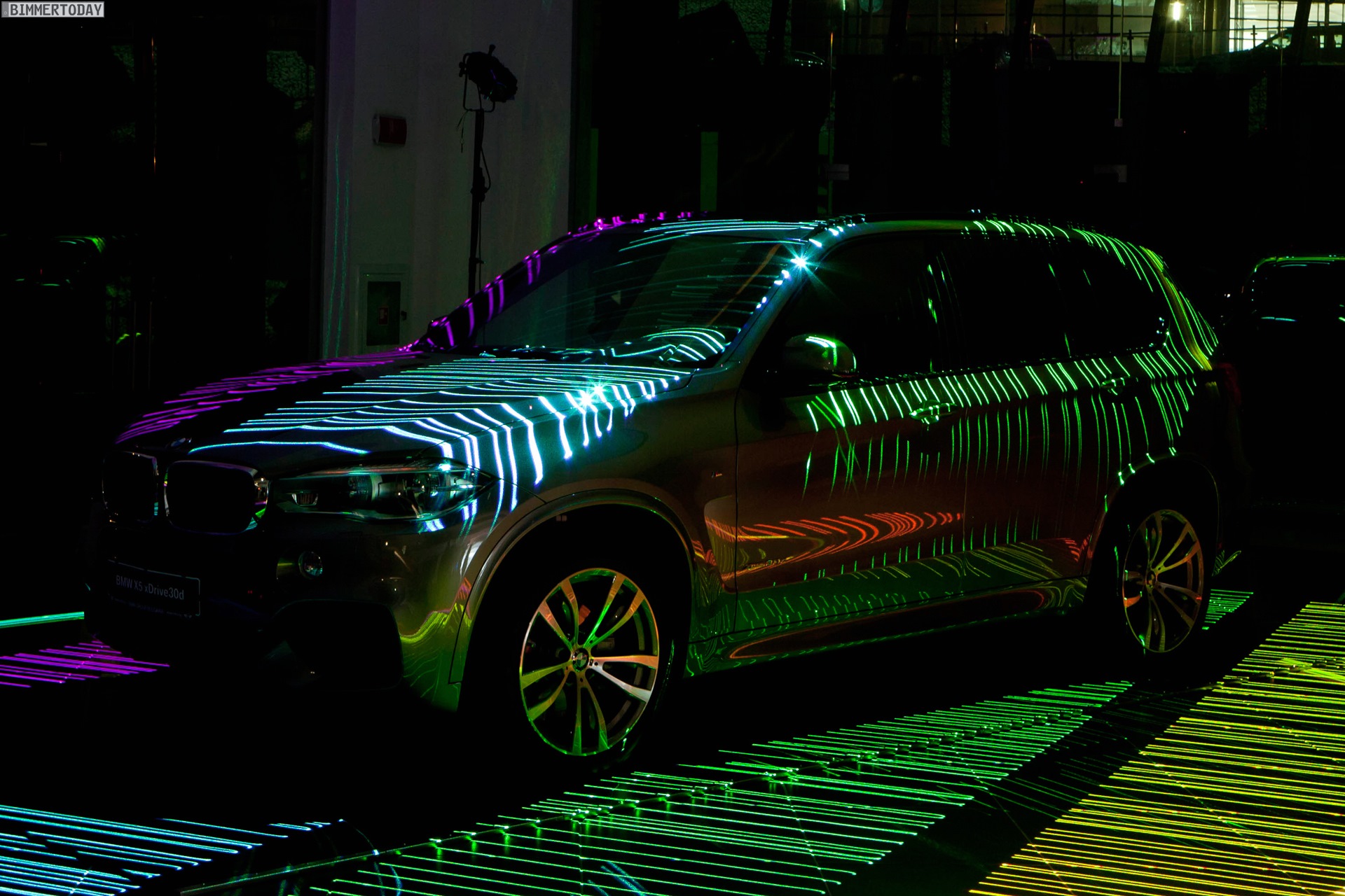 Grundlage für das Licht-Spiel ist ein BMW X5 xDrive30d mit M Sportpaket, dessen bei normalem Licht recht unaufällige Lackierung in Silber für kurze Zeit komplett in den Hintergrund rückt und Platz für ein farbenfrohes Spektakel schafft.