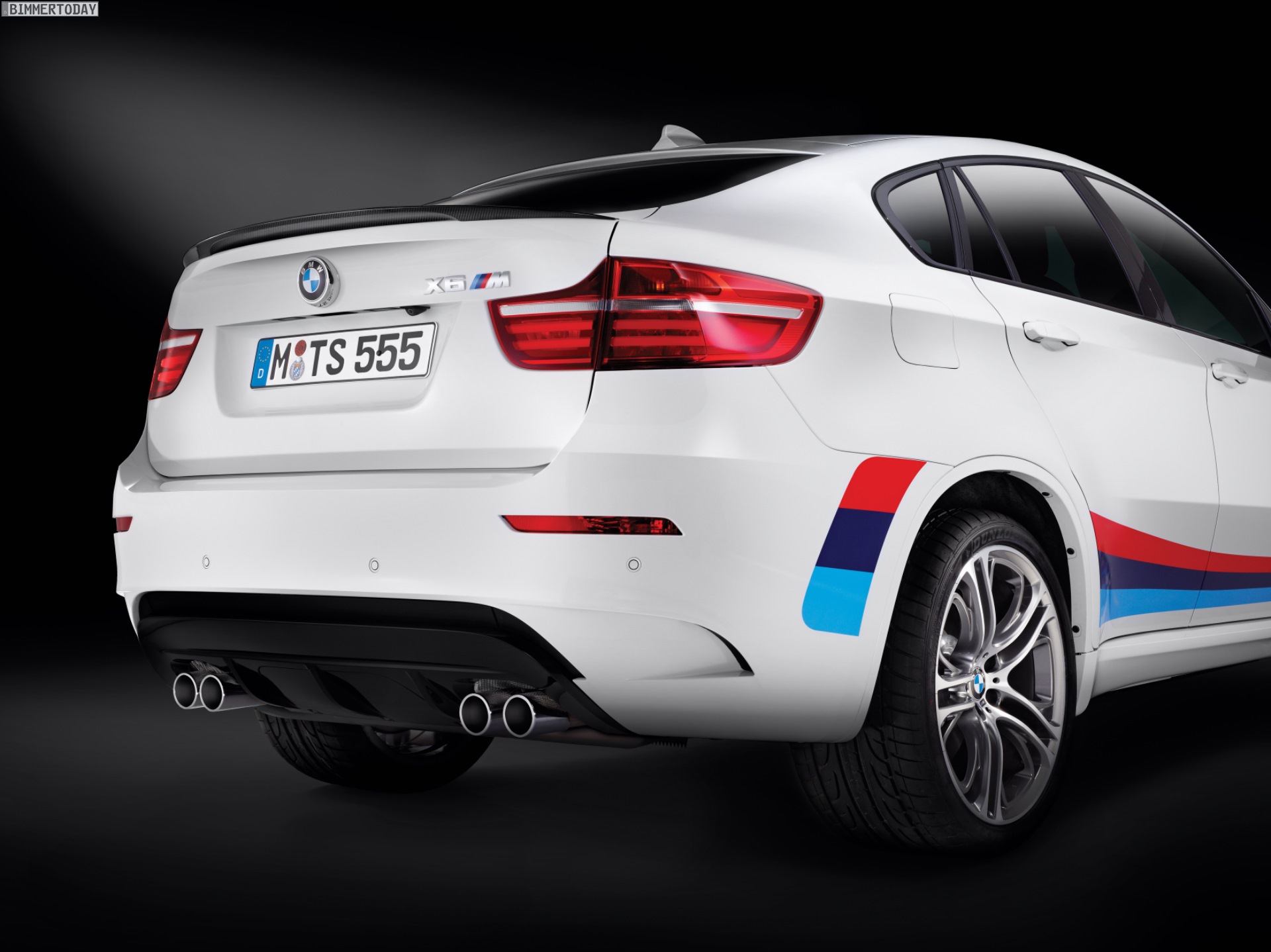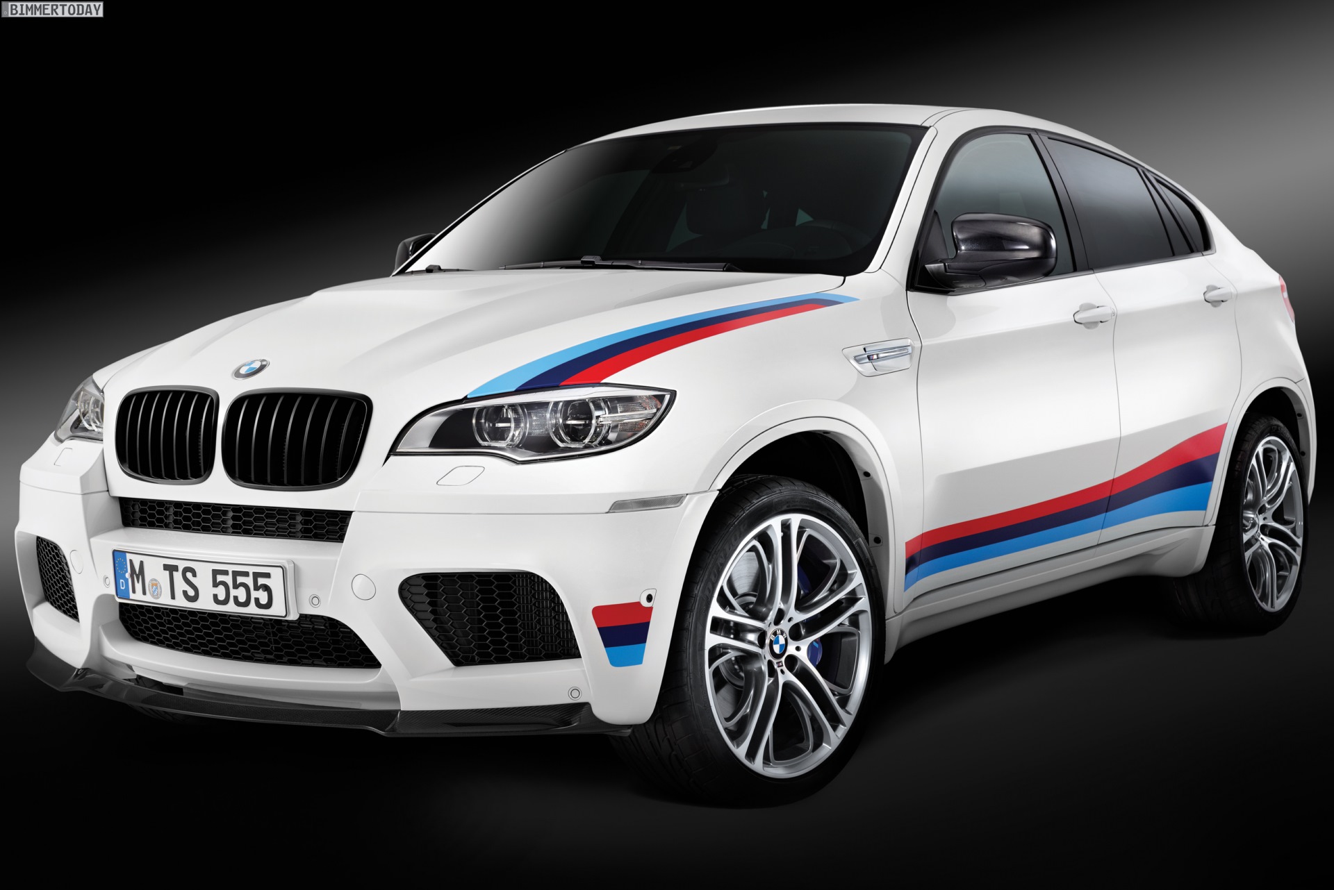 Als Lackierung stehen nur die Farben Alpinweiss, Melbourne Rot und Saphirschwarz zur Wahl. Optisch unterscheidet sich die BMW X6 M Design Edition außerdem dank Frontsplitter und Heckspoiler aus Carbon, schwarzen Nieren und Außenspiegelkappen sowie einem schwarz eingefärbten Diffusor von der Serie. Genau wie die Aerodynamik-Elemente stammen auch die 21 Zoll großen Leichtmetallräder (Doppelspeiche 310 M) aus dem Zubehör-Programm von BMW M Performance. Auf Wunsch gibt es die abgebildete BMW M Performance Beklebung in den Farben der M GmbH, die besonders mit weißer Lackierung Motorsport pur ausstrahlt.