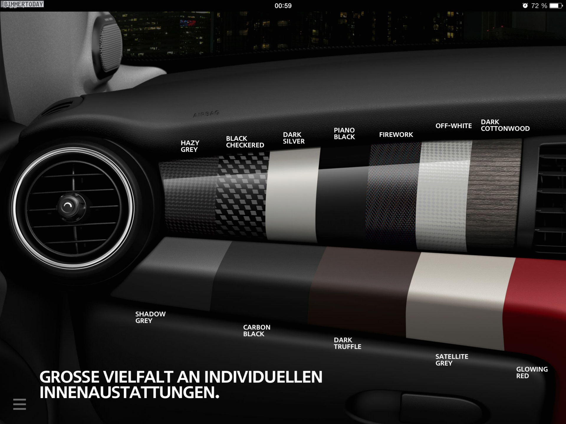 Auch wenn der ehemalige Center Speedo nun nicht mehr zum Anzeigen der Geschwindigkeit dient, kommt ihm so auch in Zukunft eine wichtige Rolle für das Fahrerlebnis zu – wenn der Kunde die entsprechenden Kreuzchen in der MINI F56-Preisliste gesetzt hat. Ein weiterer Screenshot zeigt die vielen verschiedenen Interieurleisten auf einem einzigen Bild.