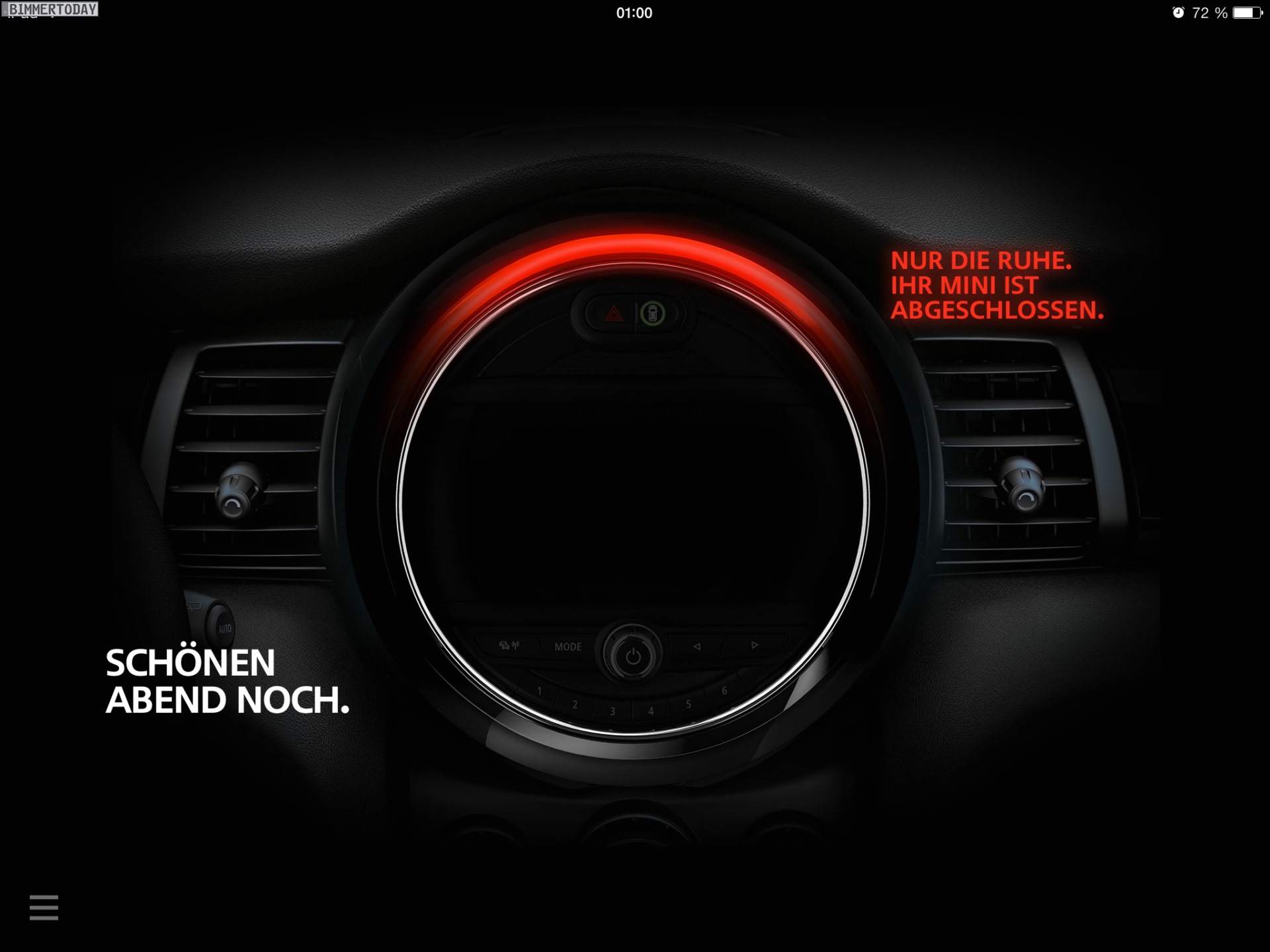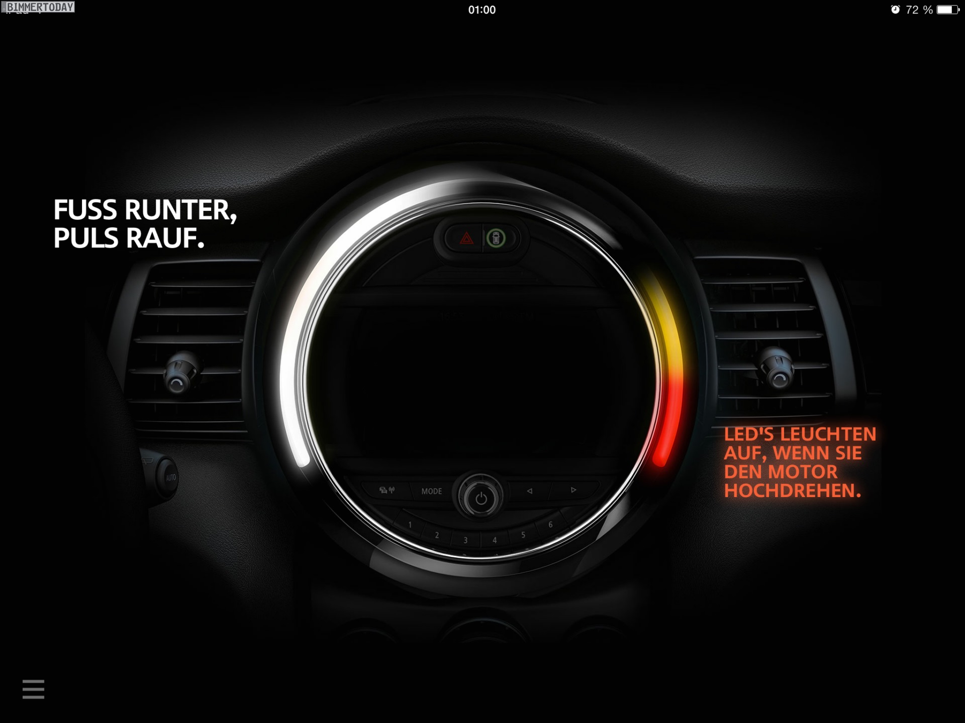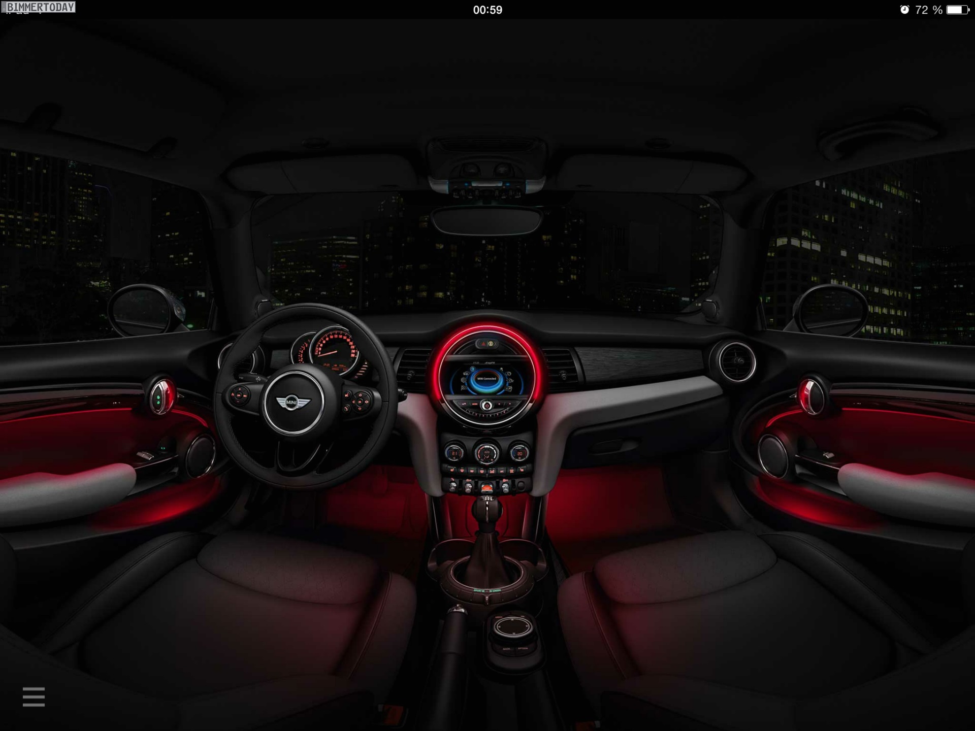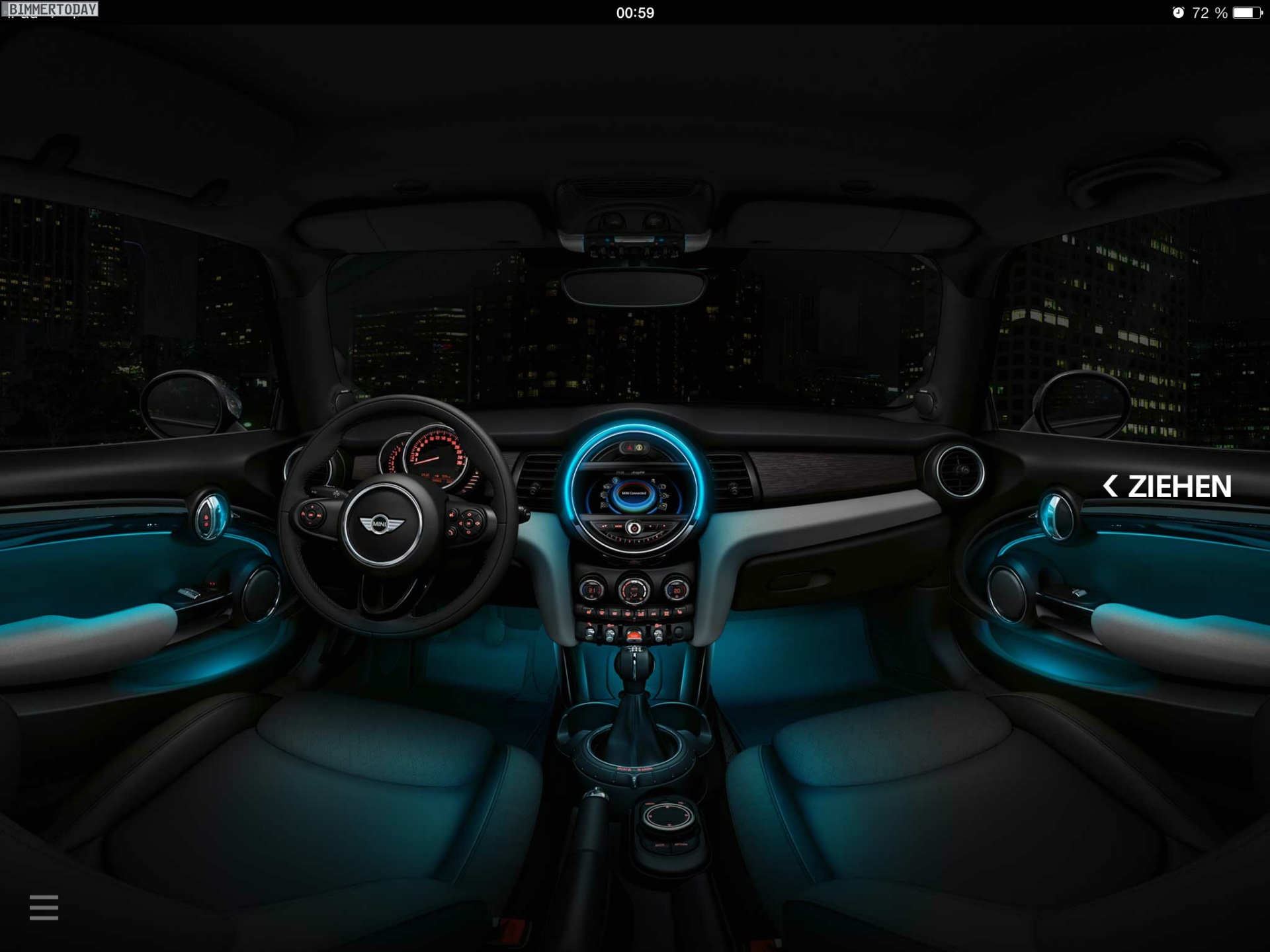 Detaillierter als auf der normalen Website zeigt sich der MINI F56 in der eigens für ihn erstellten App, die sich speziell an die Besitzer von Tablets richtet. Einer unserer Leser hat uns mit Screenshots versorgt, die einige Seiten der iPad App zum MINI F56 zeigen und dabei die farbige LED-Technik rund um das zentrale Infotainment-Display in den Fokus rücken.