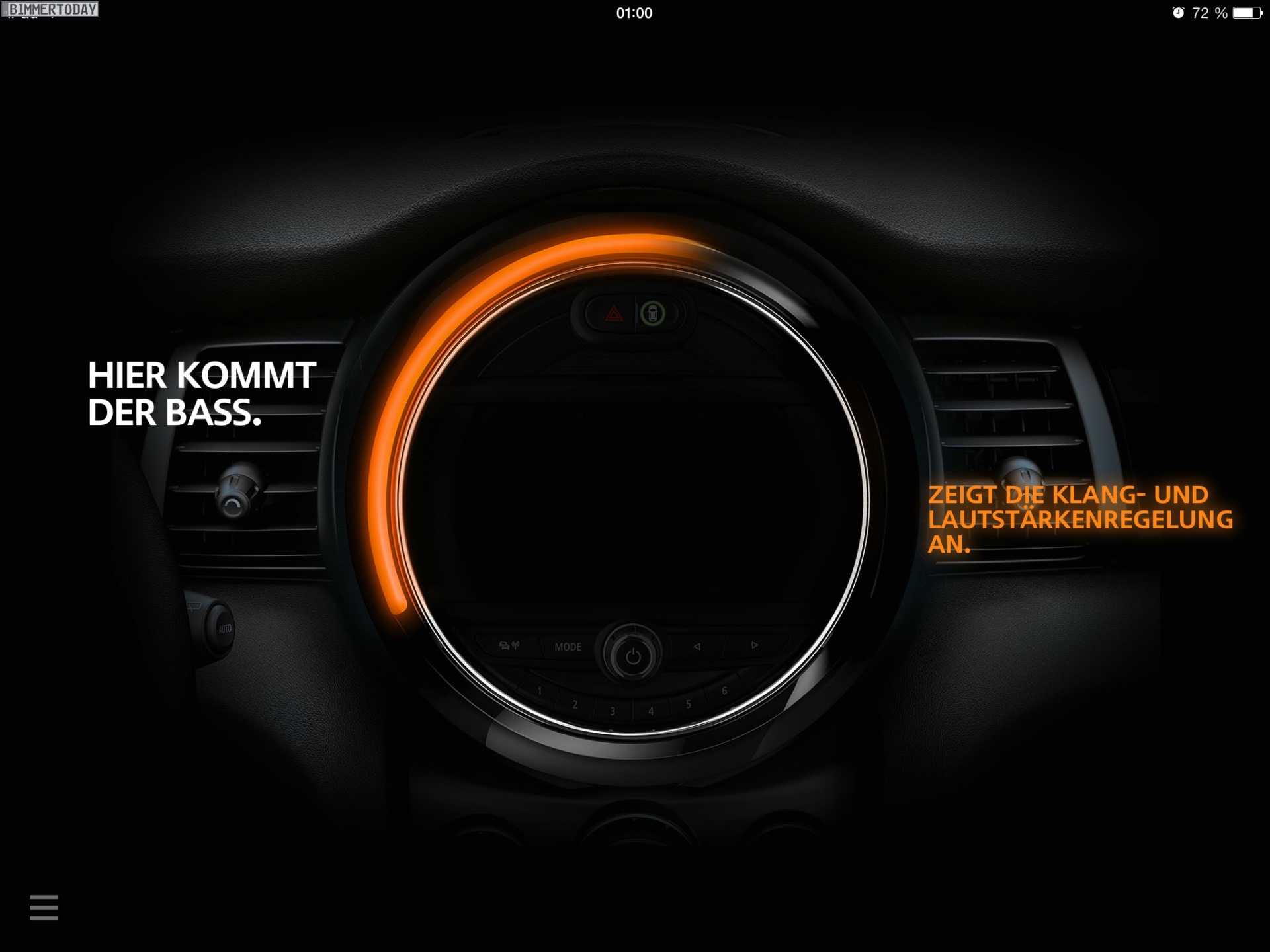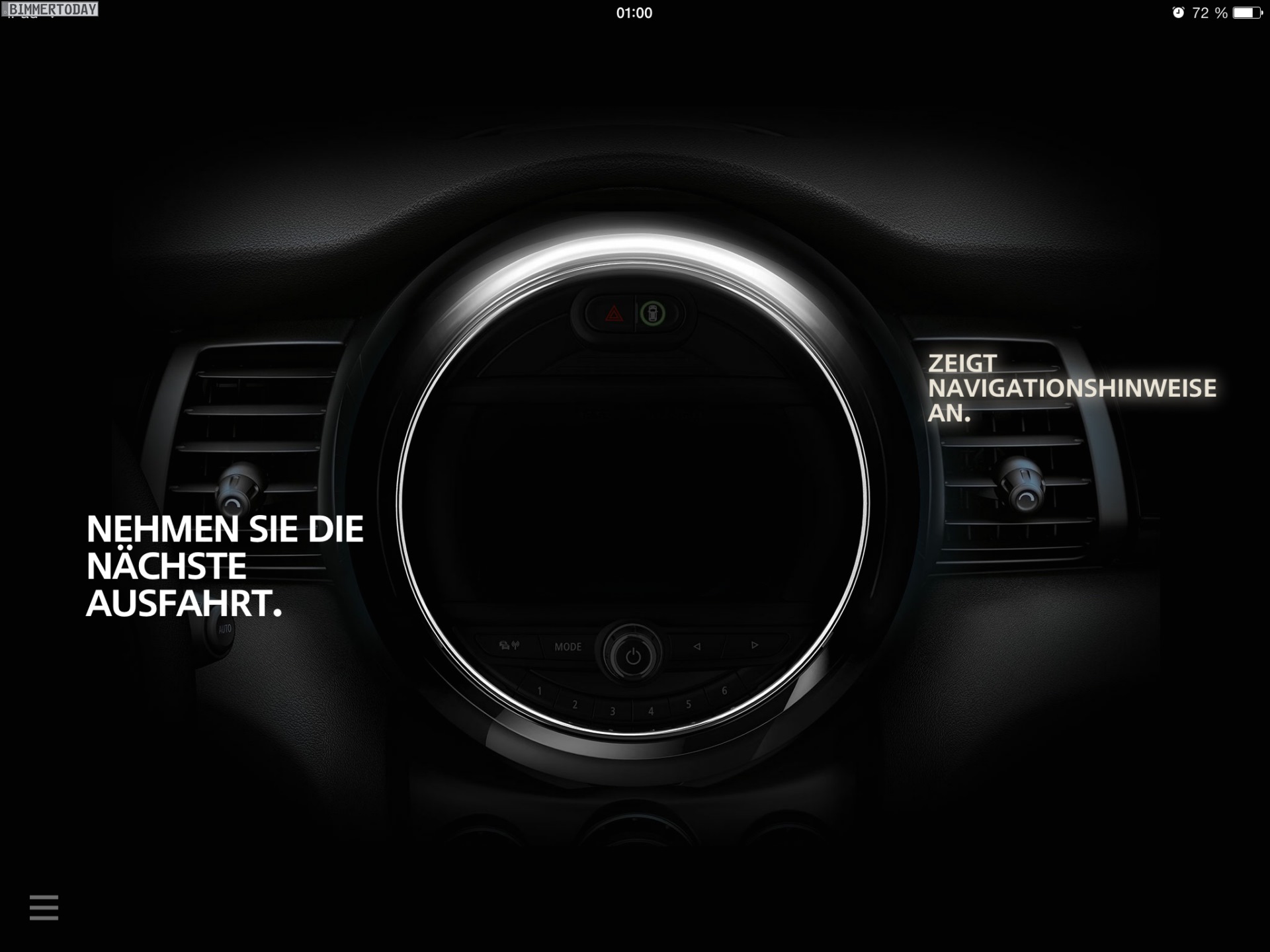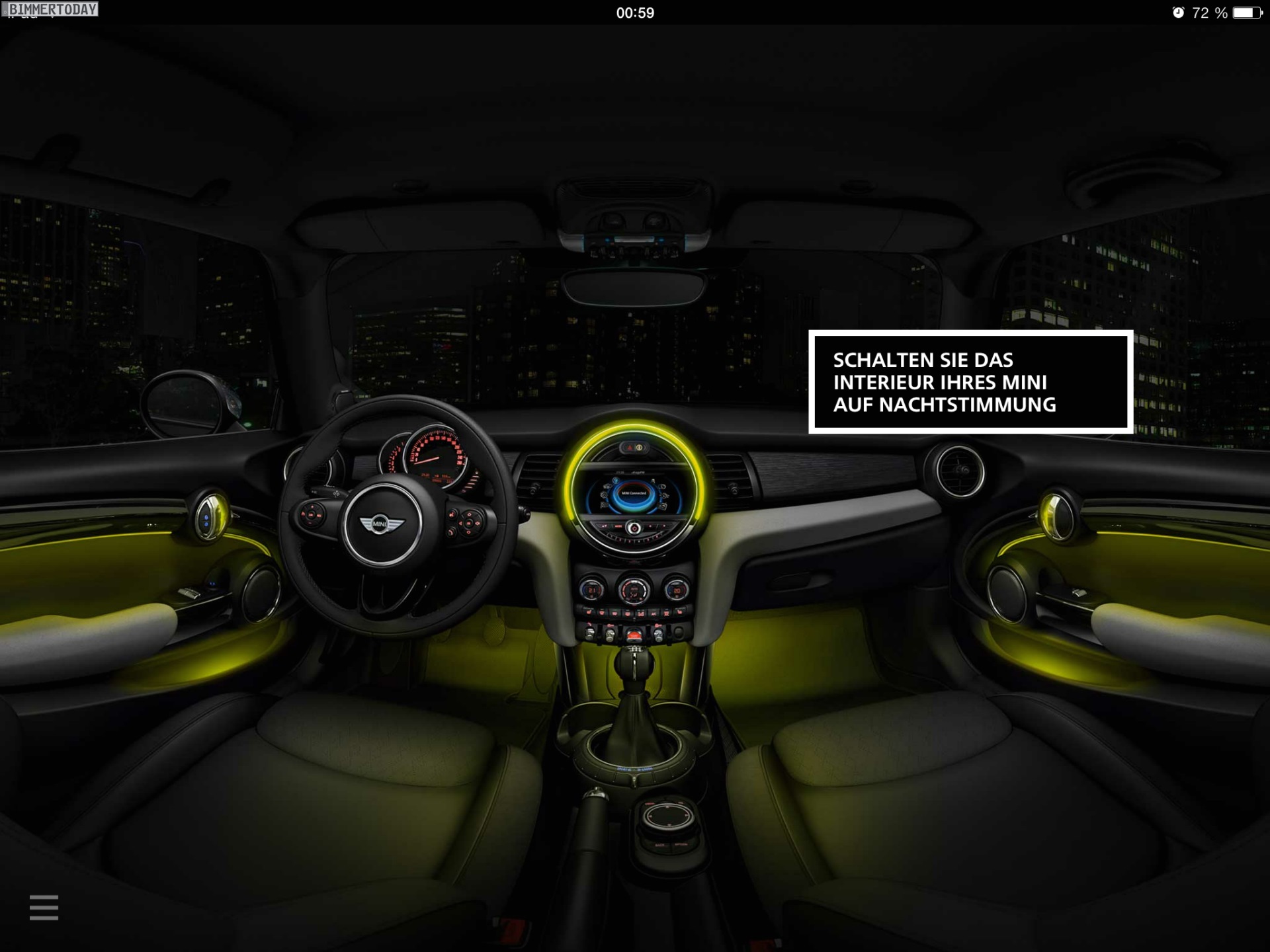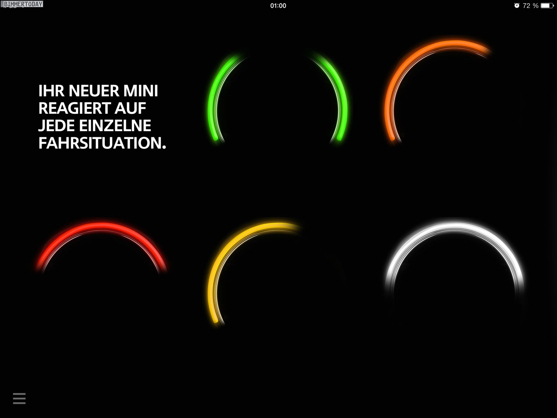 Detaillierter als auf der normalen Website zeigt sich der MINI F56 in der eigens für ihn erstellten App, die sich speziell an die Besitzer von Tablets richtet. Einer unserer Leser hat uns mit Screenshots versorgt, die einige Seiten der iPad App zum MINI F56 zeigen und dabei die farbige LED-Technik rund um das zentrale Infotainment-Display in den Fokus rücken.