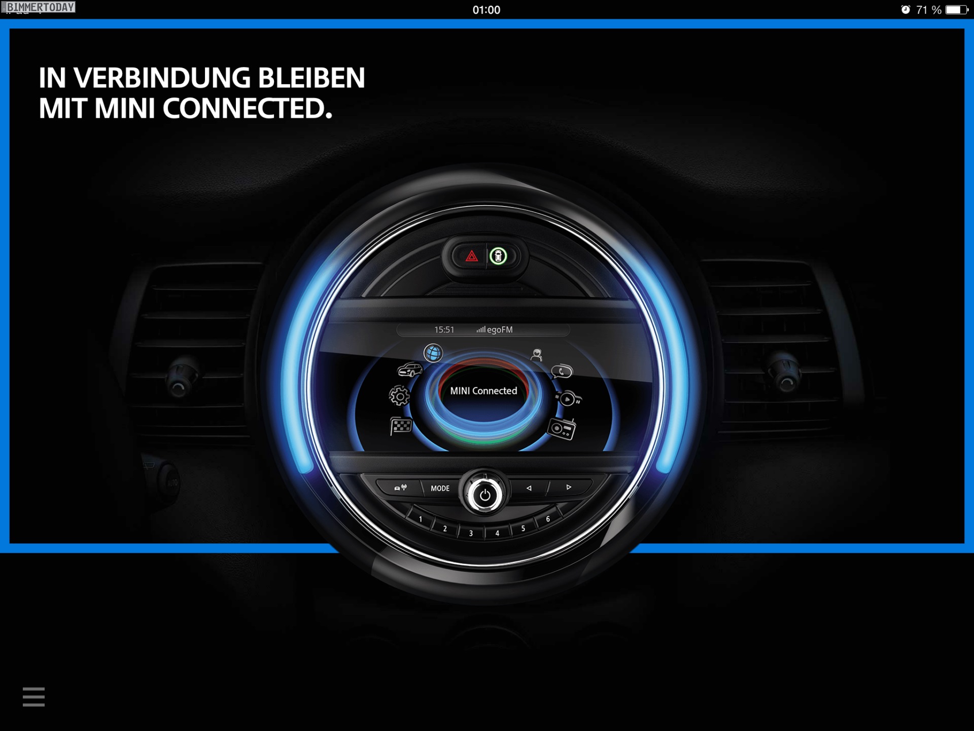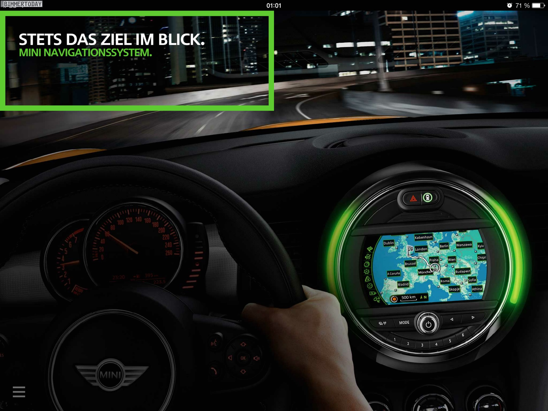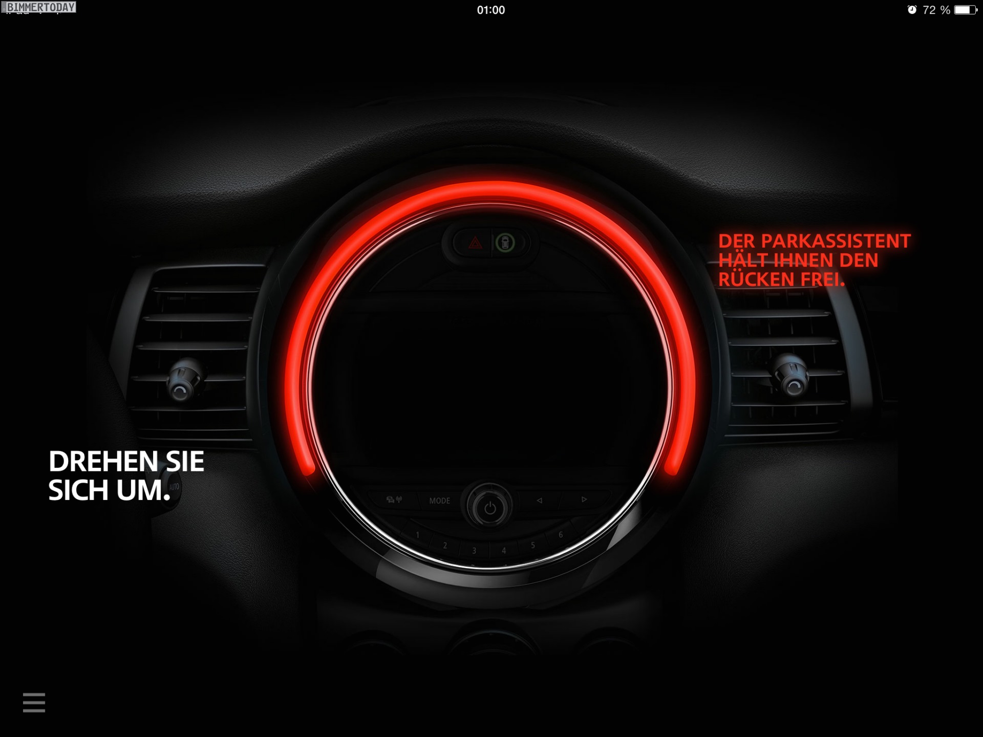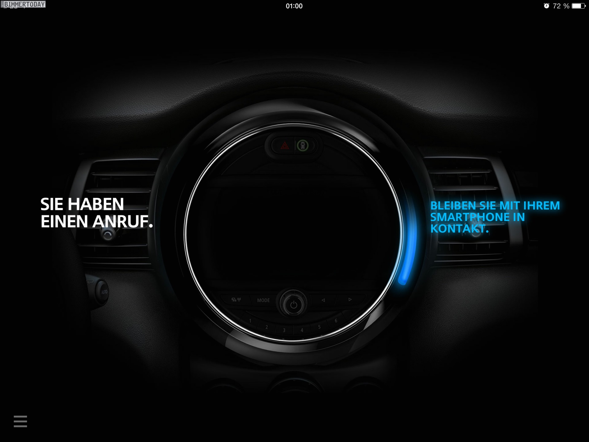 Detaillierter als auf der normalen Website zeigt sich der MINI F56 in der eigens für ihn erstellten App, die sich speziell an die Besitzer von Tablets richtet. Einer unserer Leser hat uns mit Screenshots versorgt, die einige Seiten der iPad App zum MINI F56 zeigen und dabei die farbige LED-Technik rund um das zentrale Infotainment-Display in den Fokus rücken.