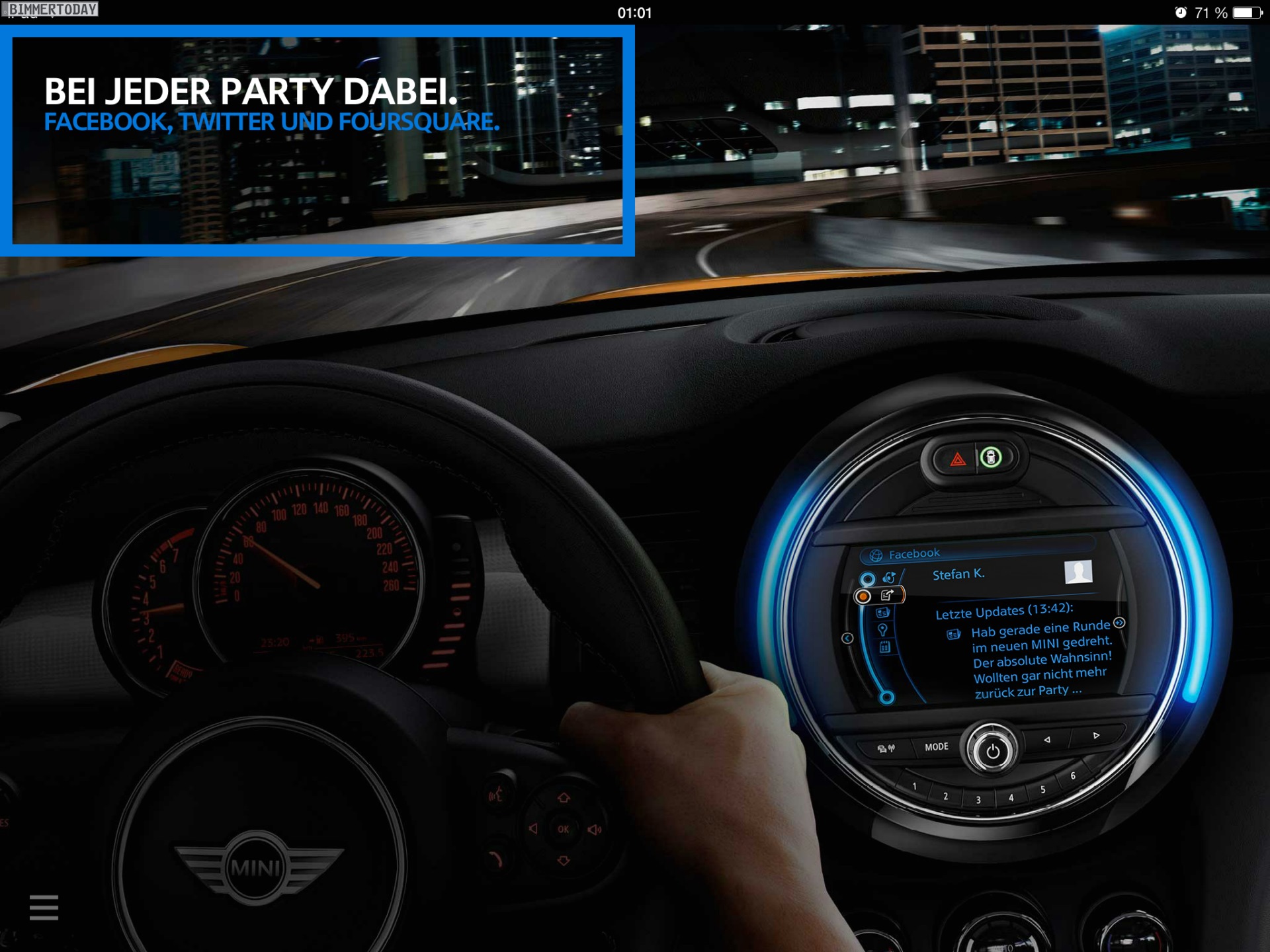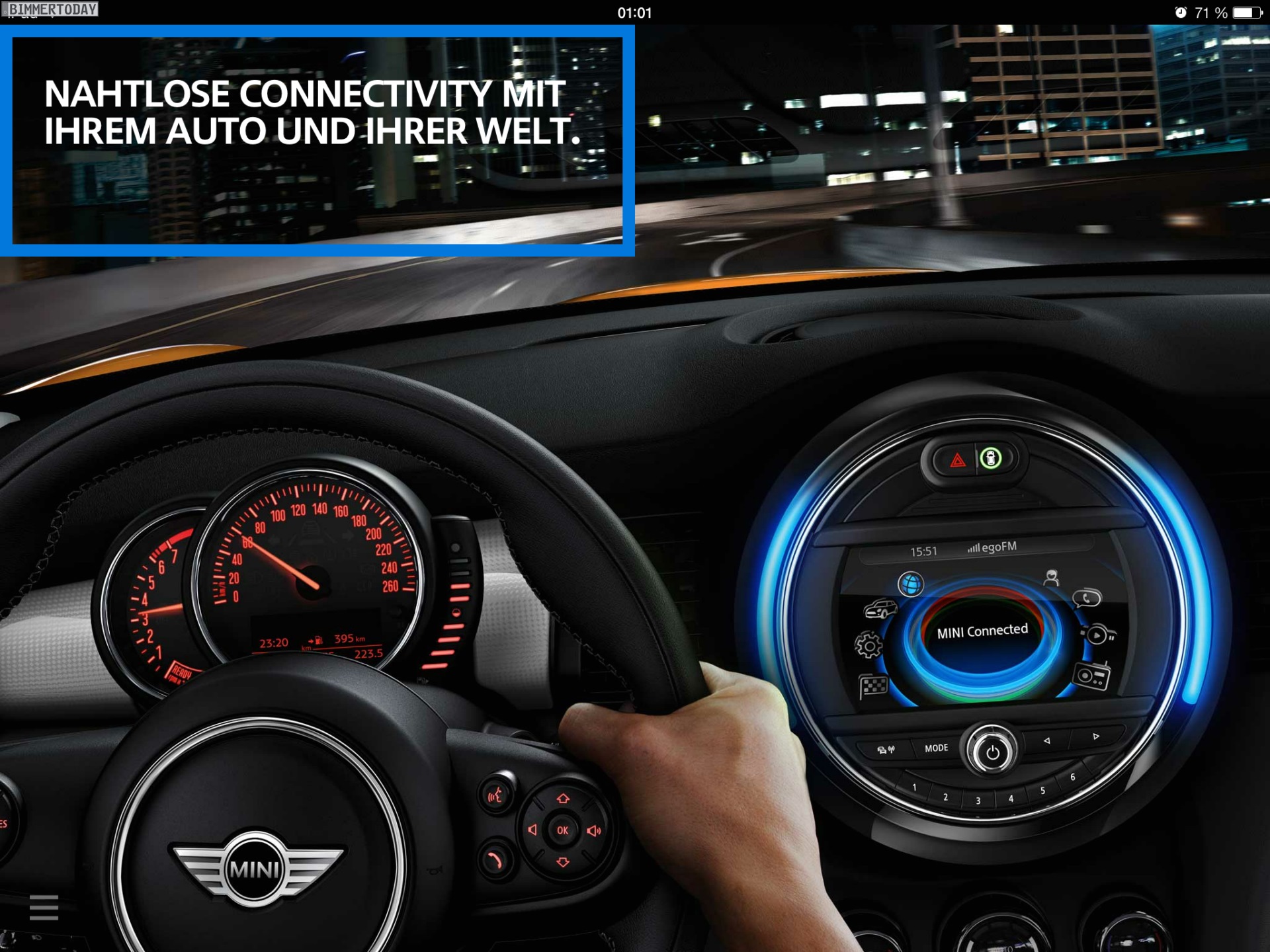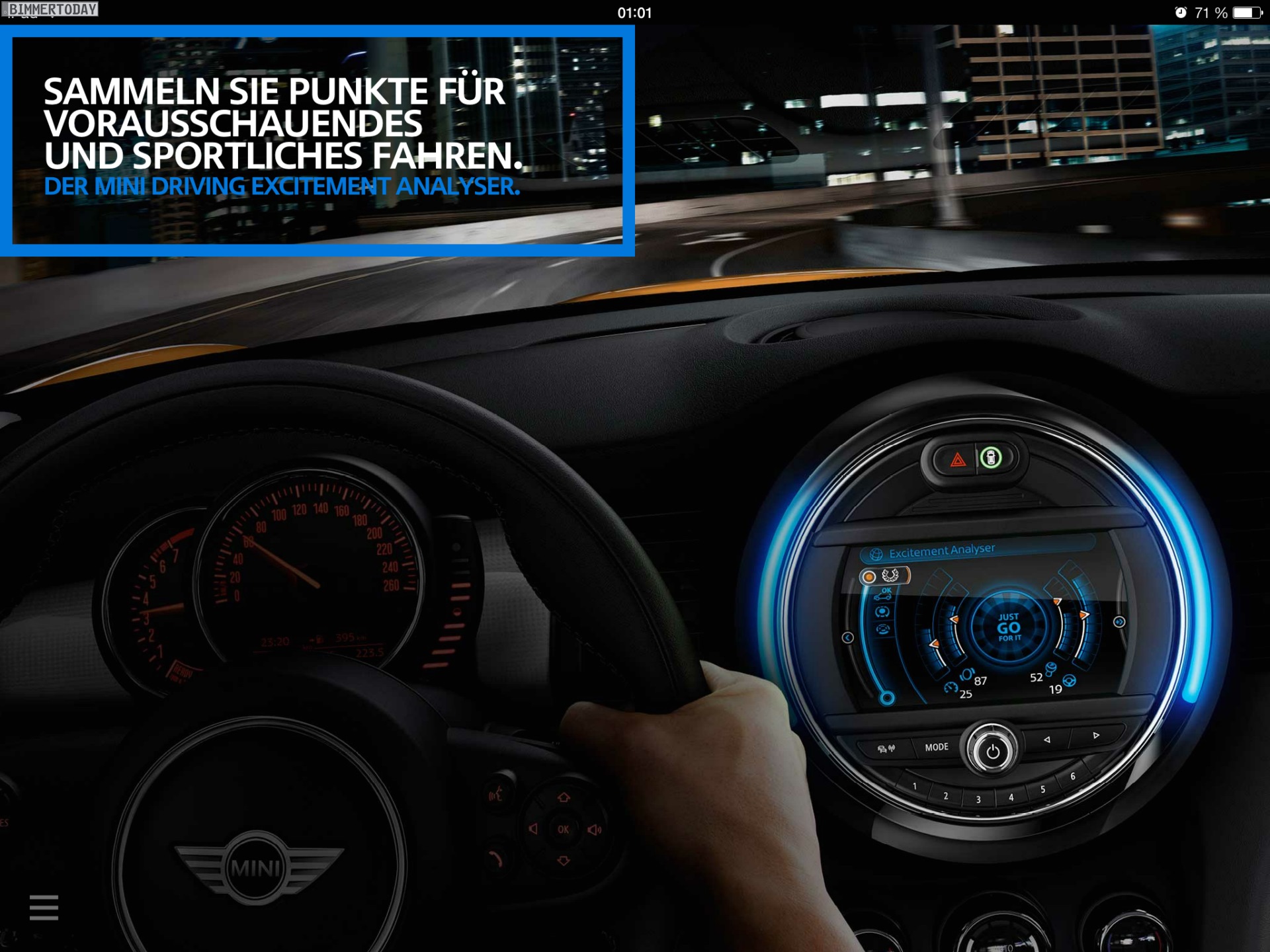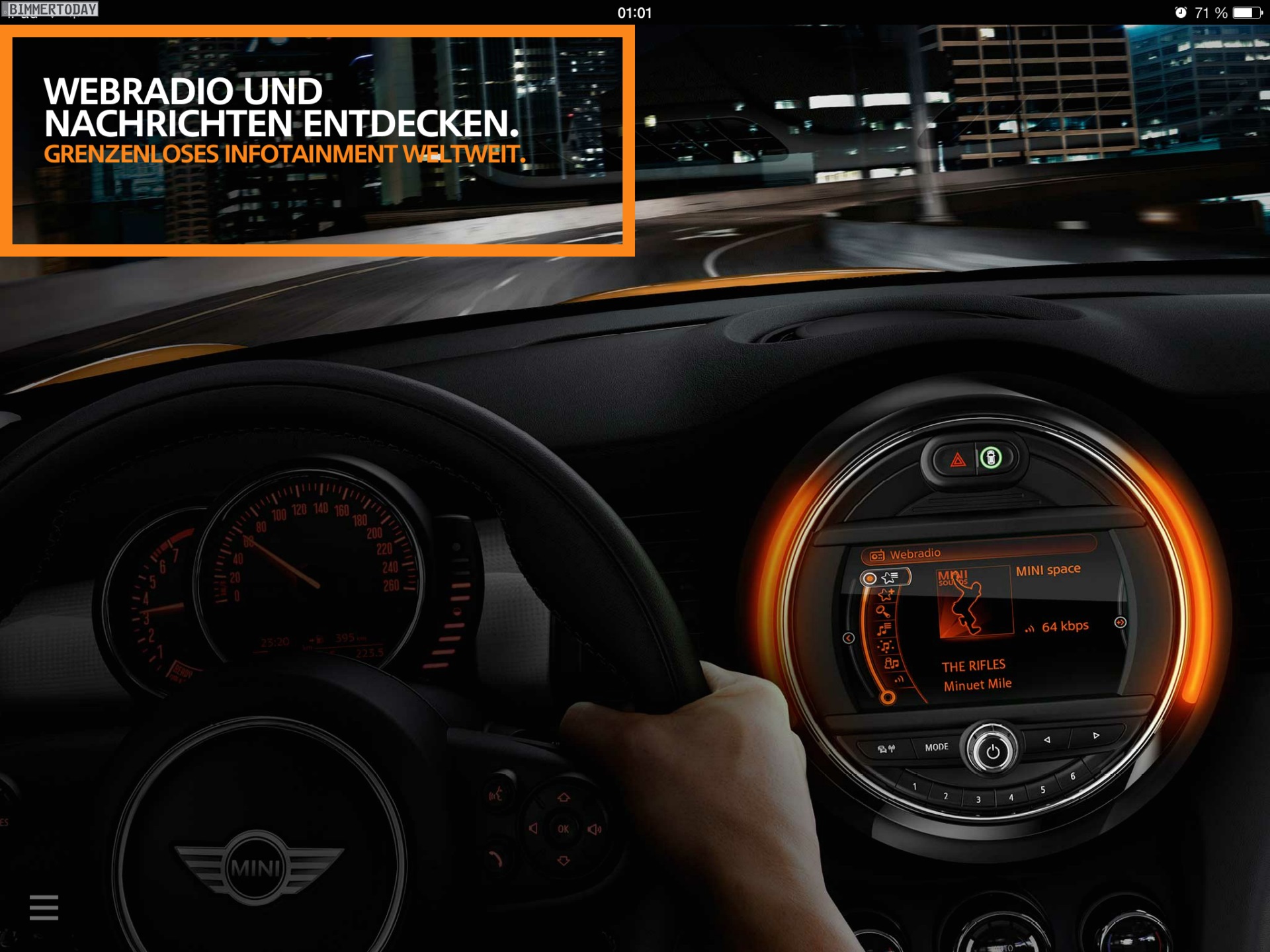Detaillierter als auf der normalen Website zeigt sich der MINI F56 in der eigens für ihn erstellten App, die sich speziell an die Besitzer von Tablets richtet. Einer unserer Leser hat uns mit Screenshots versorgt, die einige Seiten der iPad App zum MINI F56 zeigen und dabei die farbige LED-Technik rund um das zentrale Infotainment-Display in den Fokus rücken.