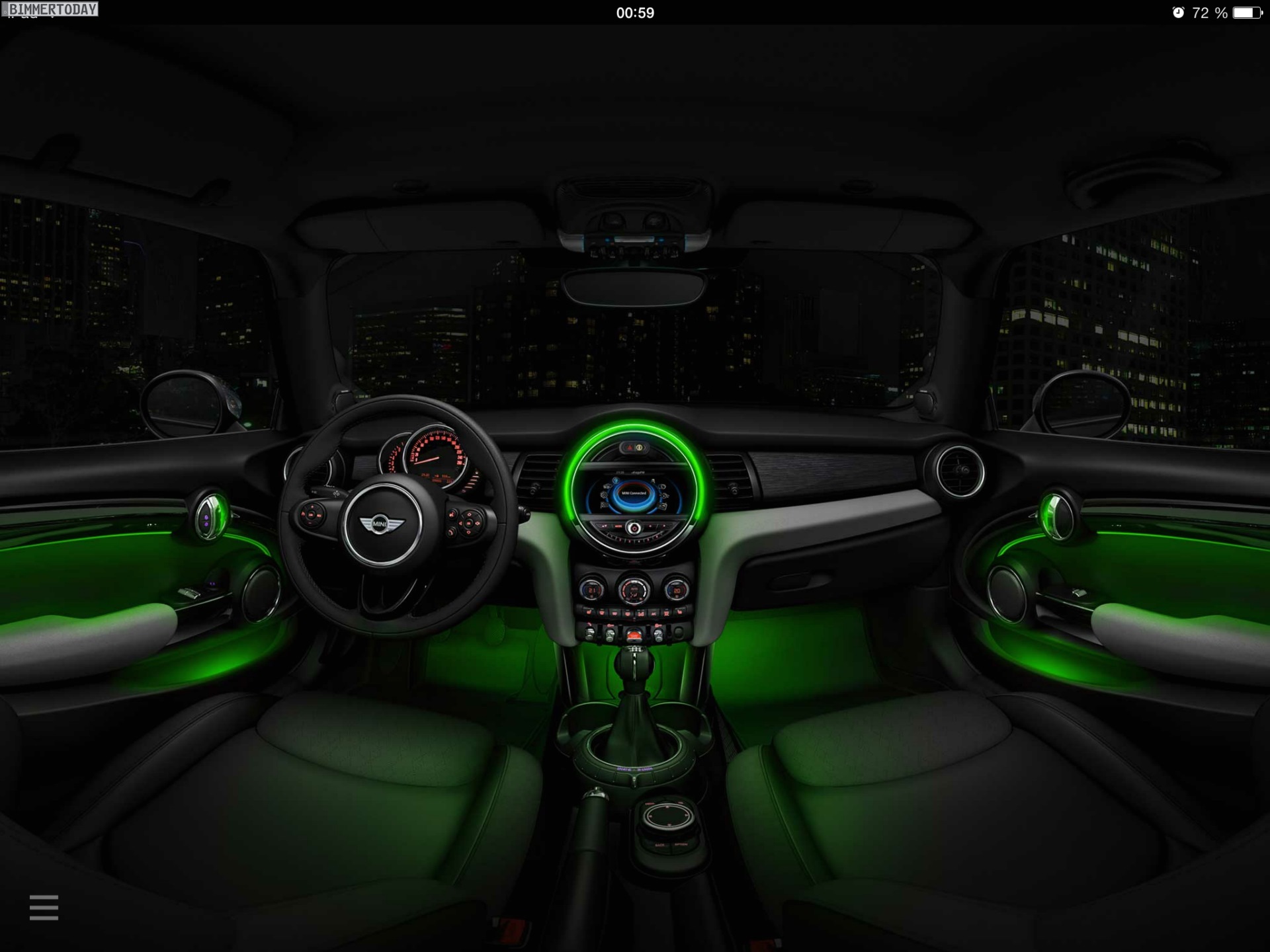 Auswirkungen auf die Licht-Stimmung an Bord des neuen MINI Cooper 2014 haben auch die Driving Modes Green, Mid und Sport, die Lautstärkeregelung und natürlich das optionale Ambientelicht, das nun noch stärker für die gewünschte Farb-Atmosphäre sorgt als im Vorgänger.