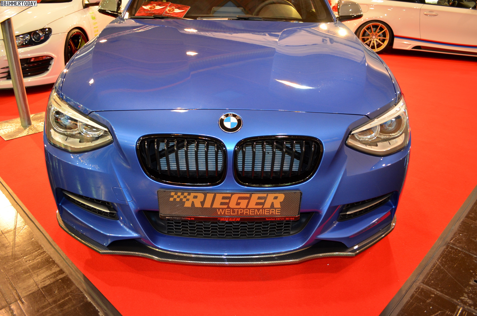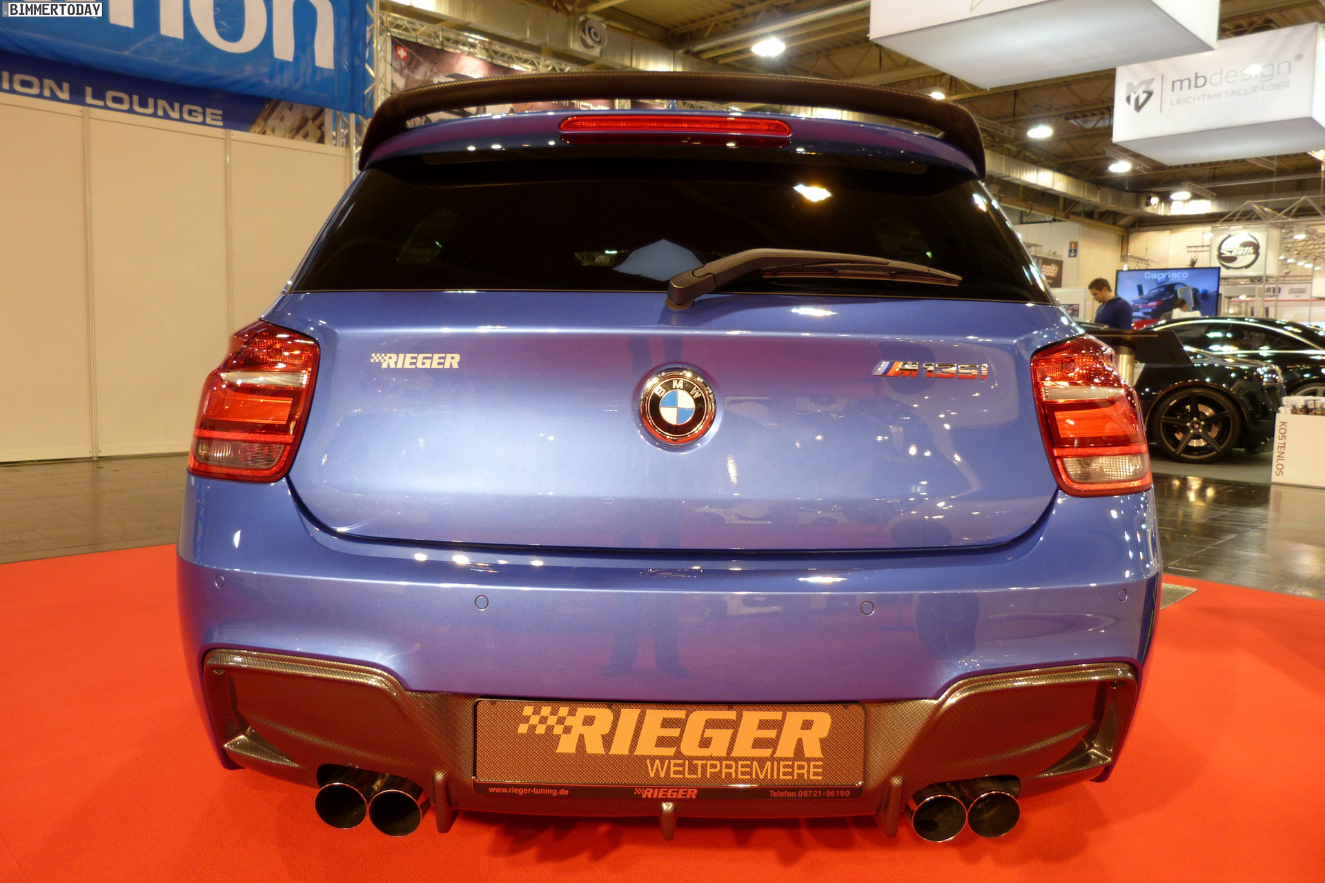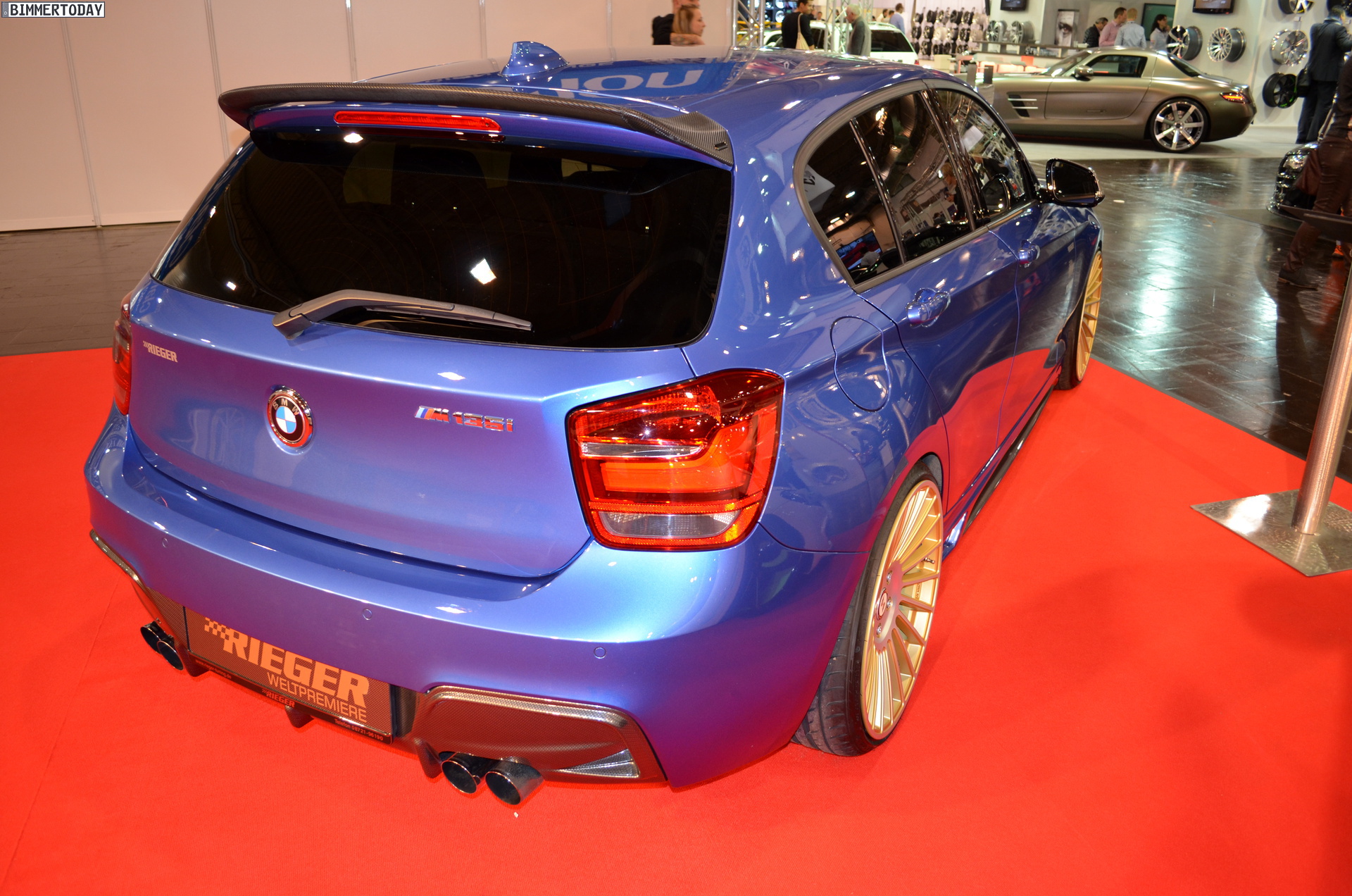 Am Stand von Rieger Tuning auf der Essen Motor Show 2013 glänzt neben einer ganzen Reihe von Fahrzeugen anderer Hersteller auch ein BMW M135i F20 mit einer Lackierung in Estorilblau. Auffällig sind unter anderem der Carbon-Splitter-Aufsatz an der Frontschürze, der Carbon-Heckspoiler, der Diffusor-Einsatz für die Heckschürze und natürlich die Felgen, wobei auf beiden Seiten des Fahrzeugs andere Varianten verbaut sind.