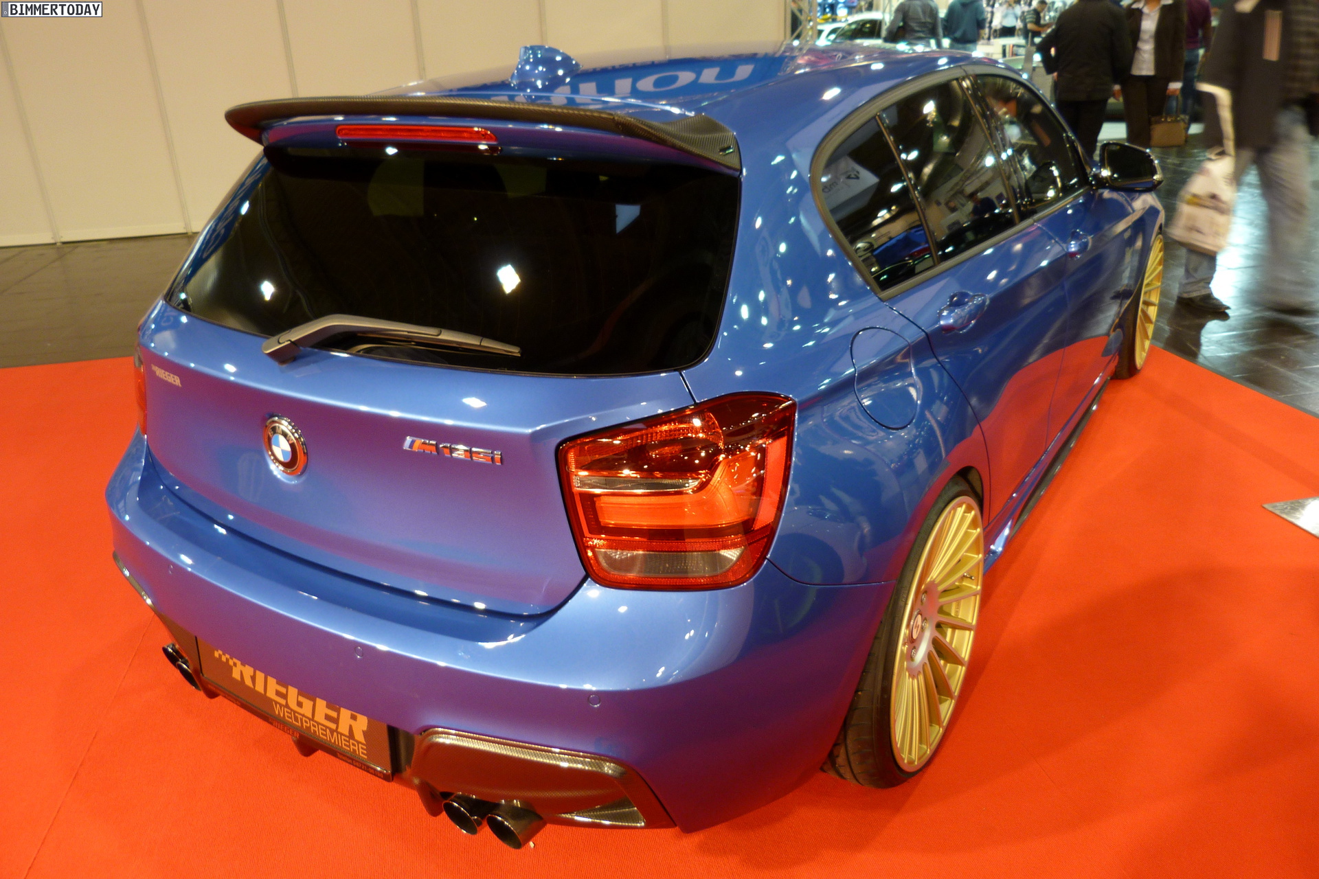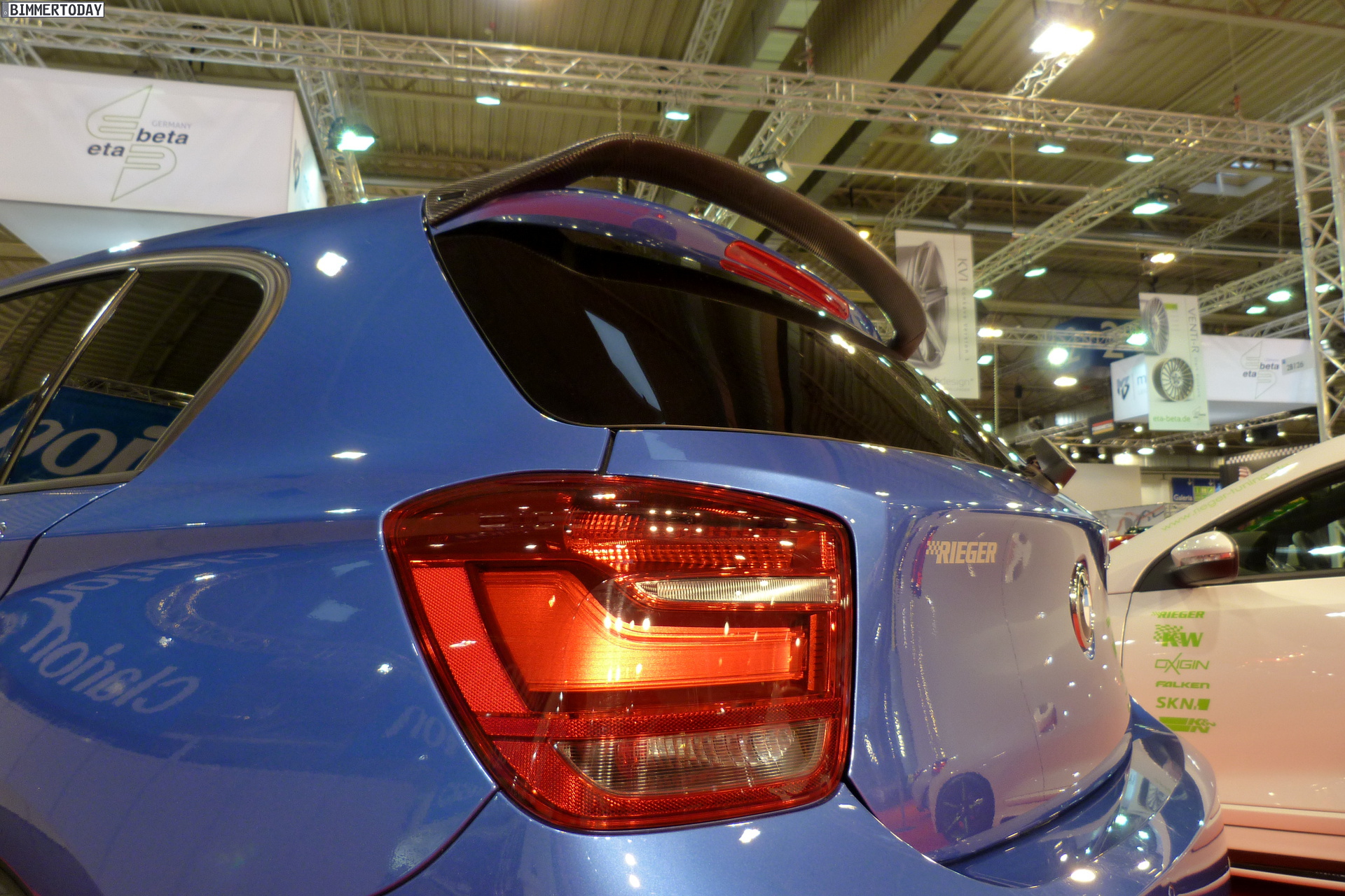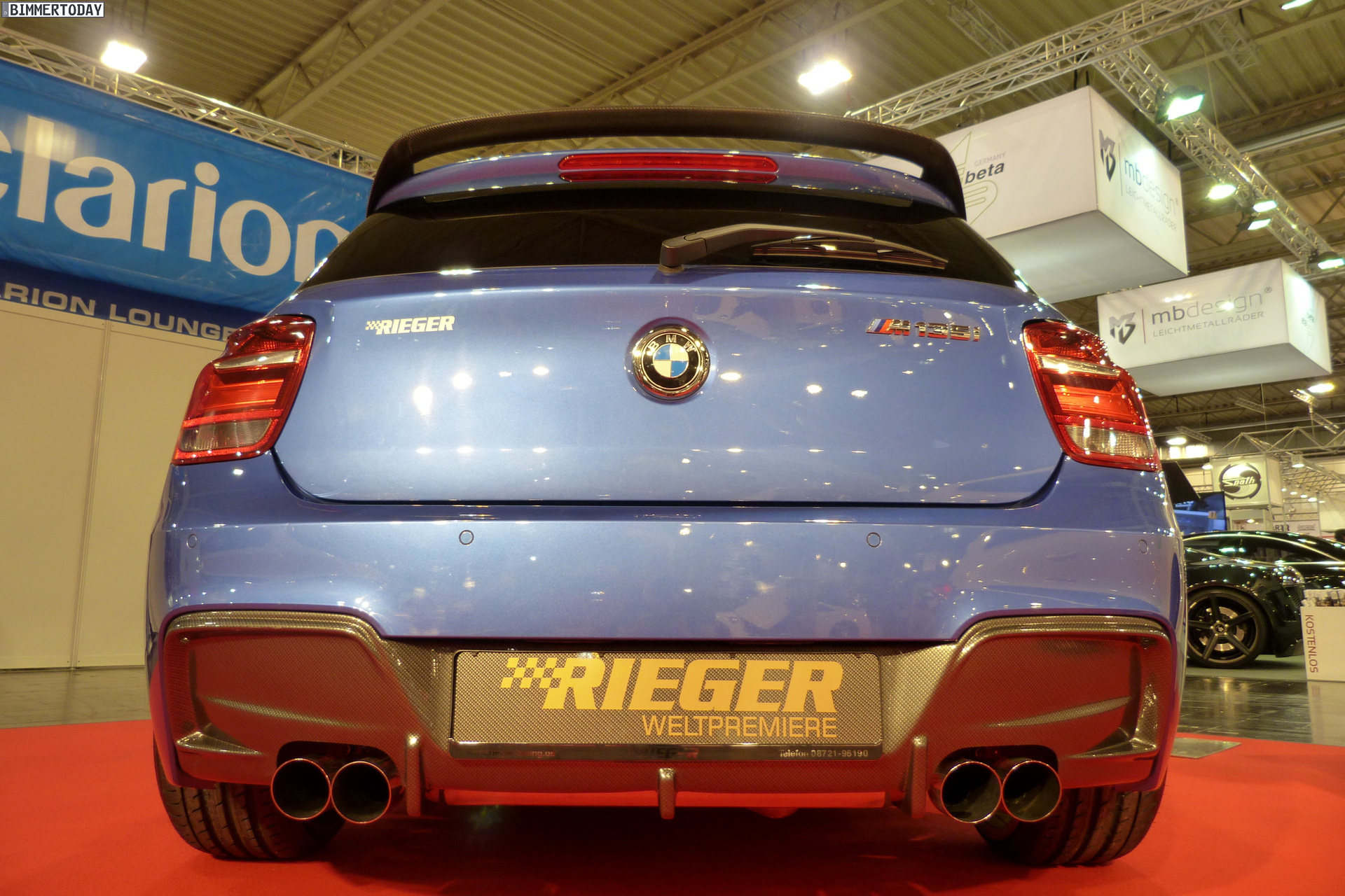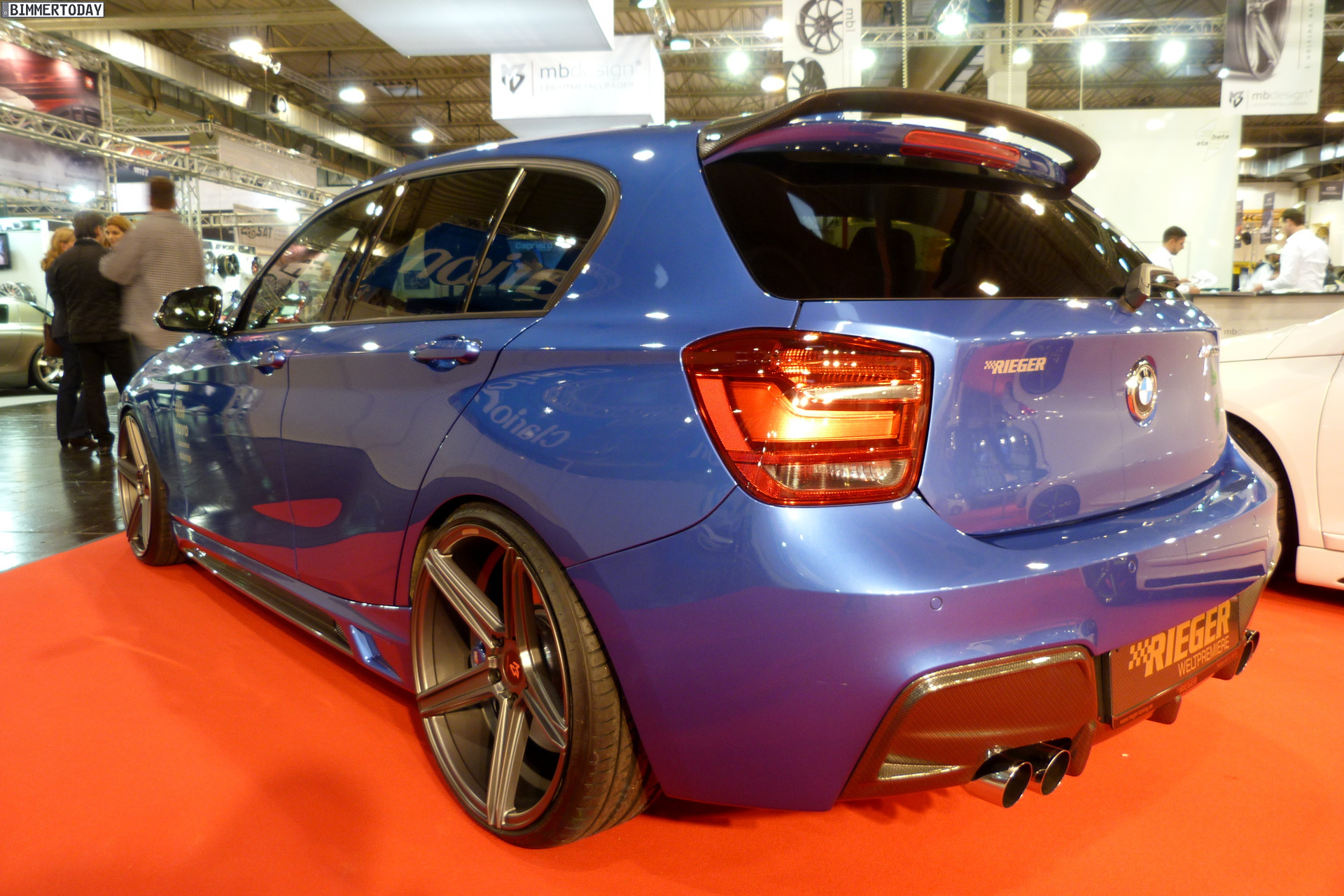 Am Stand von Rieger Tuning auf der Essen Motor Show 2013 glänzt neben einer ganzen Reihe von Fahrzeugen anderer Hersteller auch ein BMW M135i F20 mit einer Lackierung in Estorilblau. Auffällig sind unter anderem der Carbon-Splitter-Aufsatz an der Frontschürze, der Carbon-Heckspoiler, der Diffusor-Einsatz für die Heckschürze und natürlich die Felgen, wobei auf beiden Seiten des Fahrzeugs andere Varianten verbaut sind.
