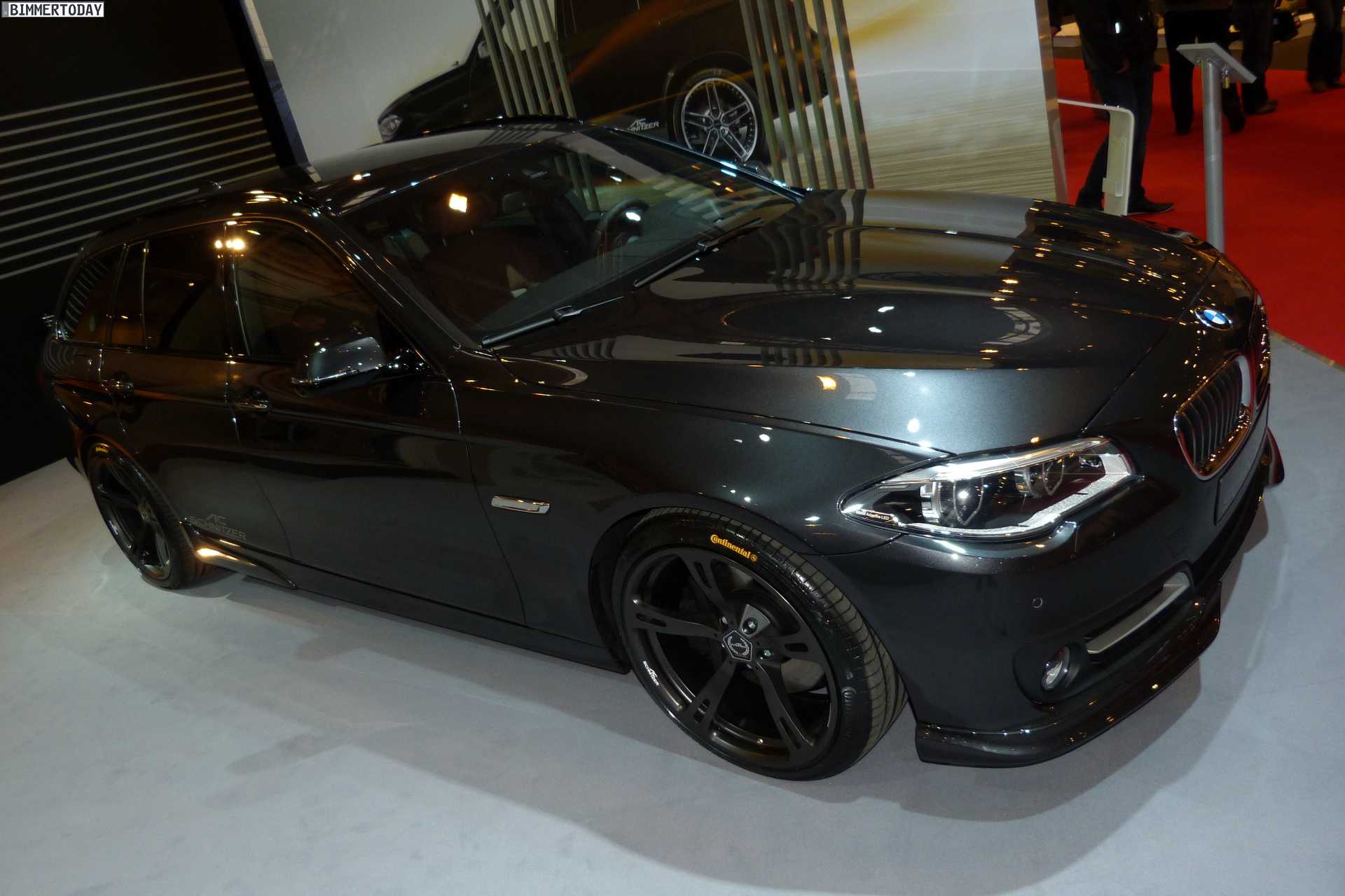 Der gezeigte BMW 535d Touring kommt ohne Modern oder Luxury Line, trägt aber Frontschürzen-Aufsatz, Seitenschweller, Dachheckspoiler, Diffusor-Einsatz, Abgasanlage und natürlich Felgen aus Aachen: