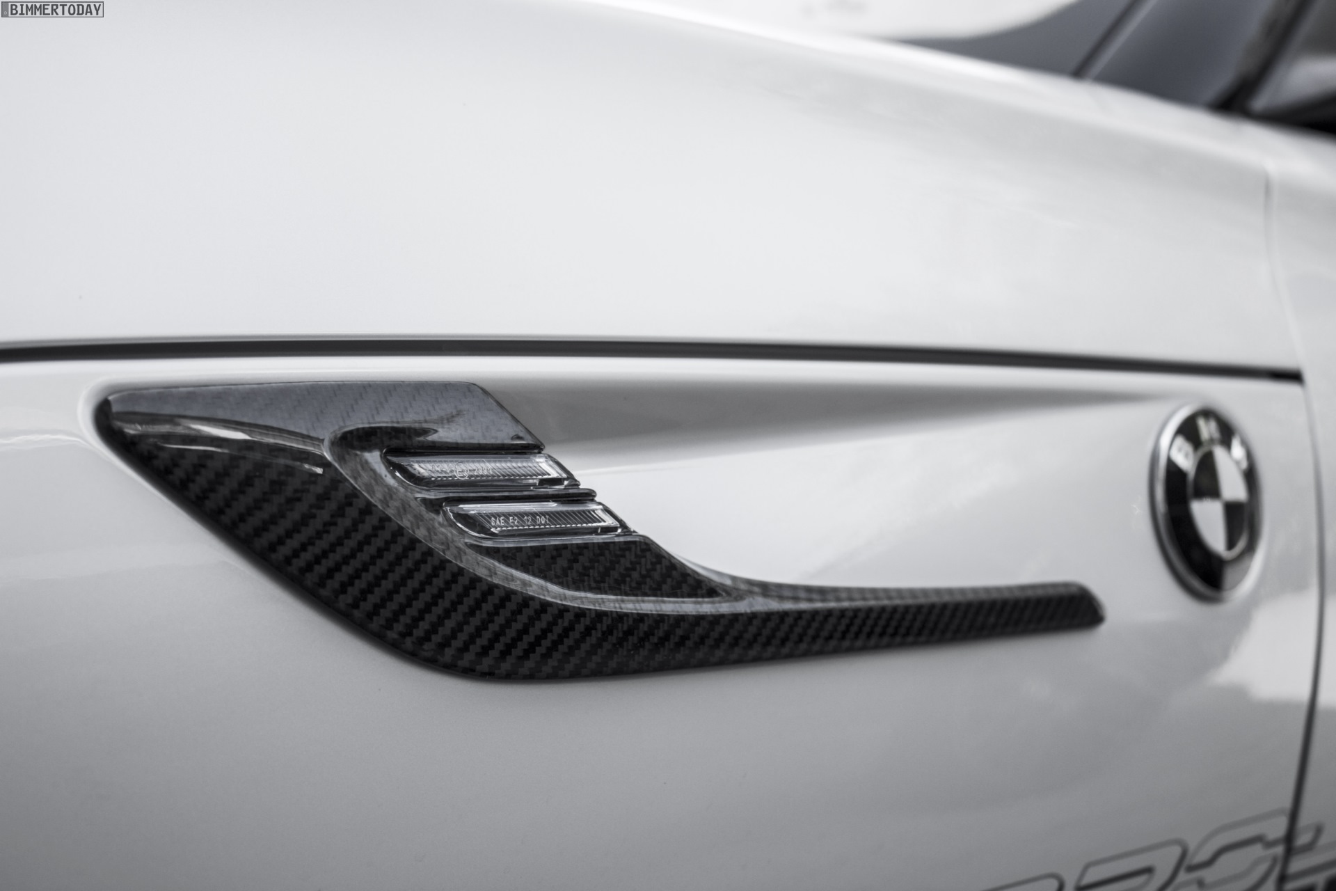 Neben den Nieren und Außenspiegeln trägt das in Mineralweiß Metallic lackierte Vorstellungsfahrzeug auch eine Carbon-Spoilerlippe vorn und hinten, Seitenschweller, Diffusor und neue Kiemen mit integrierten Blinkern.