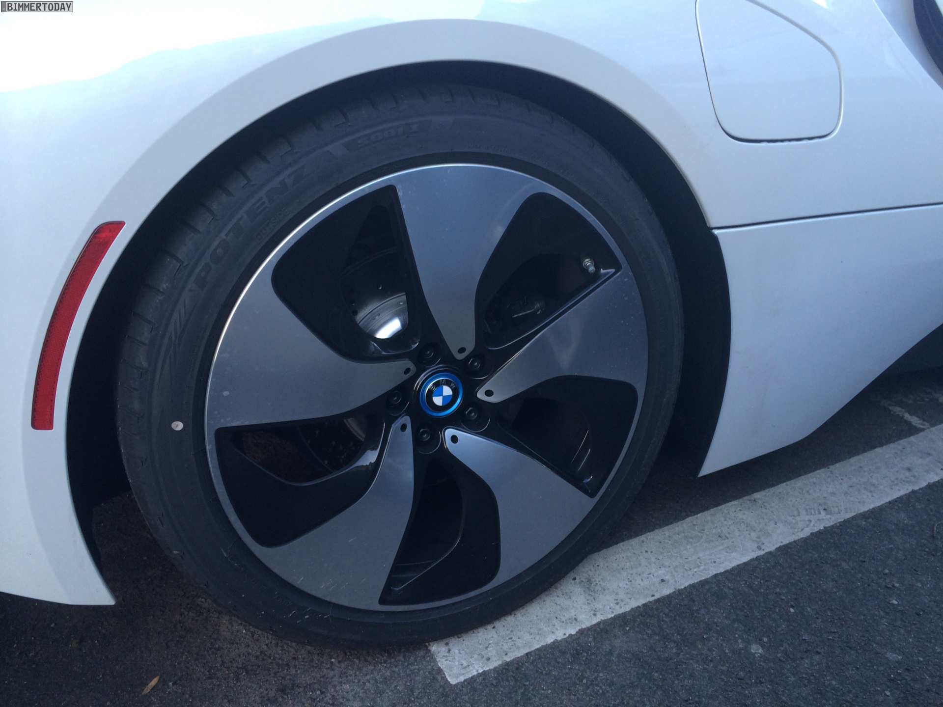Die neuesten Live-Fotos stammen von unserem Leser Micha, der ein weißes Exemplar des BMW i8 in Leipzig erwischt hat. Der offenbar weitestgehend serienmäßige Versuchsträger glänzt in Crystal White und verfügt zudem über die Akzente in BMW i Blau. Wir sehen außerdem die zweifarbig gestalteten und 20 Zoll großen Leichtmetallräder Turbinenstyling 444 – eine von zunächst drei ab Werk erhätlichen Felgen.