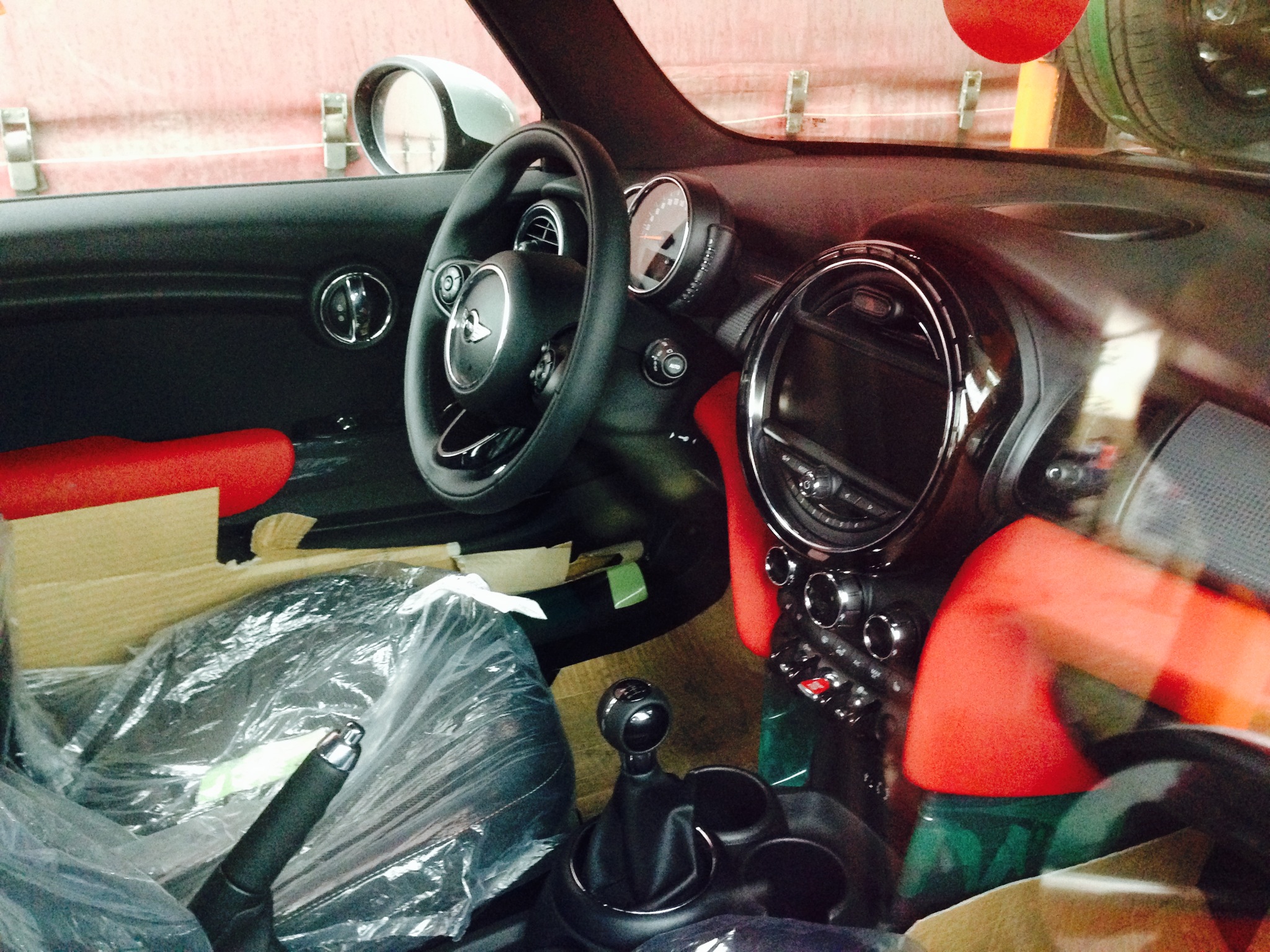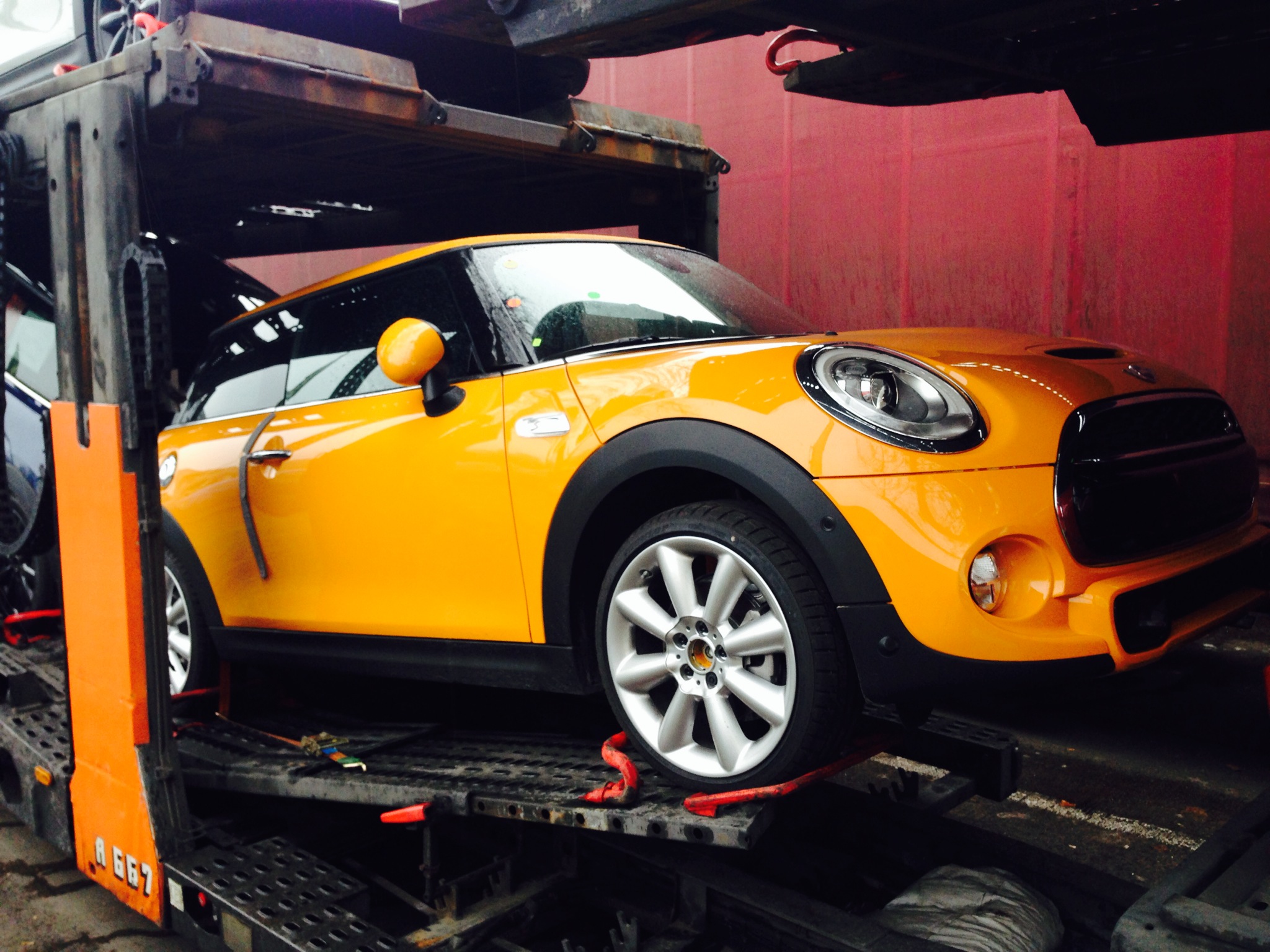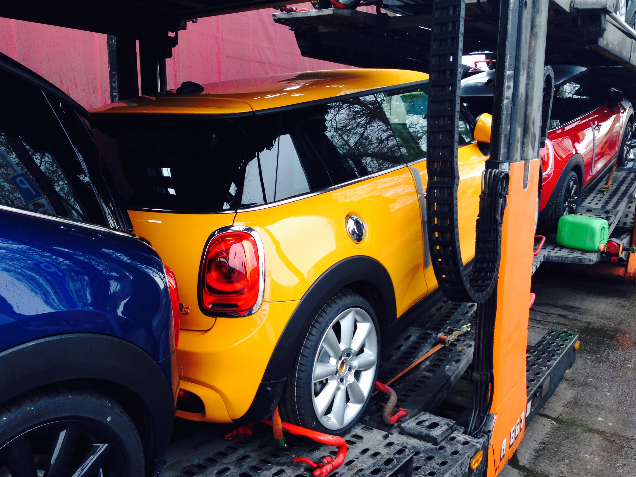Da die Ladung des Transporters ziemlich farbenfroh ist, bekommen wir außerdem auch Eindrücke von den neuen Farben Blazing Red und Volcano Orange, die wir bisher nur auf Pressebildern bei Tageslicht zu Gesicht bekamen. Steffi ist es zudem gelungen, ein Foto vom Innenraum eines roten MINI Cooper F56 zu machen – gut zu erkennen sind der neue Center Speedo mit großem Infotainment-Display, das Lenkrad und die Tacho-Einheit hinter selbigem.