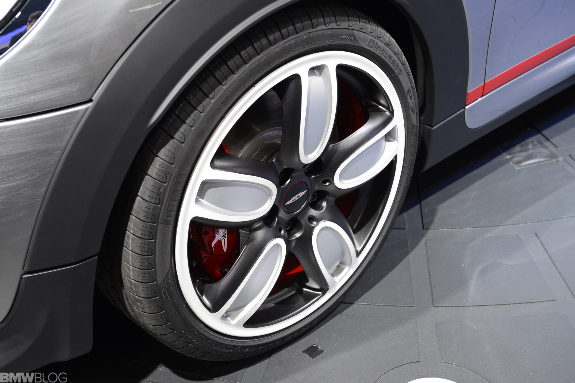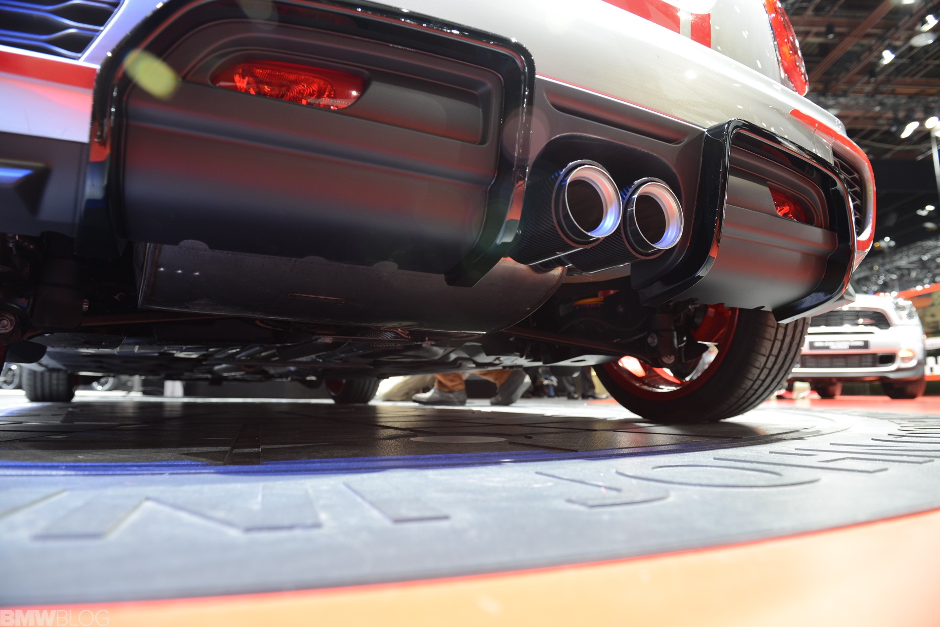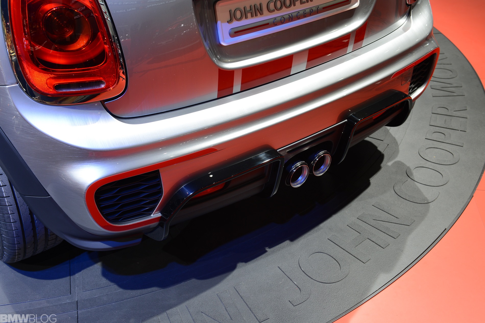 Optisch nutzt auch der neue MINI John Cooper Works F56 die typischen Erkennungszeichen der kleinen Topmodelle: Dach, Außenspiegel und Bonnet Stripes glänzen in roter Kontrast-Lackierung, die beiden mittig platzierten Endrohre versprechen sportlichen Sound und das John Cooper Works-Logo kann kaum häufig genug auftauchen. Die seriennahe Studie bietet zudem rote Akzente an der aggressiv gestalteten Frontschürze, den Seitenschwellern und der Heckschürze.