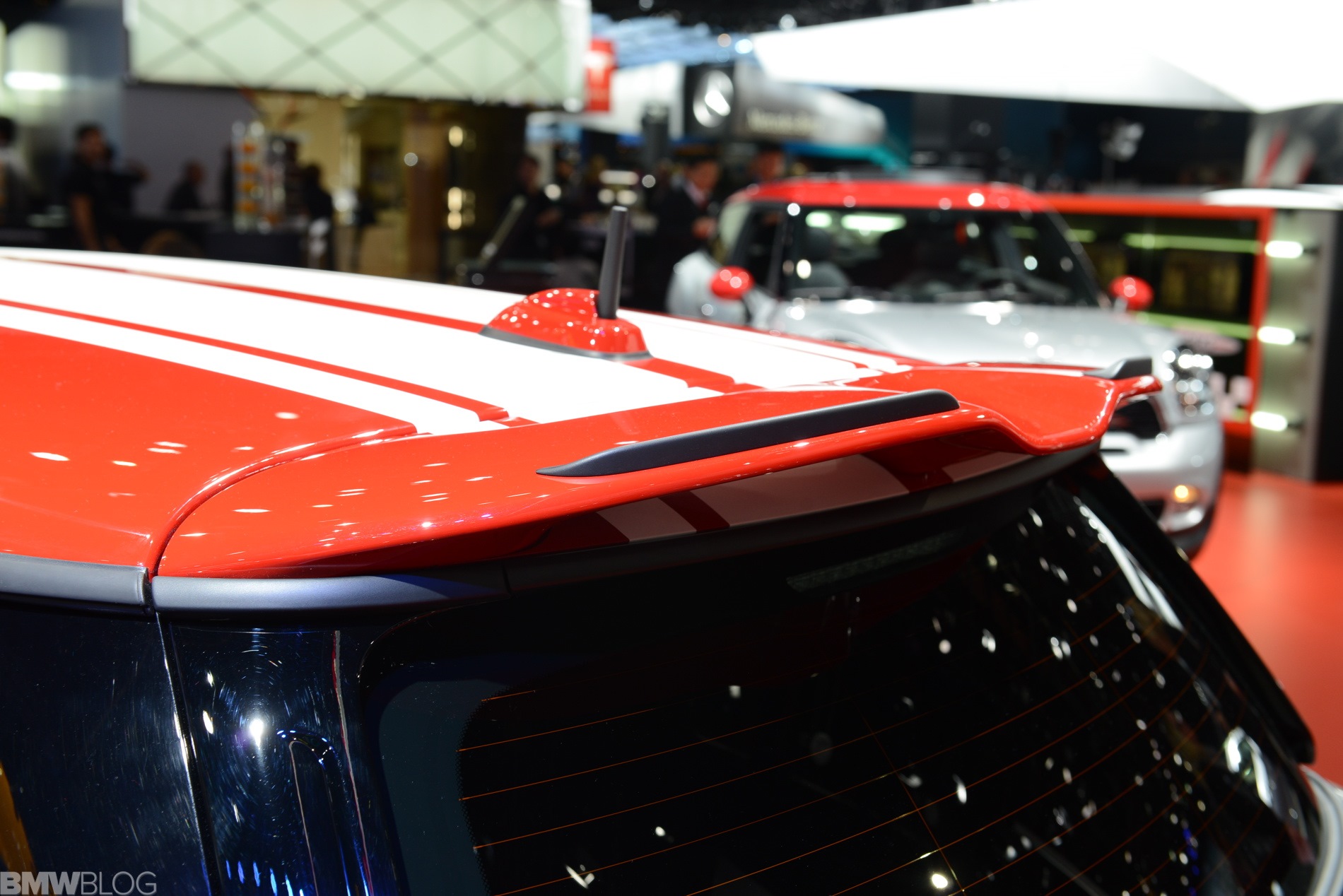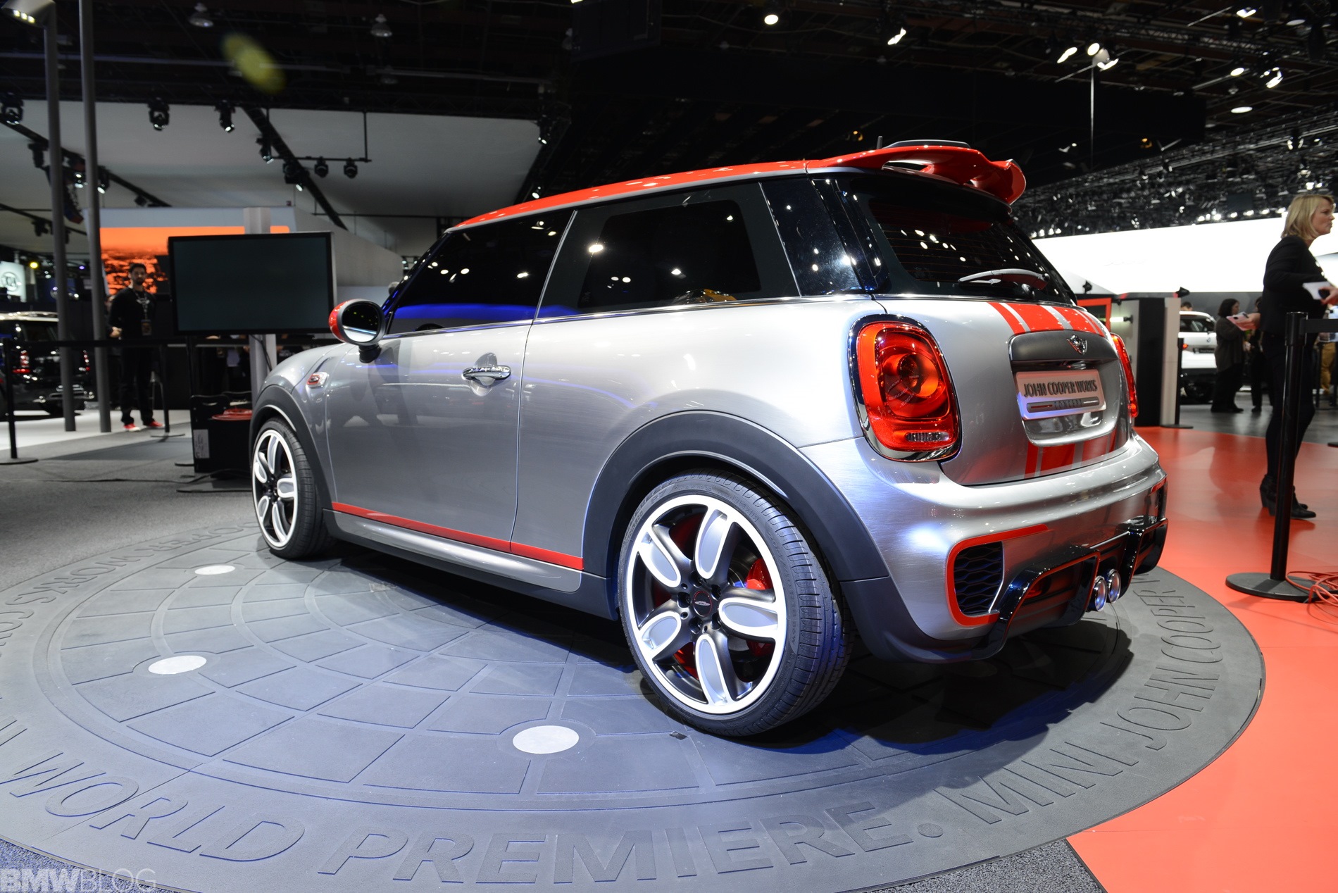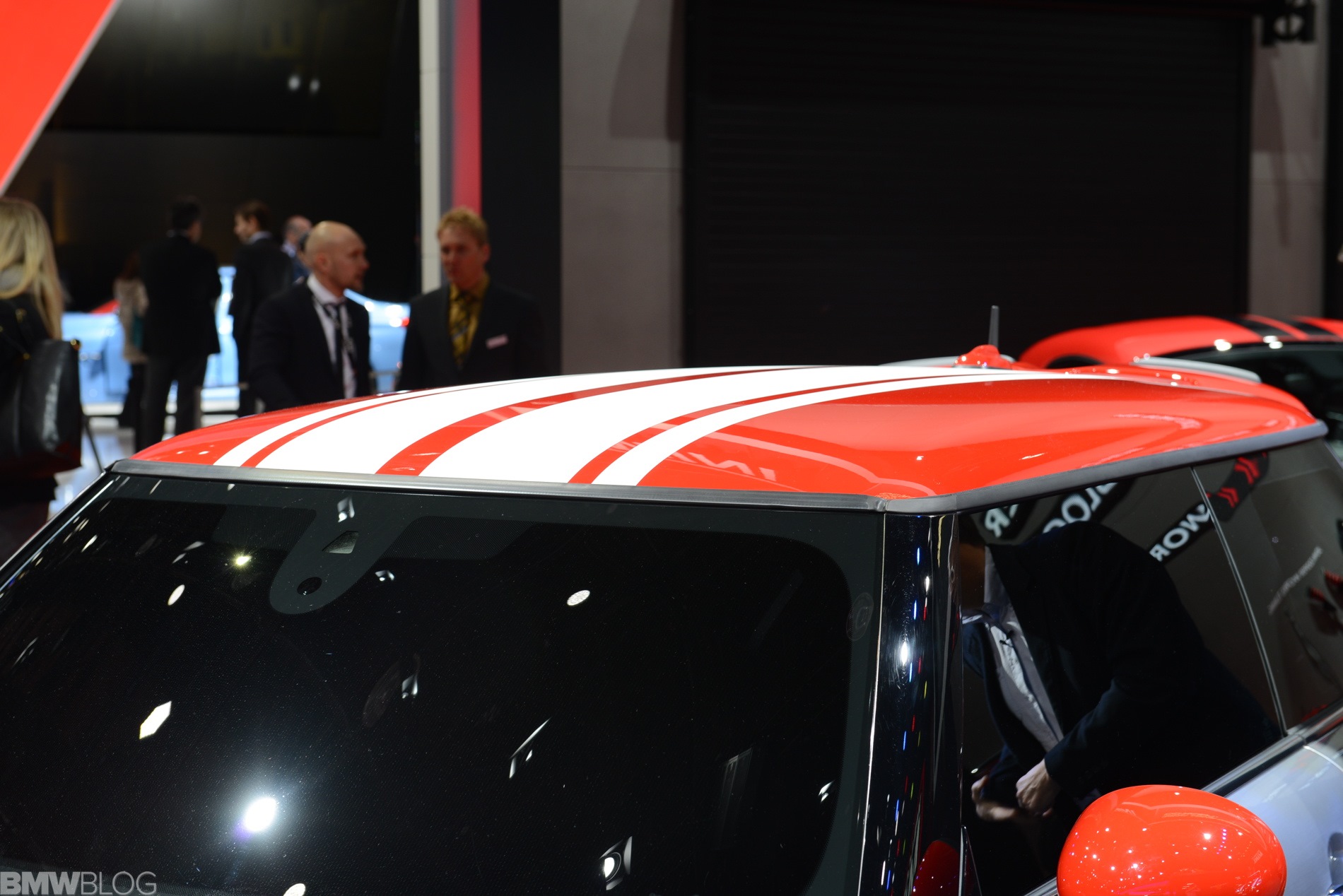 Optisch nutzt auch der neue MINI John Cooper Works F56 die typischen Erkennungszeichen der kleinen Topmodelle: Dach, Außenspiegel und Bonnet Stripes glänzen in roter Kontrast-Lackierung, die beiden mittig platzierten Endrohre versprechen sportlichen Sound und das John Cooper Works-Logo kann kaum häufig genug auftauchen. Die seriennahe Studie bietet zudem rote Akzente an der aggressiv gestalteten Frontschürze, den Seitenschwellern und der Heckschürze.