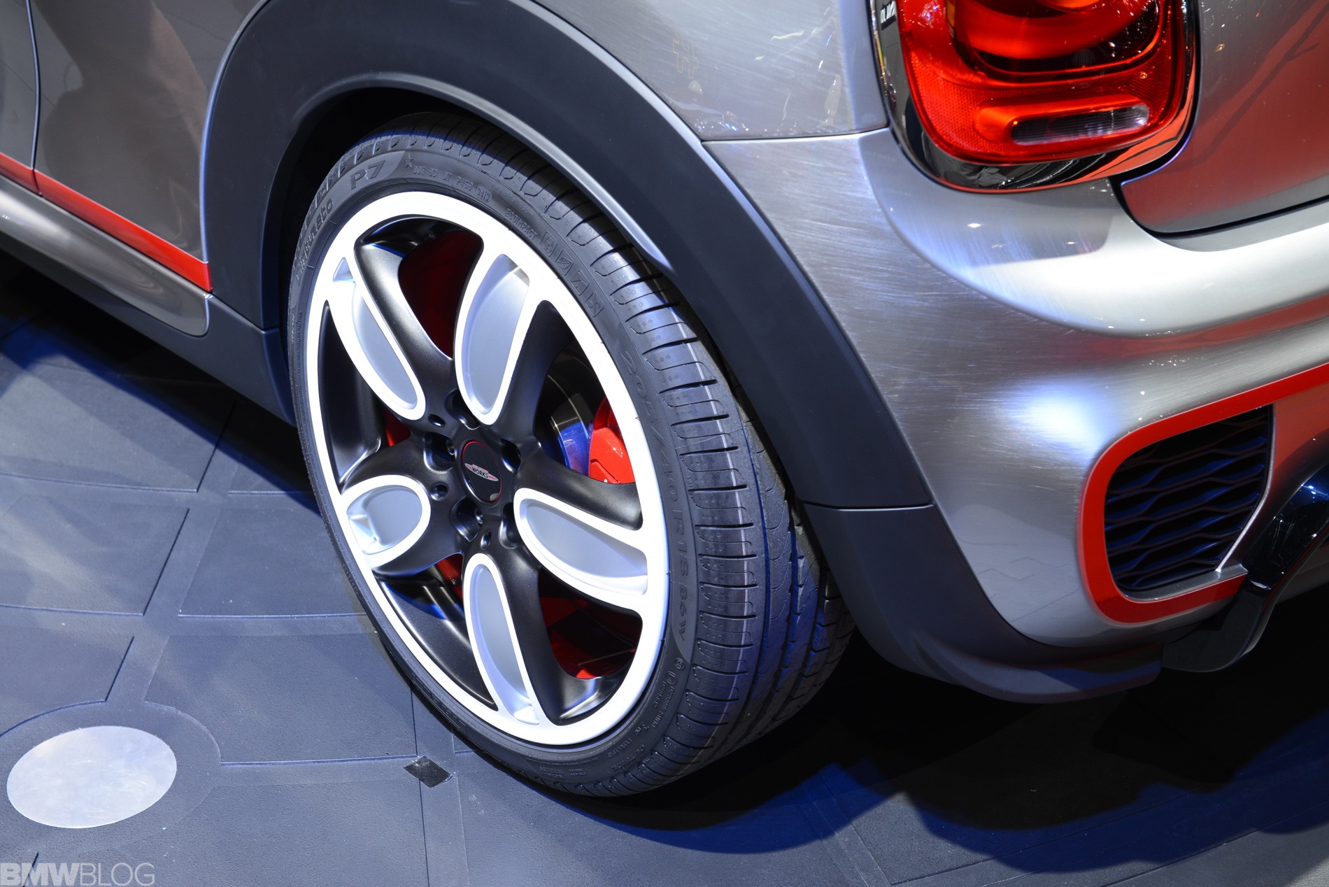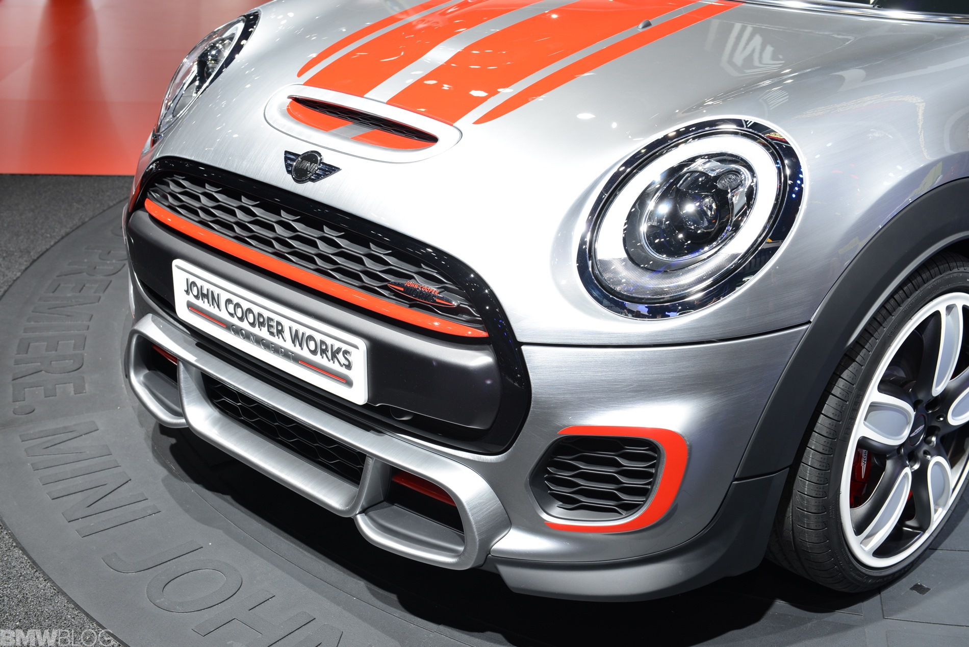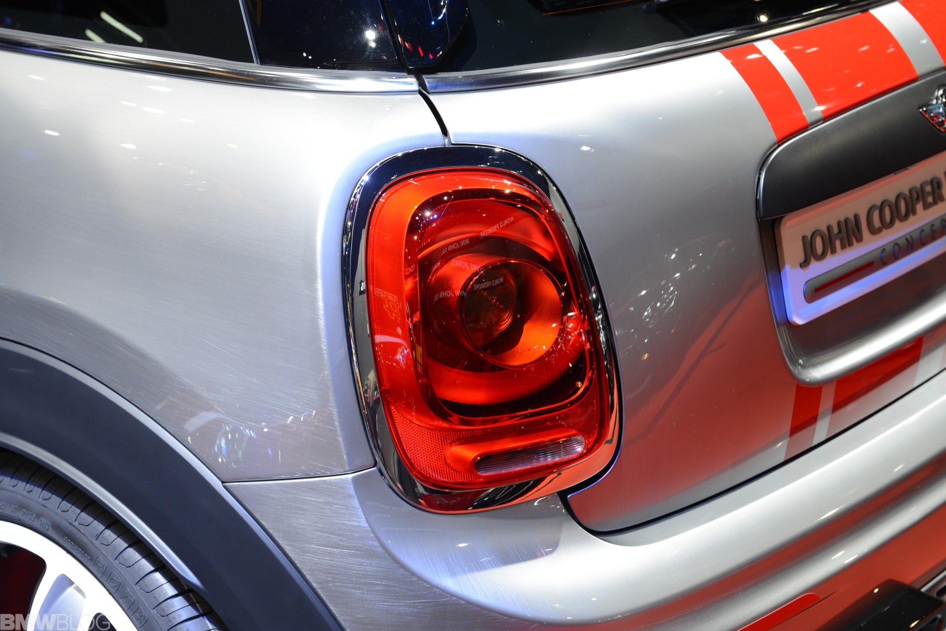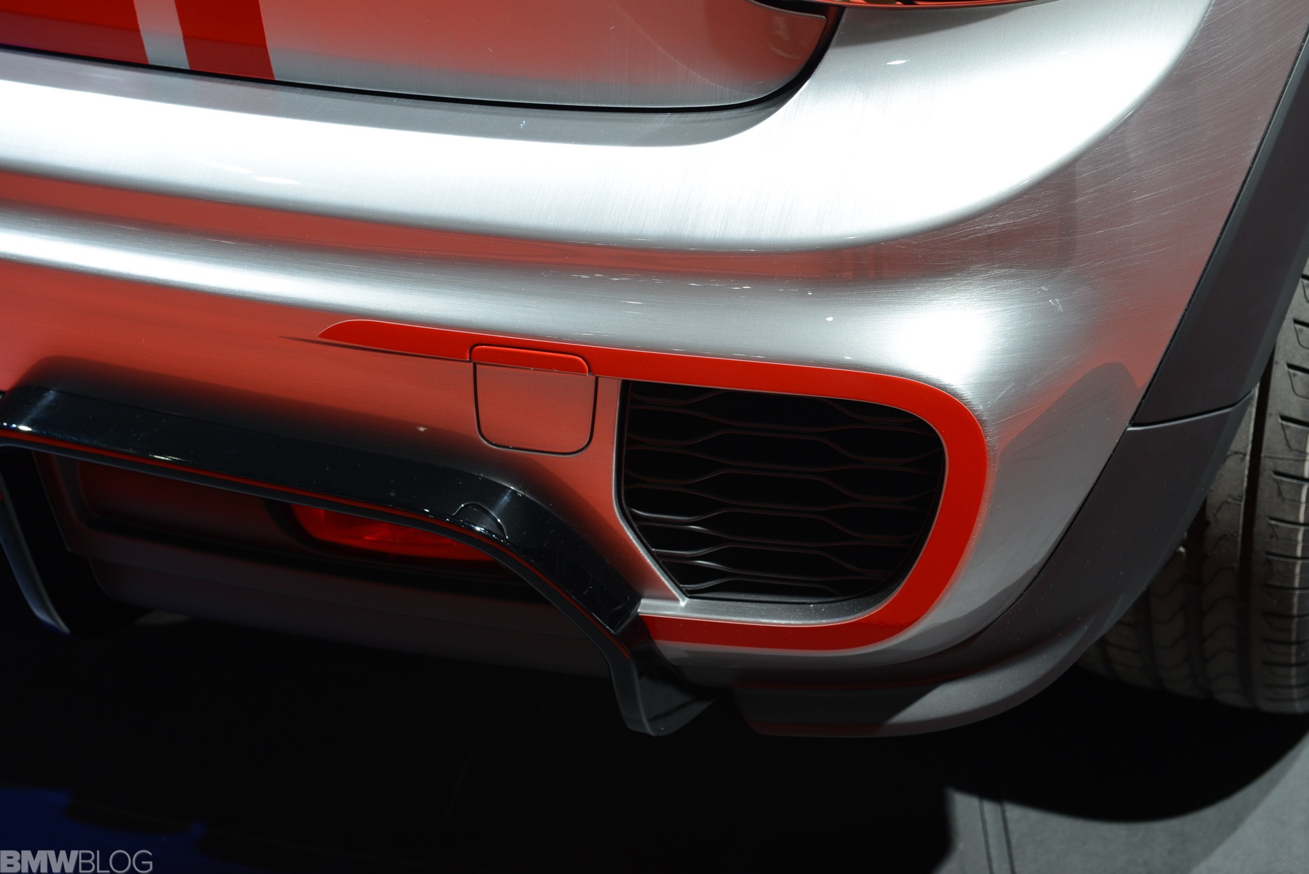 Eigentliches Highlight des Concept Cars für die NAIAS 2014 ist aber die Lackierung in Bright Highways Grey. Eine handgeschliffene Oberfläche mit starker Strukturierung wird von einer Klarlack-Deckschicht überzogen und erzeugt aus der Nähe betrachtet den Eindruck einer geschliffenen Aluminium-Oberfläche. Außerdem trägt die Studie die für alle F56 optional erhältlichen Voll-LED-Scheinwerfer.