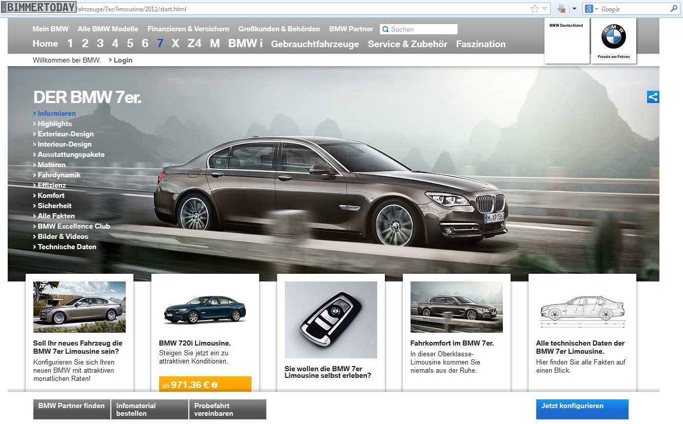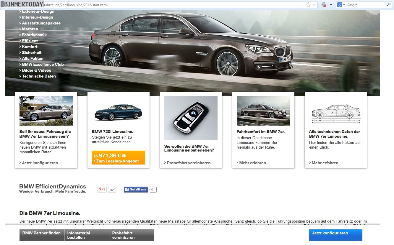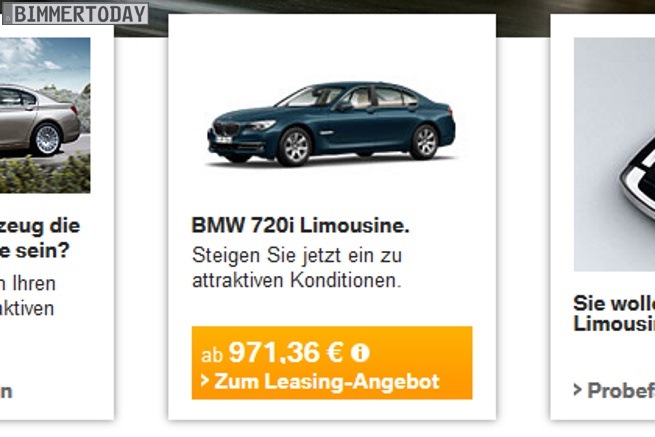 Was für ein Schock für manchen BMW-Fan: Wer in den letzten Stunden auf BMW.de gegangen ist, kann mit etwas Glück ein unverbindliches Leasing-Angebot für eine vermeintliche BMW 720i Limousine erhalten. In einem kleinen Fenster unterhalb der gewöhnlichen Informationen zur 7er-Reihe werden immer wieder verschiedene Fahrzeuge angeboten, wobei mit etwas Zufall der BMW 720i F01 angezeigt wird.