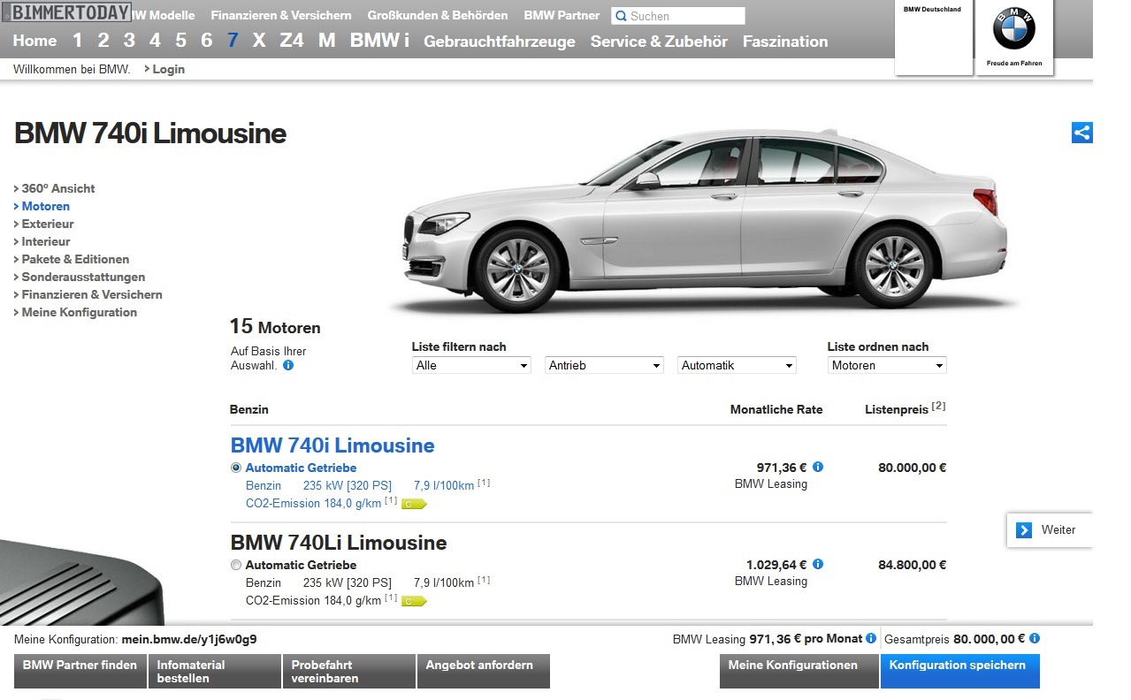 Wer den Link zum vermeintlichen BMW 720i anklickt, landet im gewöhnlichen Konfigurator und erhält erwartungsgemäß keine weiteren Informationen zum 720i. Wer den Konfigurator betrachtet, sieht allerdings folgendes: Der BMW 740i wird mit einem Leasing-Preis ab 971,36 Euro angezeigt – genau jener Preis, der auch für den angeblichen BMW 720i angezeigt wird.