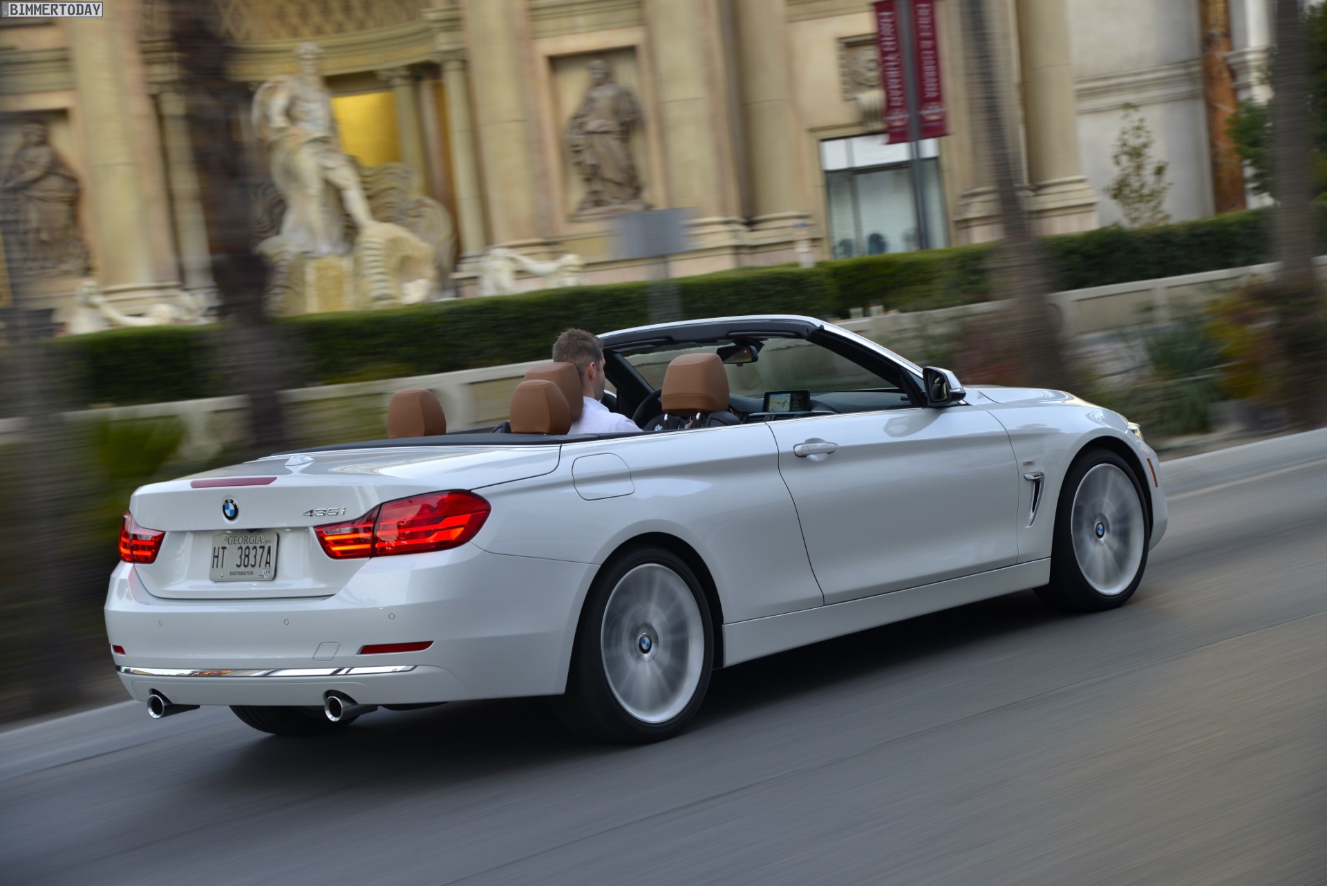Wer es edel und zugleich sportlich mag, könnte mit der von uns in Las Vegas gefahrenen Konfiguration des BMW 4er Cabrio F33 wirklich glücklich werden. Die Lackierung in Mineralweiß Metallic unterstreicht die gelungenen Proportionen ebenso wie die feinen Design-Details, dazu kommen die Chrom-Elemente der Luxury Line und der bei geöffnetem Dach auch von außen wichtige Beitrag der braunen Leder-Ausstattung im Innenraum. Die 19 Zoll großen Leichtmetallräder Vielspeiche 399 runden den eleganten Auftritt ab.