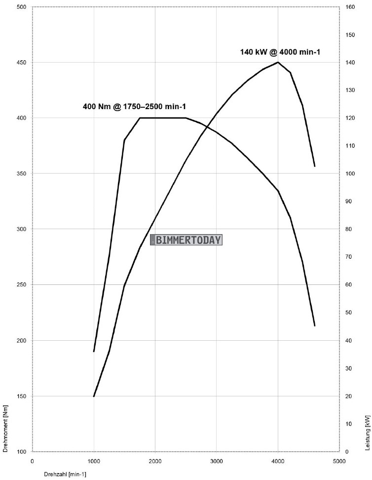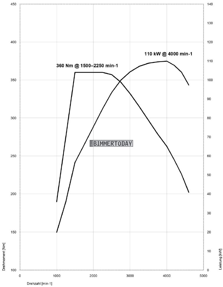 Während der N47 in den als x18d und x20d verkauften Ausbaustufen 143 und 184 PS leistete, bietet der neue B47 150 und 190 PS. Das maximale Drehmoment bleibt im Fall der 150 PS-Ausbaustufe bei 360 Newtonmeter, es liegt nun aber zwischen 1.500 und 2.250 U/min an (bisher: 1.750 – 2.500). Bei der stärkeren Ausbaustufe klettert das maximale Drehmoment von 380 auf 400 Newtonmeter, das Maximum steht aber künftig “nur noch” zwischen 1.750 und 2.250 U/min zur Verfügung (bisher: 380 Nm zwischen 1.750 und 2.750 U/min).