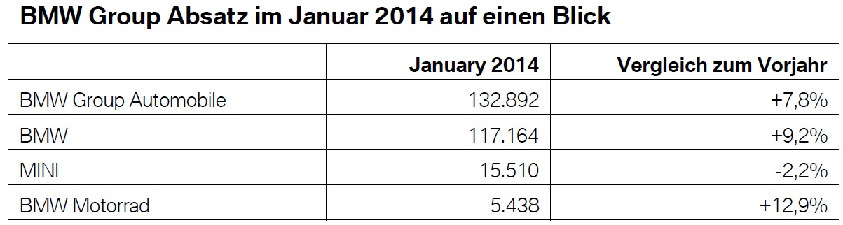Mit einem neuen Rekord-Monat ist die BMW Group in das Jahr 2014 gestartet! Im Januar 2014 wurden weltweit 132.892 Fahrzeuge der Marken BMW, MINI und Rolls-Royce verkauft, was einer Steigerung um 7,8 Prozent gegenüber dem Januar des Vorjahres entspricht. Wesentlichen Anteil am neuen Rekord hatte die Kernmarke BMW, die ihre Verkaufszahlen um 9,2 Prozent auf 117.164 Einheiten steigerte und damit ebenfalls einen neuen Rekordwert erzielen konnte.
